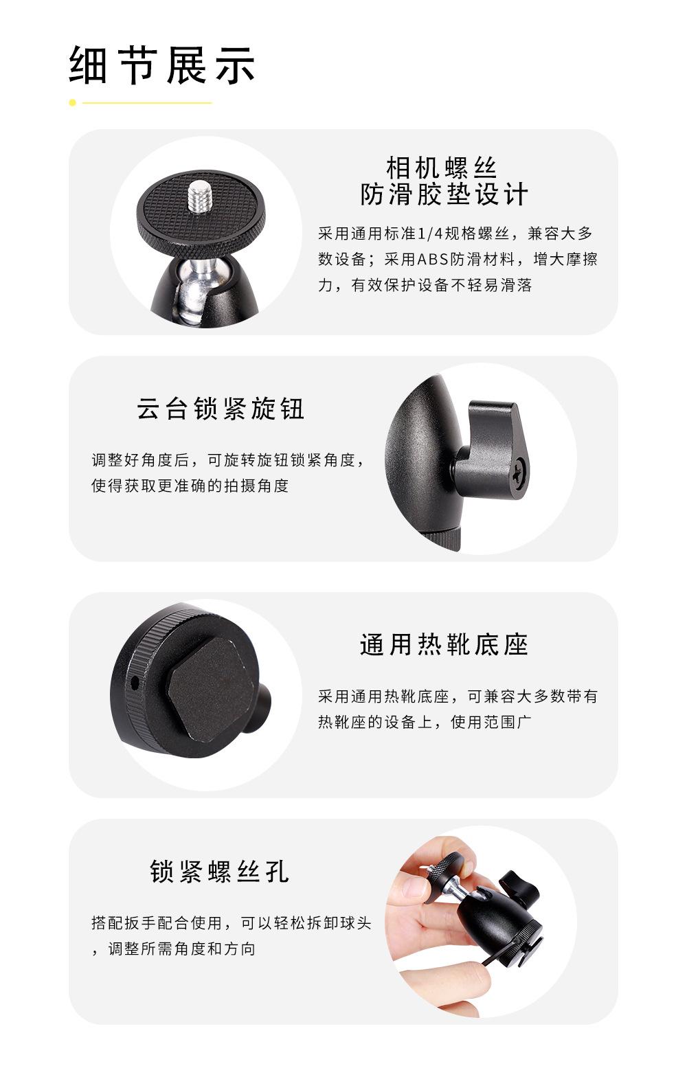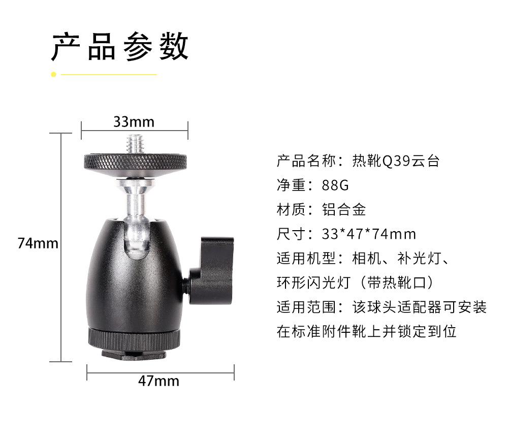 Hot shoe small head, Medium thick head, Hot shoe large head, Hot shoe card holder, Snail pan/tilt, Snail pan/t...
