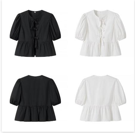 Primavera 2024 Nueva Ropa de Mujer Transfronteriza Europea y Americana Moda Urbana Algodón Lazo Cordones Camisa de Manga Corta 1821