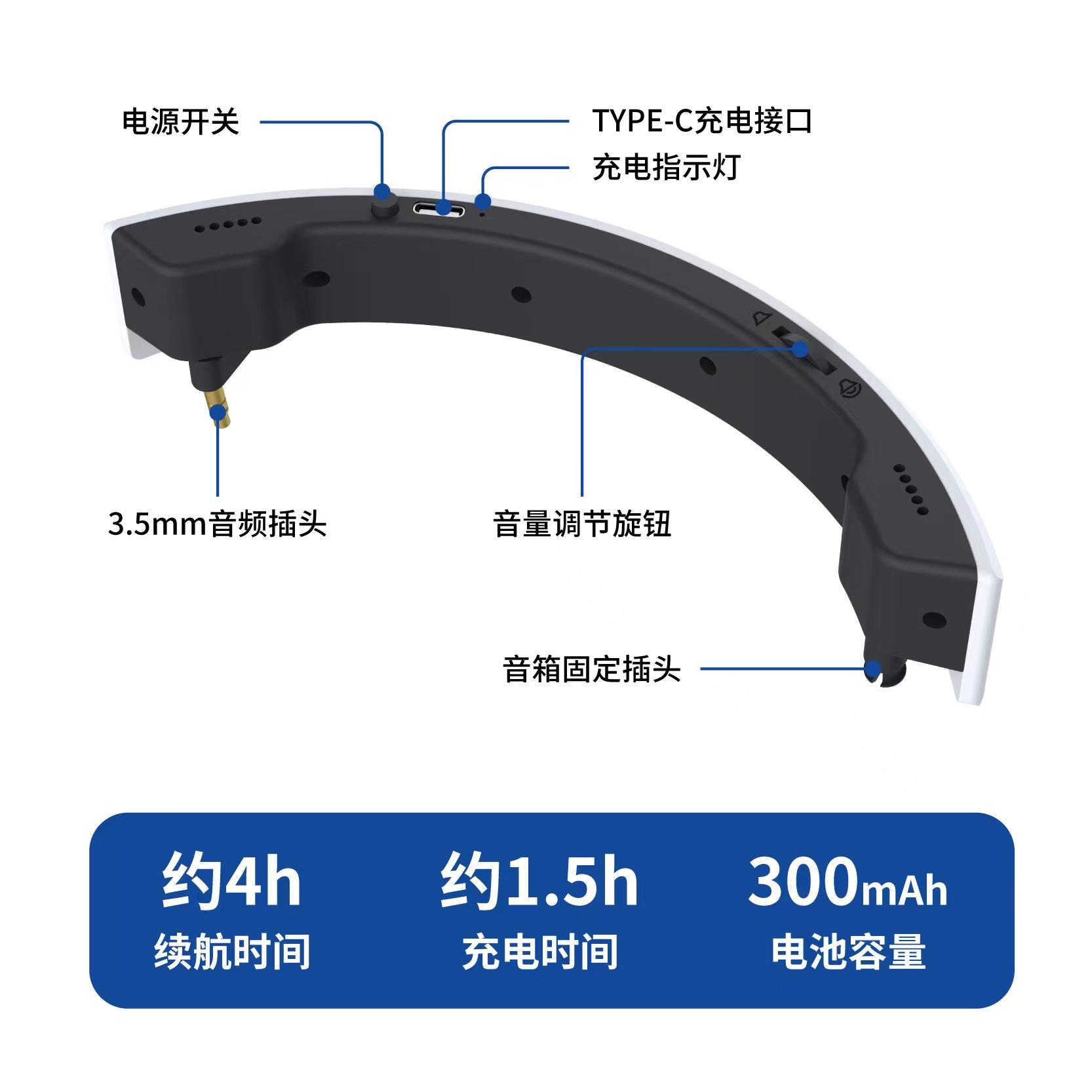Inserte el enchufe de audio de 3.5 mm del mini altavoz en el orificio correspondiente del visor PSVR2, y use la hebilla en el otro lado para conectar con éxito el mini altavoz. Presione el botón del interruptor de encendido para encender el altavoz. (Cuando el altavoz funciona normalmente, no hay luz indicadora; si el altavoz deja de funcionar, significa que la batería incorporada está baja y el altavoz necesita ser cargado).