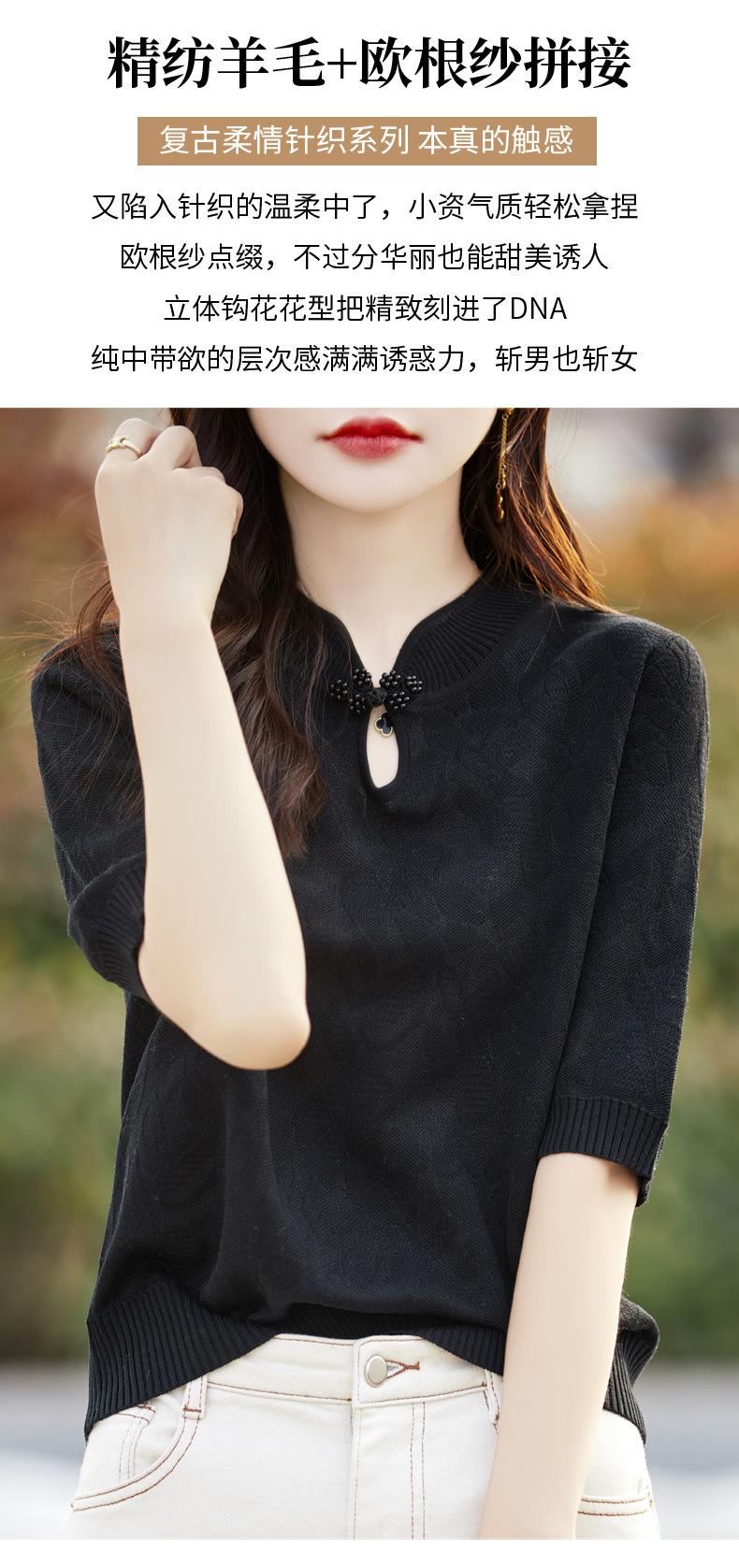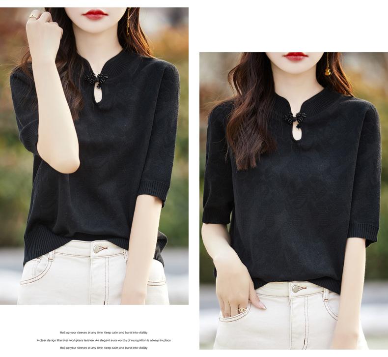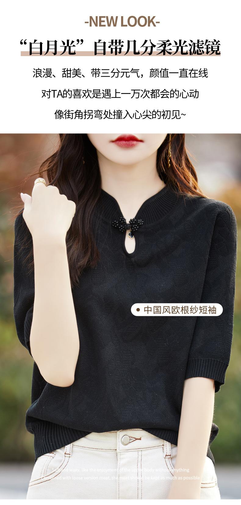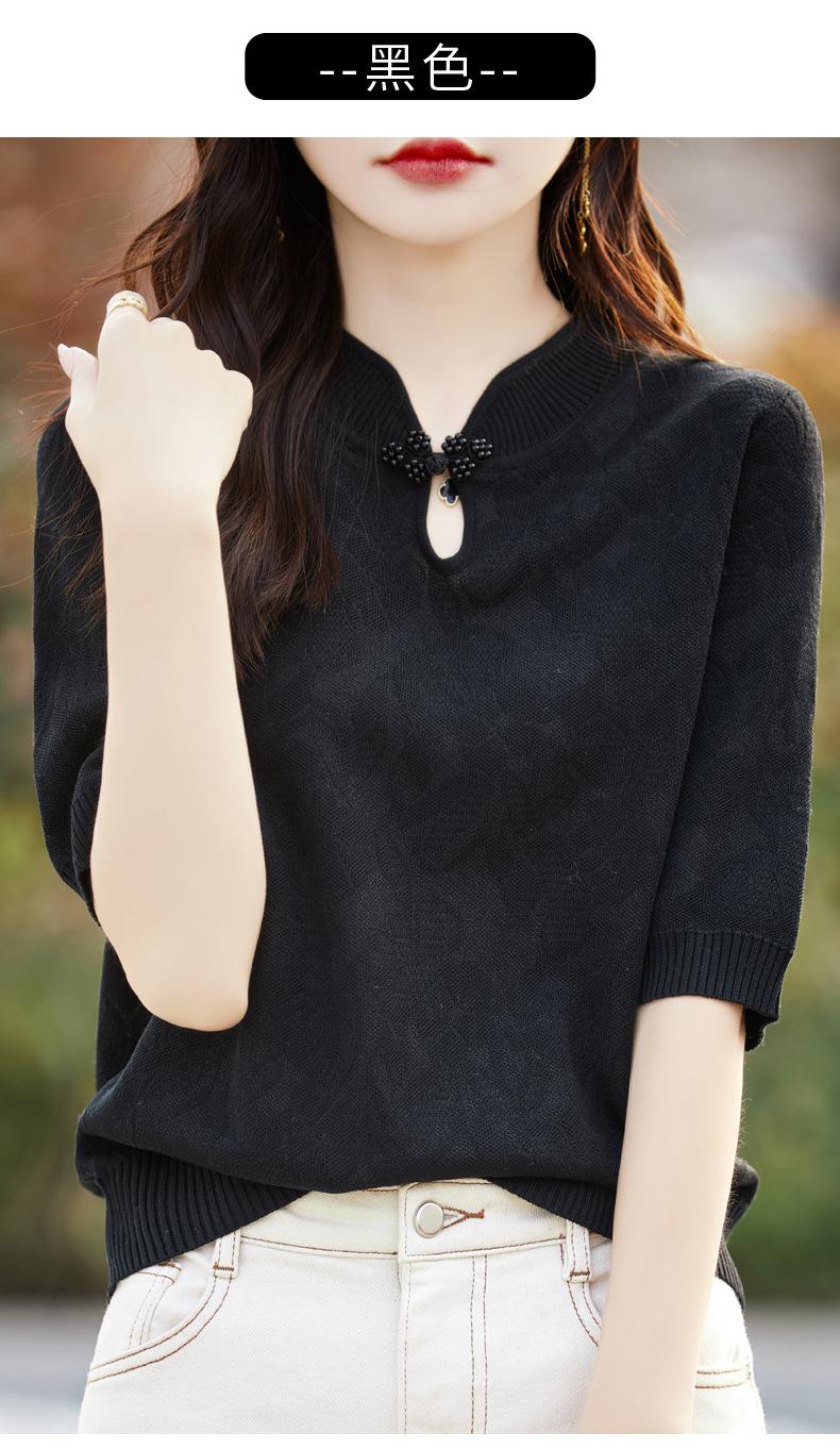 Camiseta de manga corta de lana peinada para mujer, suéter de color liso con hebilla de estilo nacional, top holgado y adelgazante de media manga, novedad de primavera y verano