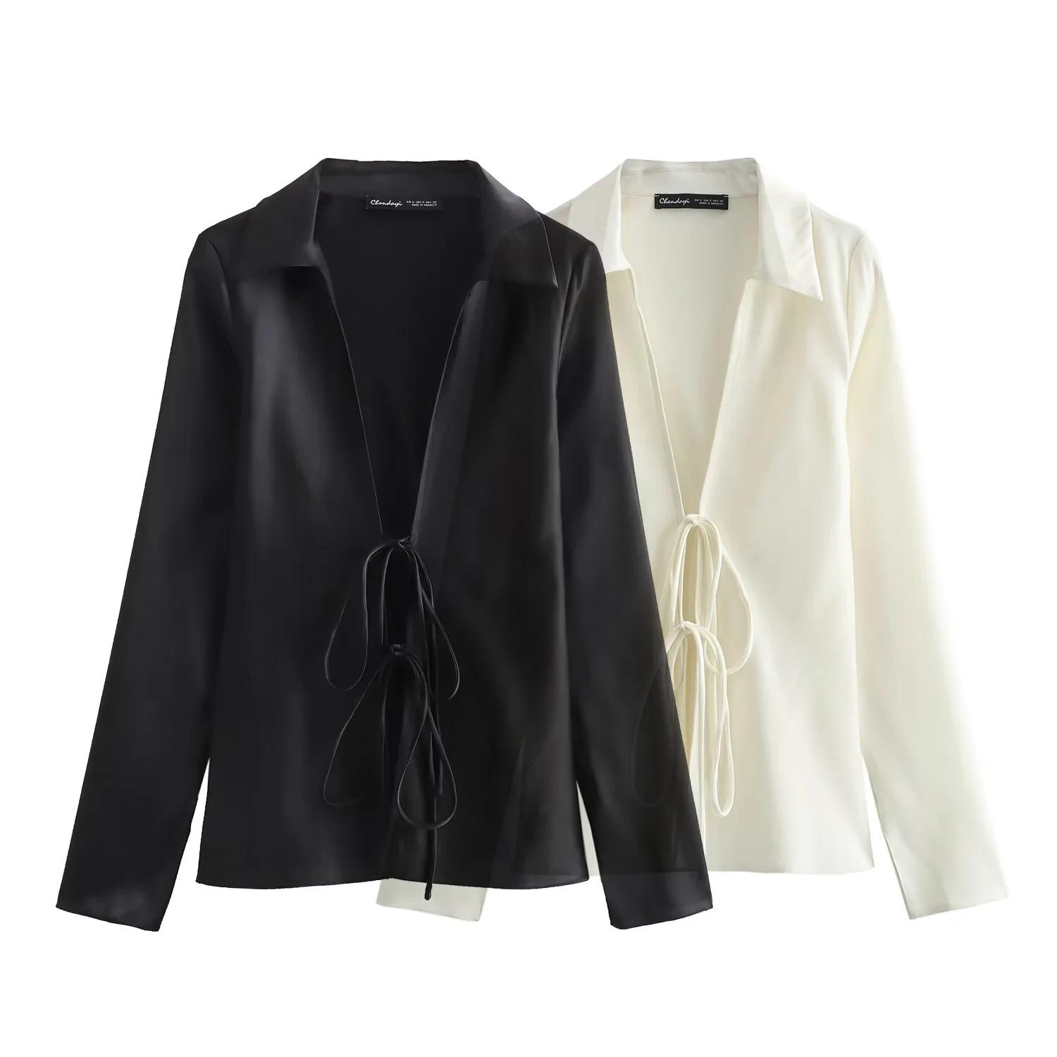 Exportación transfronteriza de ropa europea y americana 2024. Camisa de manga larga con solapa y textura de satén de seda de color puro con lazo decorado.