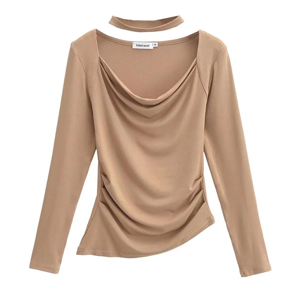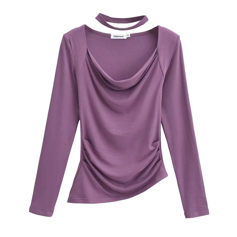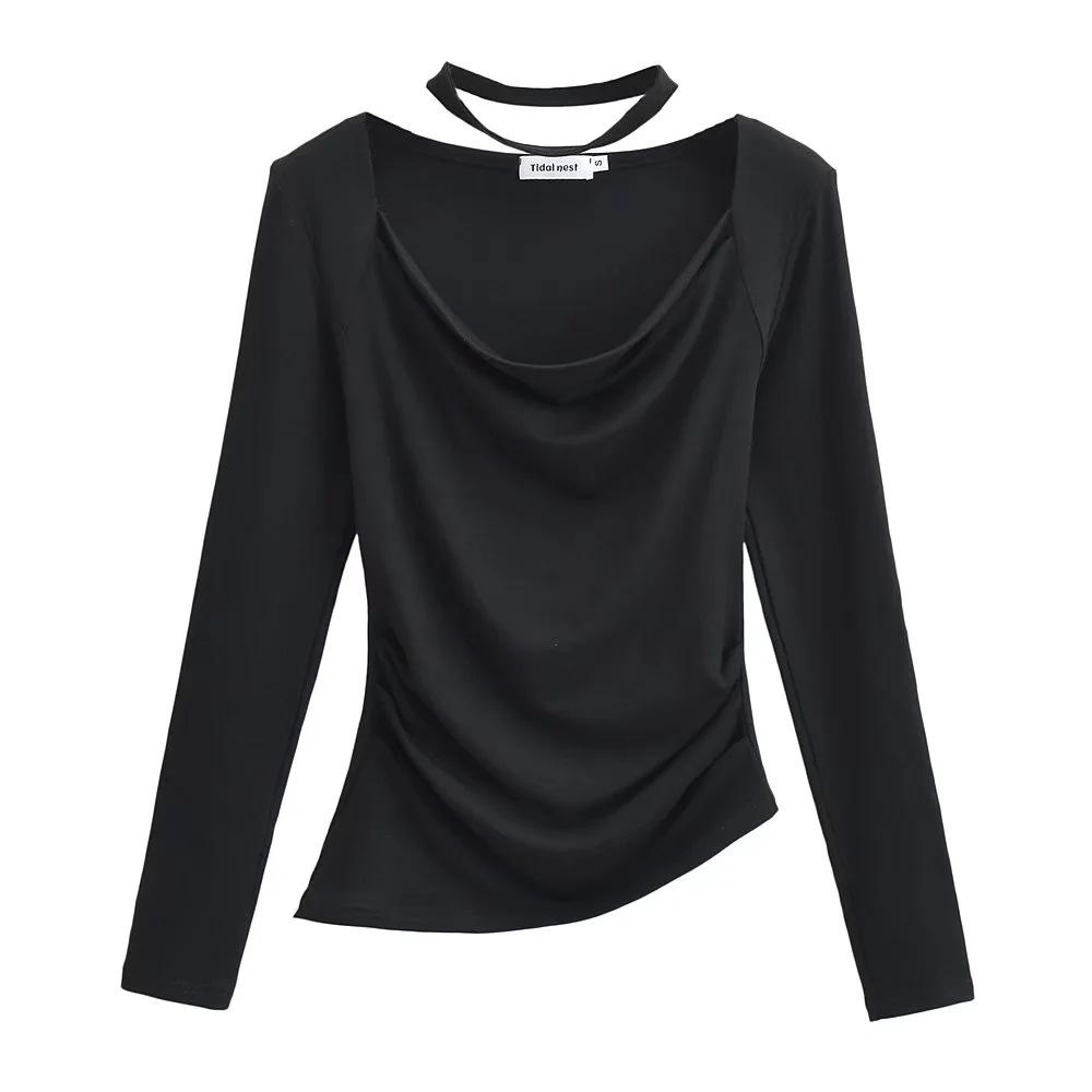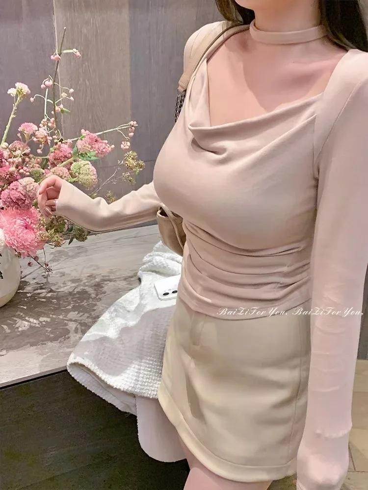 Camiseta de cuello alto estilo Spice Girl Pure Desire, nueva primavera 2023, pequeña, sexy, con un solo hombro, escote en V, manga larga