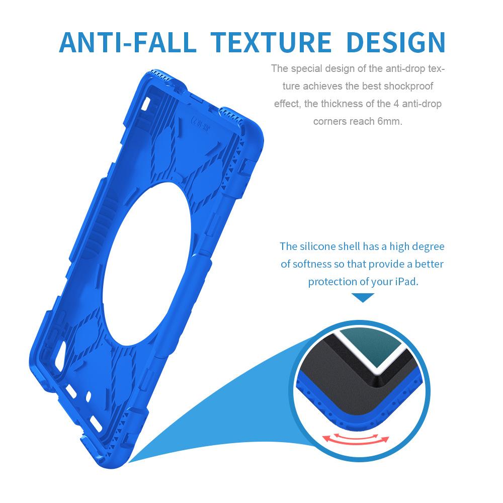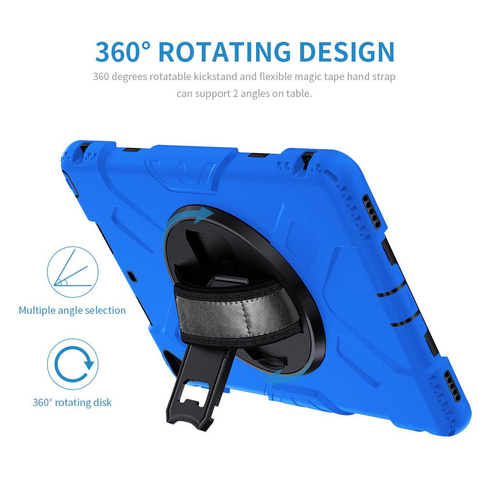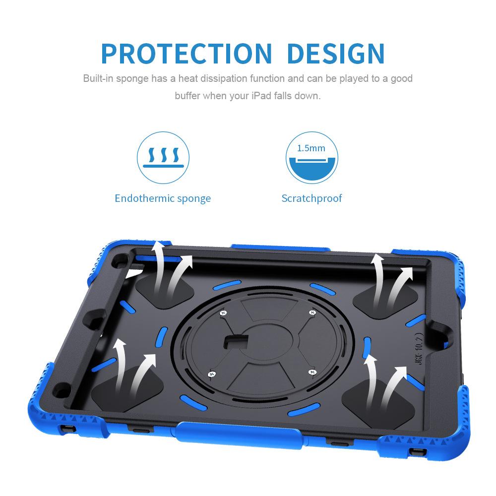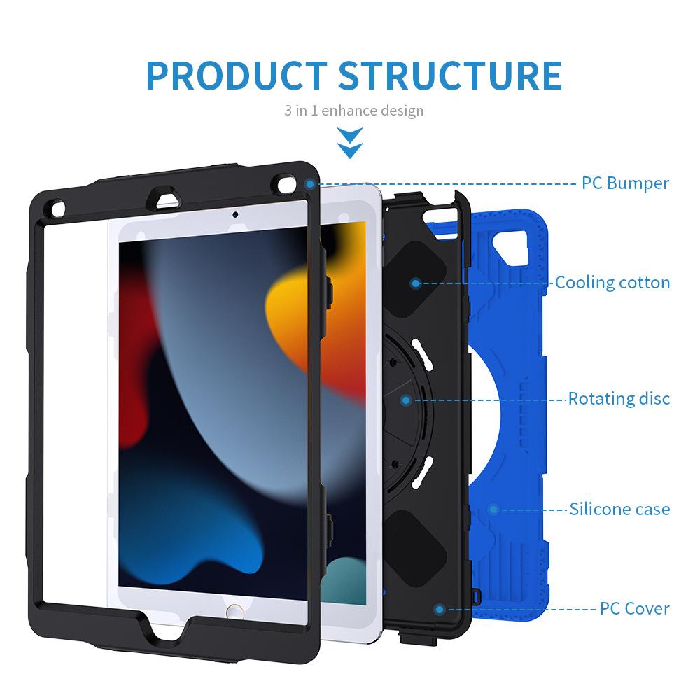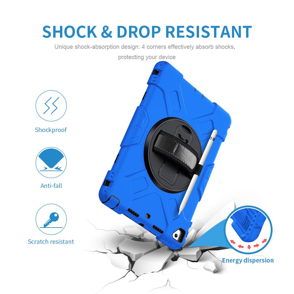 Funda protectora para iPad de 10,2 pulgadas con soporte giratorio de mano de tres capas de silicona anticaída.