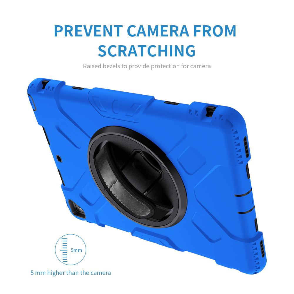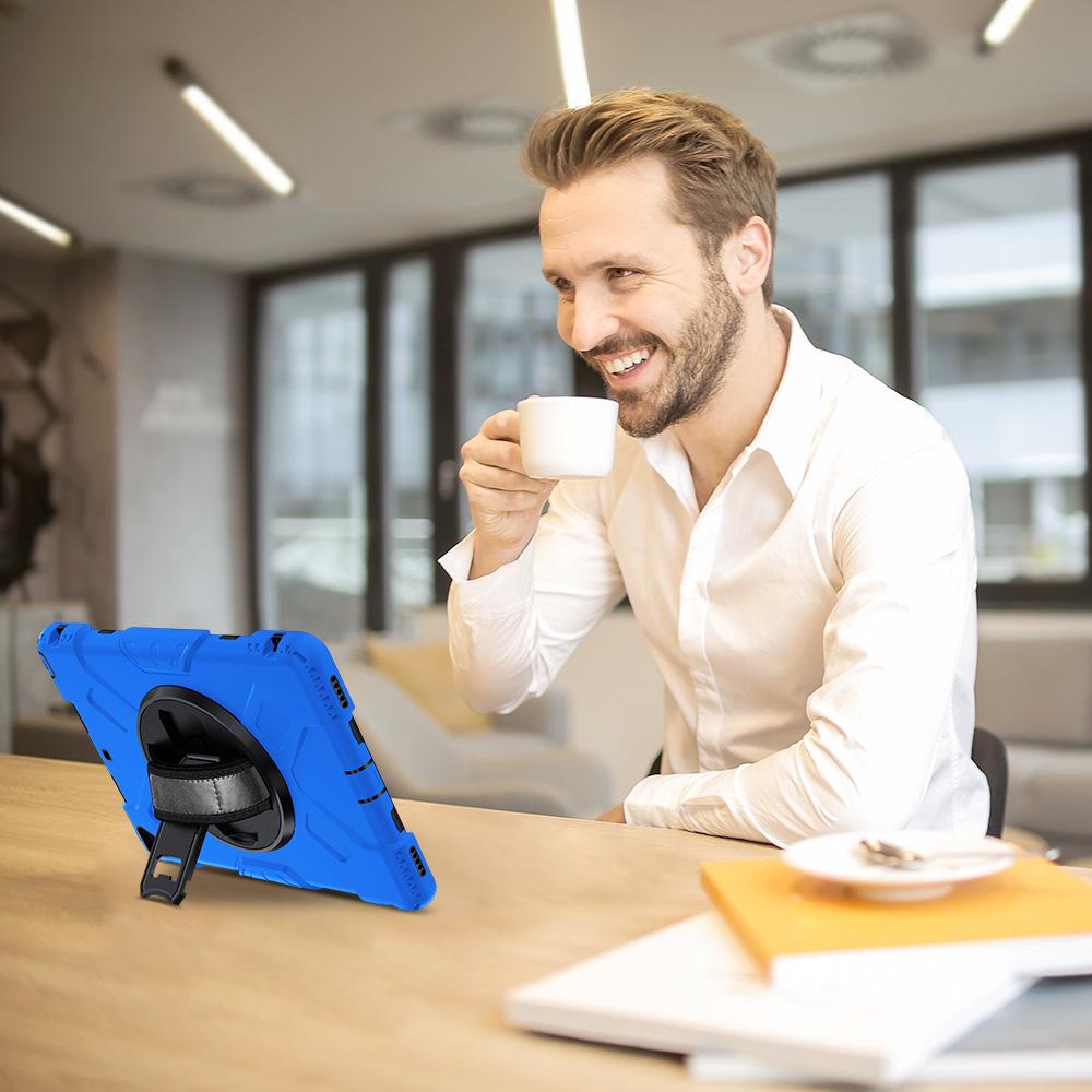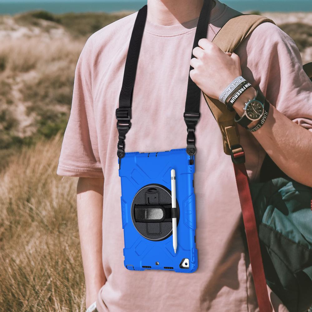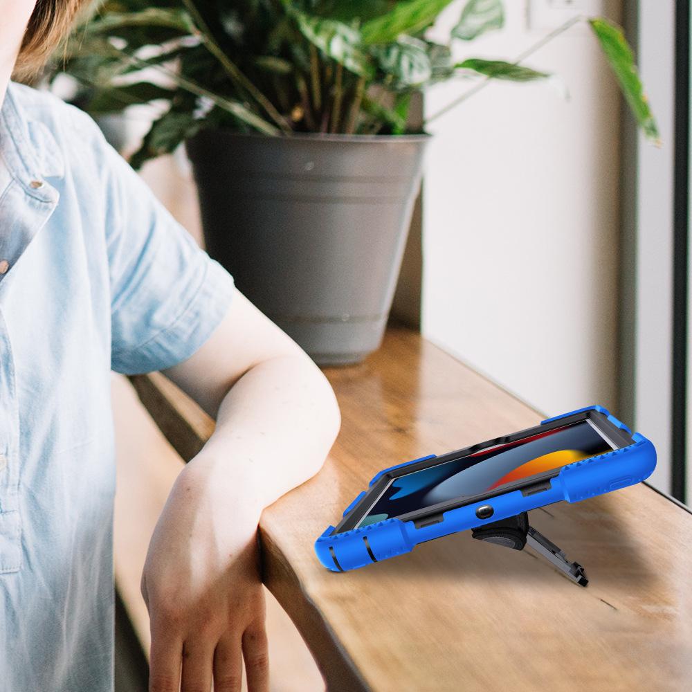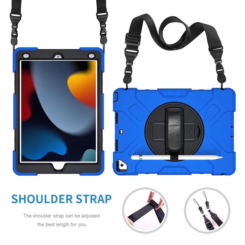 Funda protectora para iPad de 10,2 pulgadas con soporte giratorio de mano de tres capas de silicona anticaída.