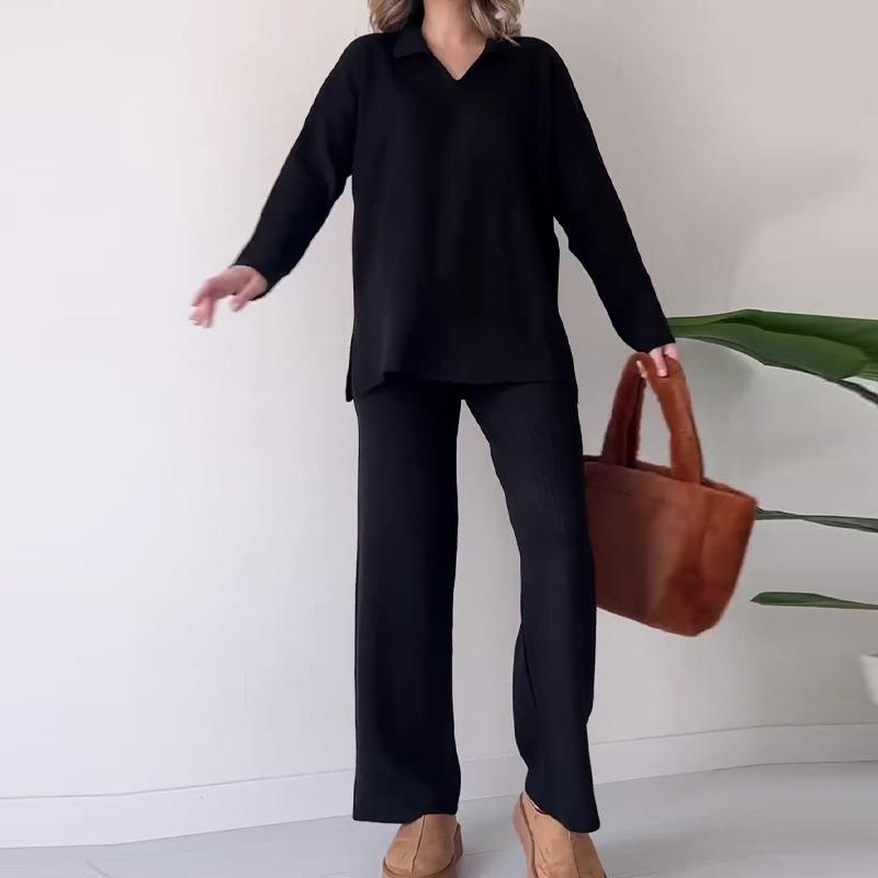 Otoño 2023, nuevo conjunto de dos piezas de suéter informal holgado con solapa de color sólido de moda transfronteriza de Amazon para mujeres de Europa y América