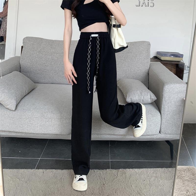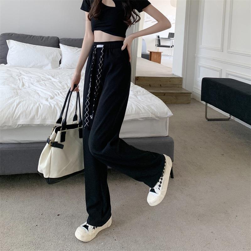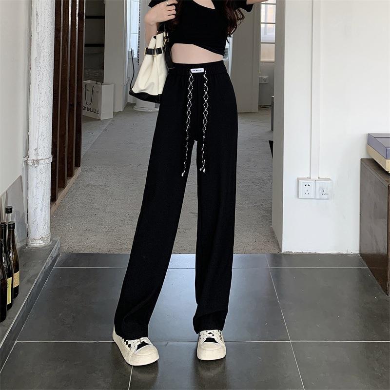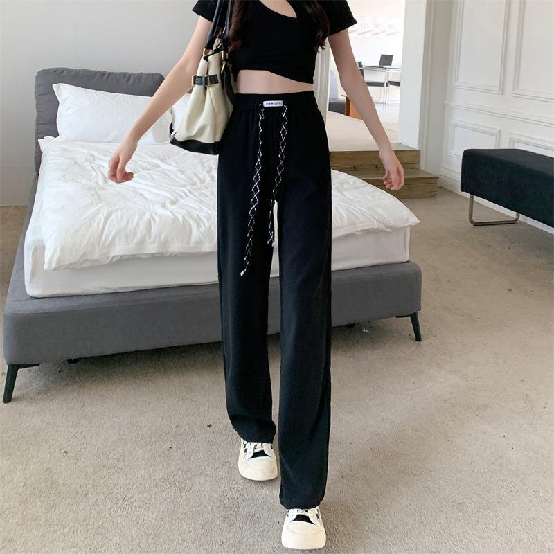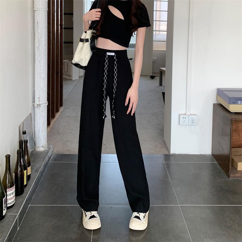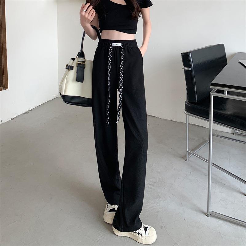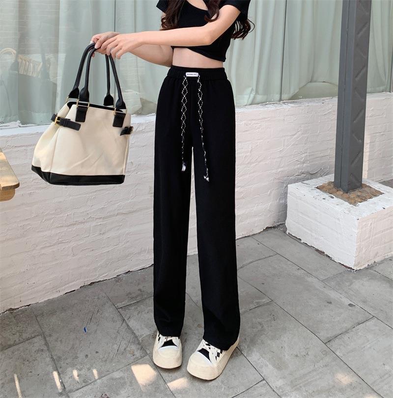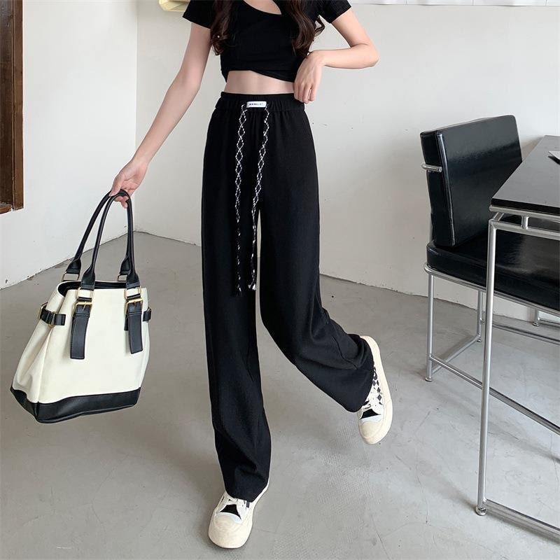 Compra Pantalones casuales con cordón elástico Design Sense para primavera y verano, estilo coreano, cintura alta, adelgazantes, negros, deportivos, de pierna ancha para mujer al por mayor en Joom.pro