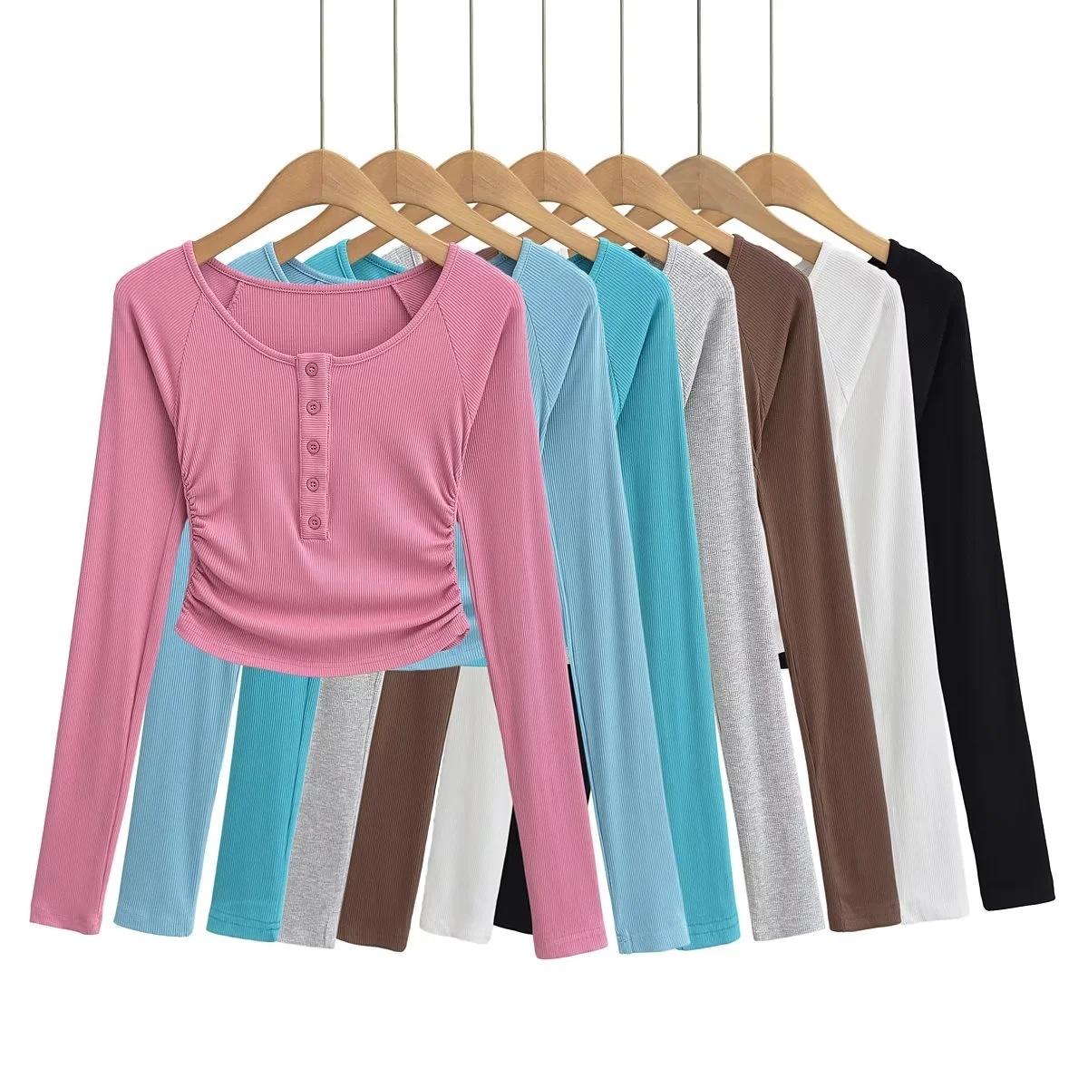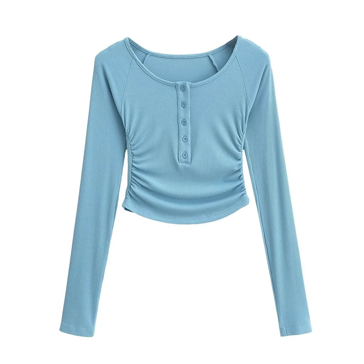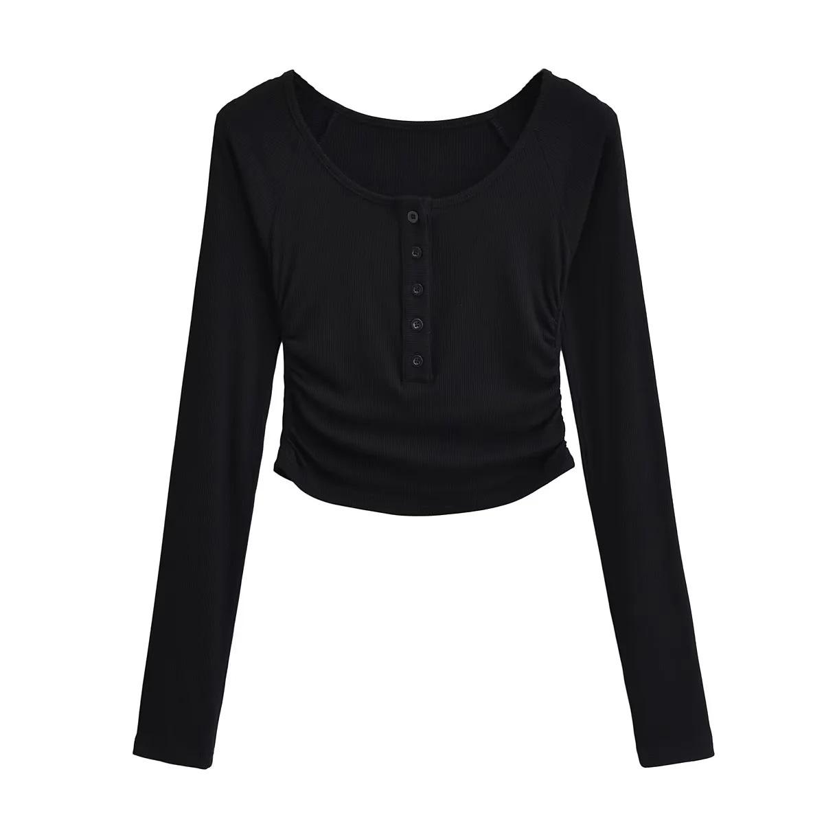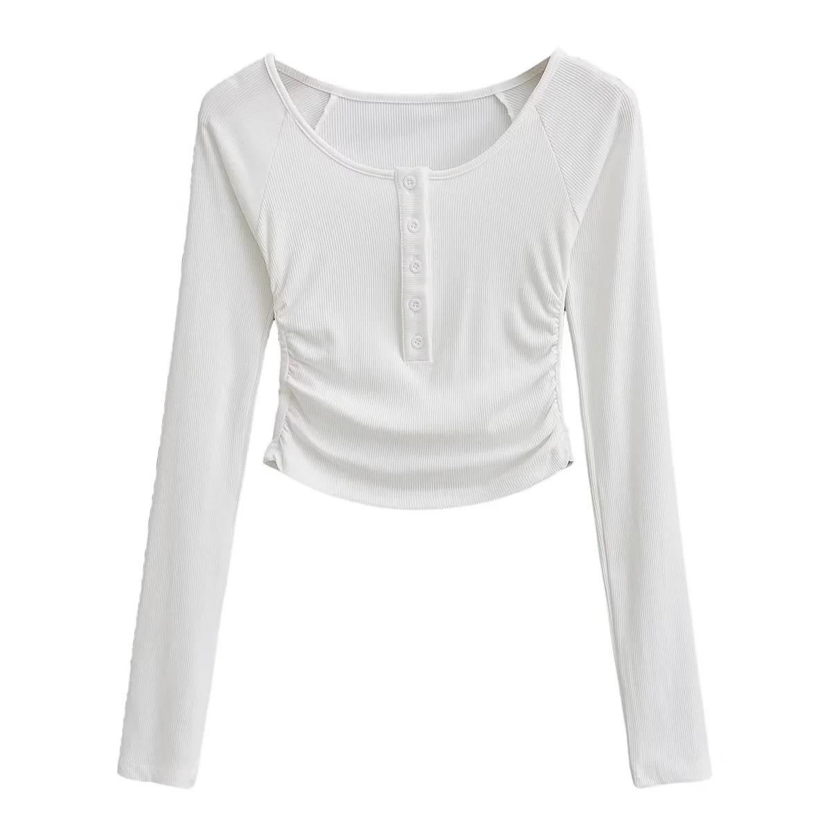 Camiseta de manga larga estilo Spice Girl estilo americano con cuello redondo y tapeta semiabierta de otoño, nueva camiseta ajustada con pliegues laterales.