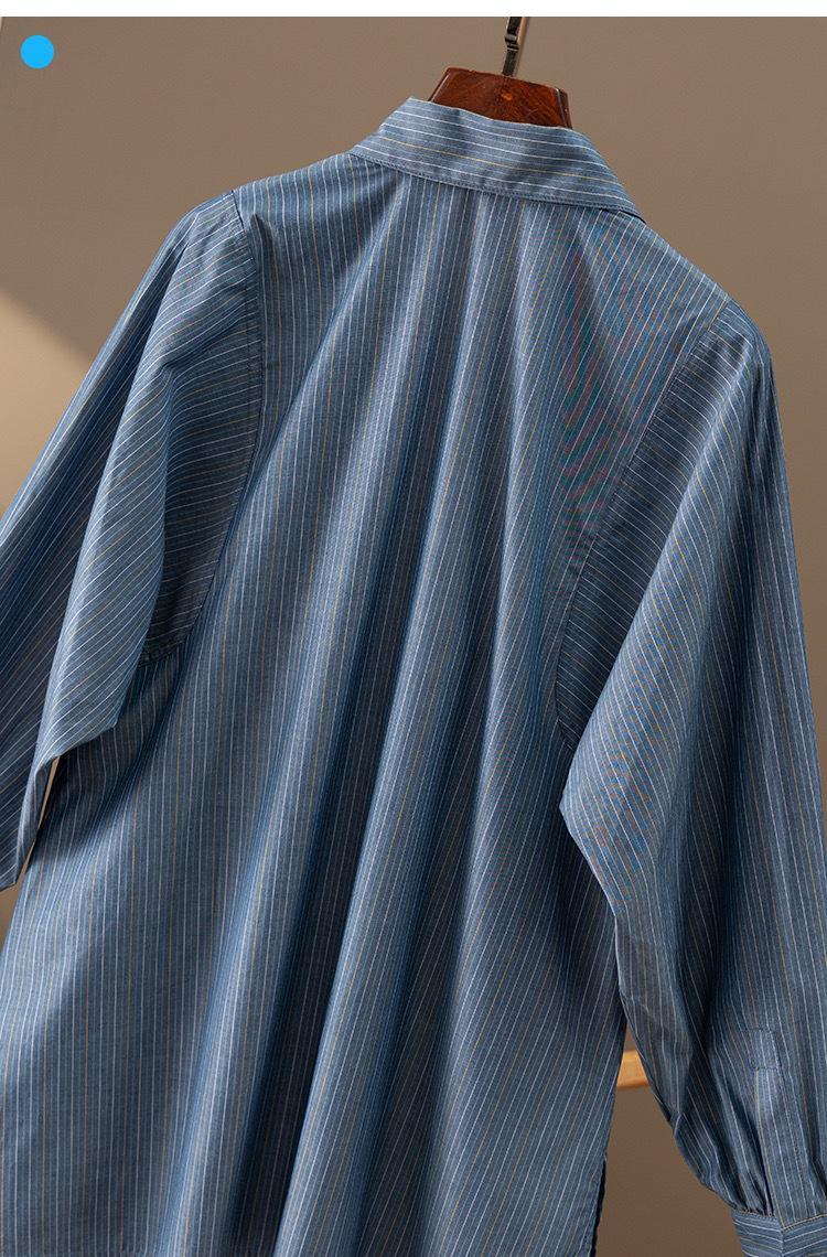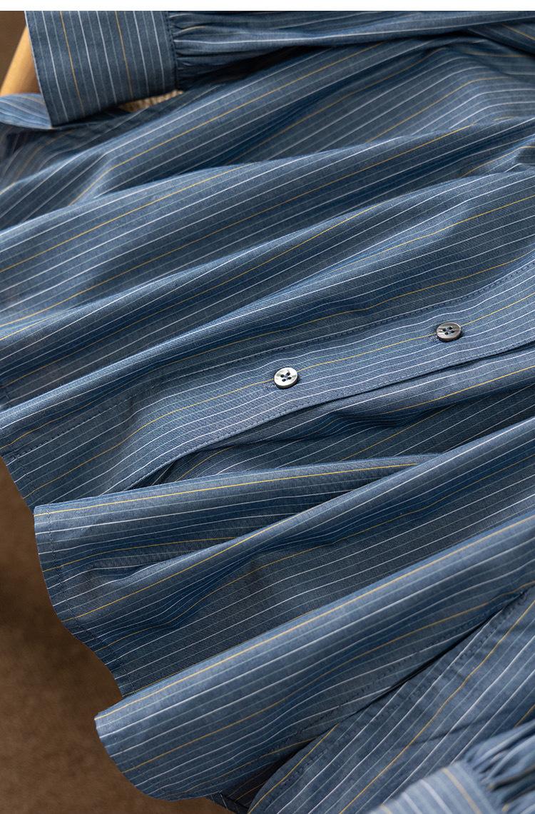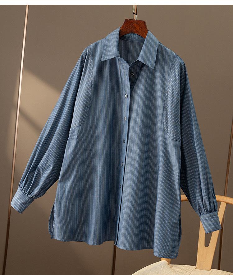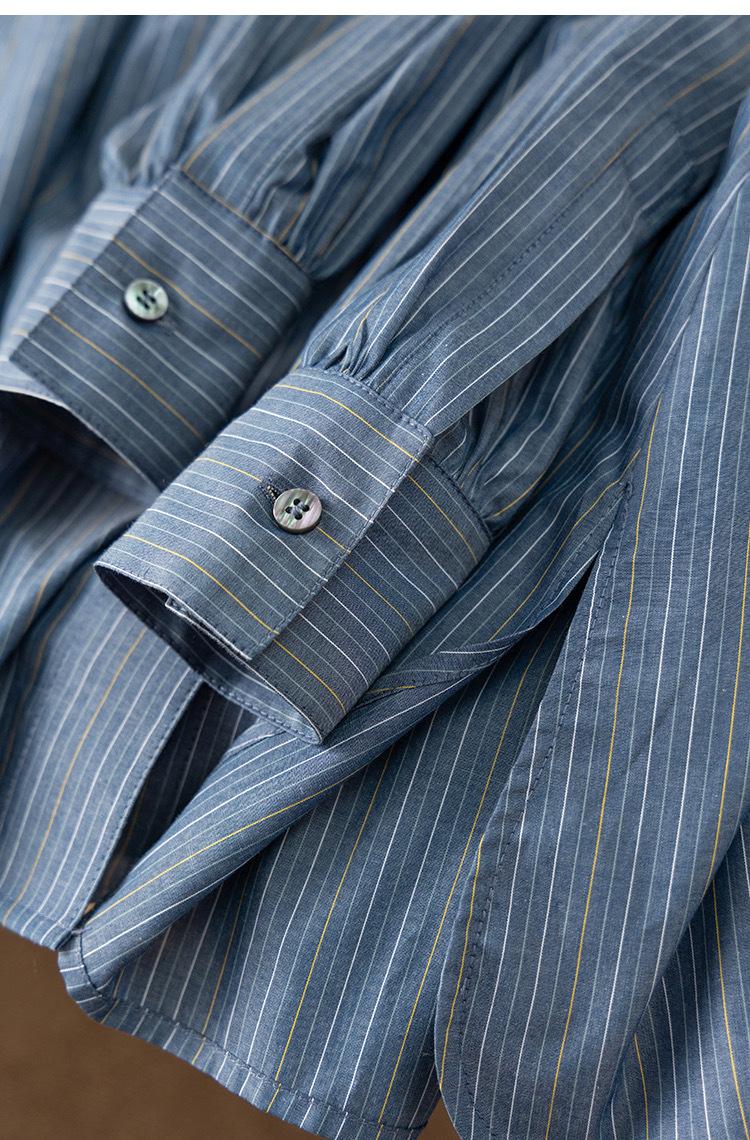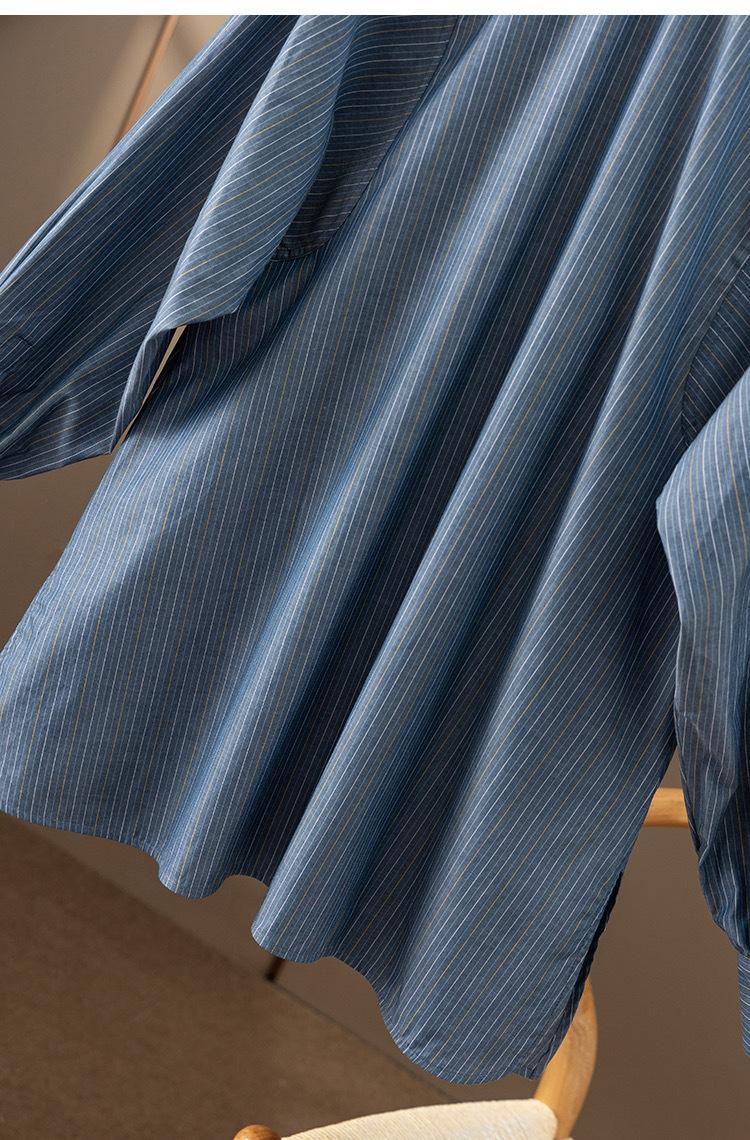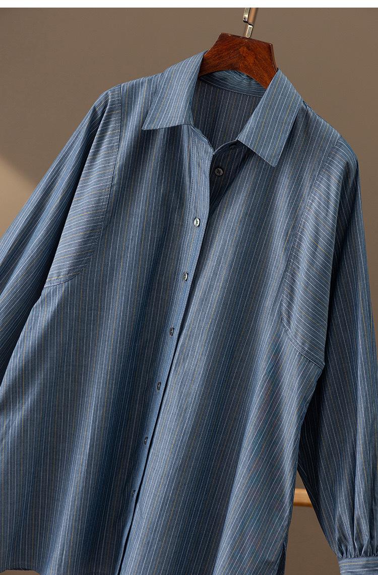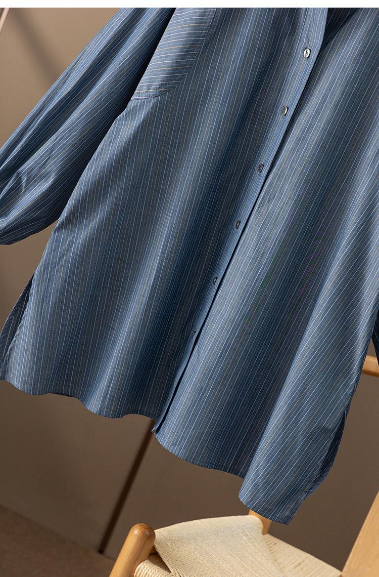 Camisa Top Elegante de Algodón Chunchun Individual a la Moda Vintage Diseño de Rayas Delgadas Sentido de Rayas Verticales Abertura Lateral Cuello Puntiagudo para Mujer