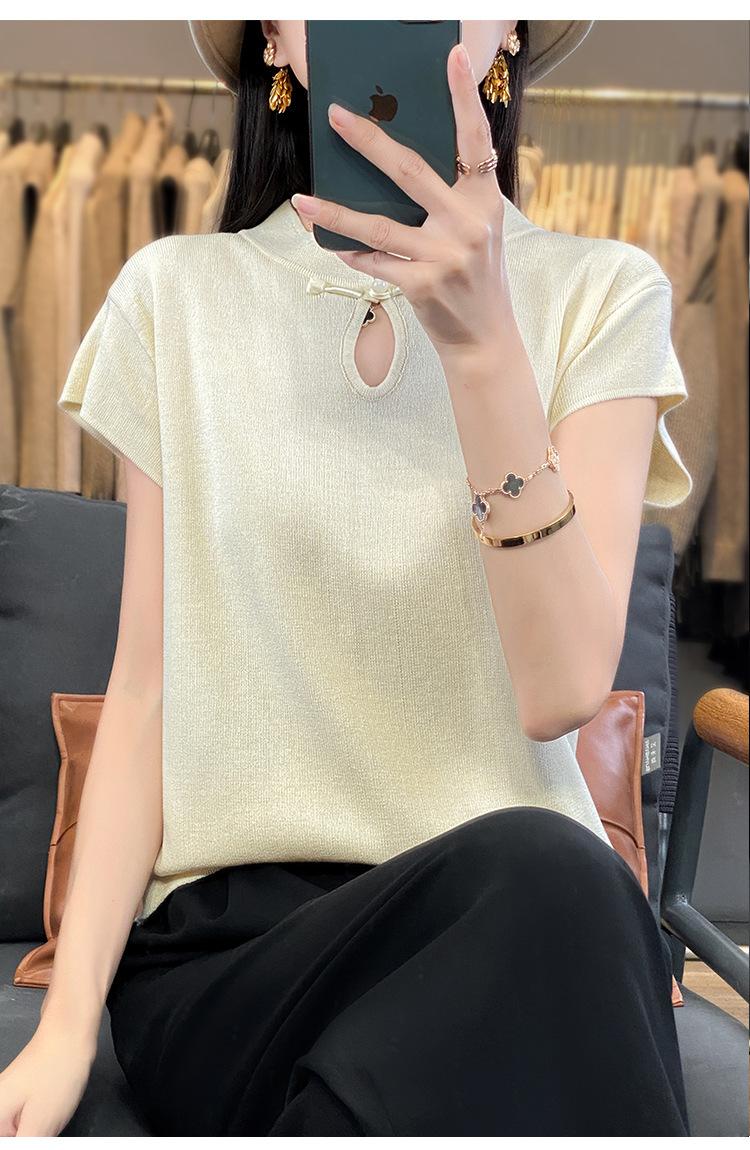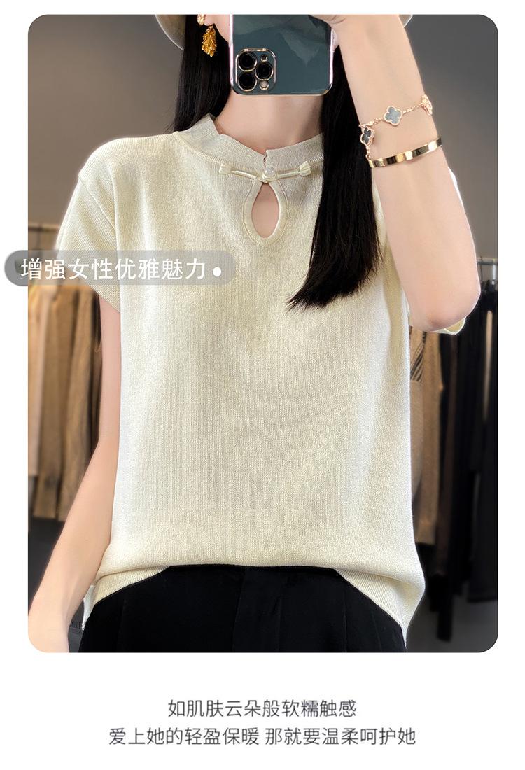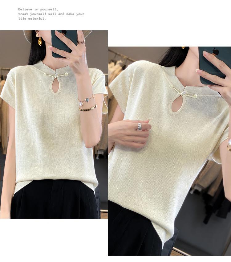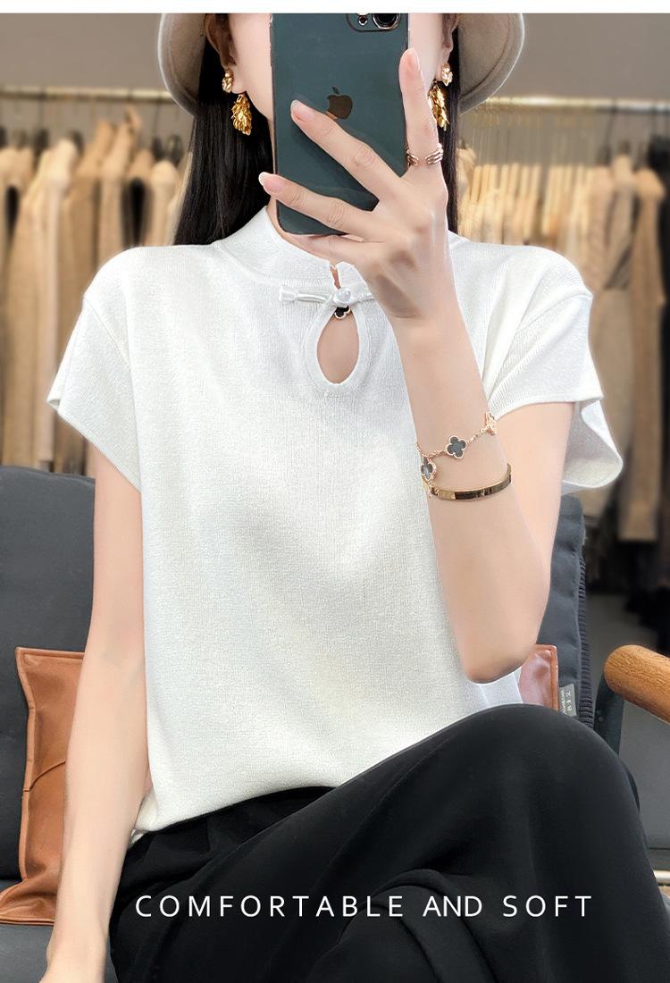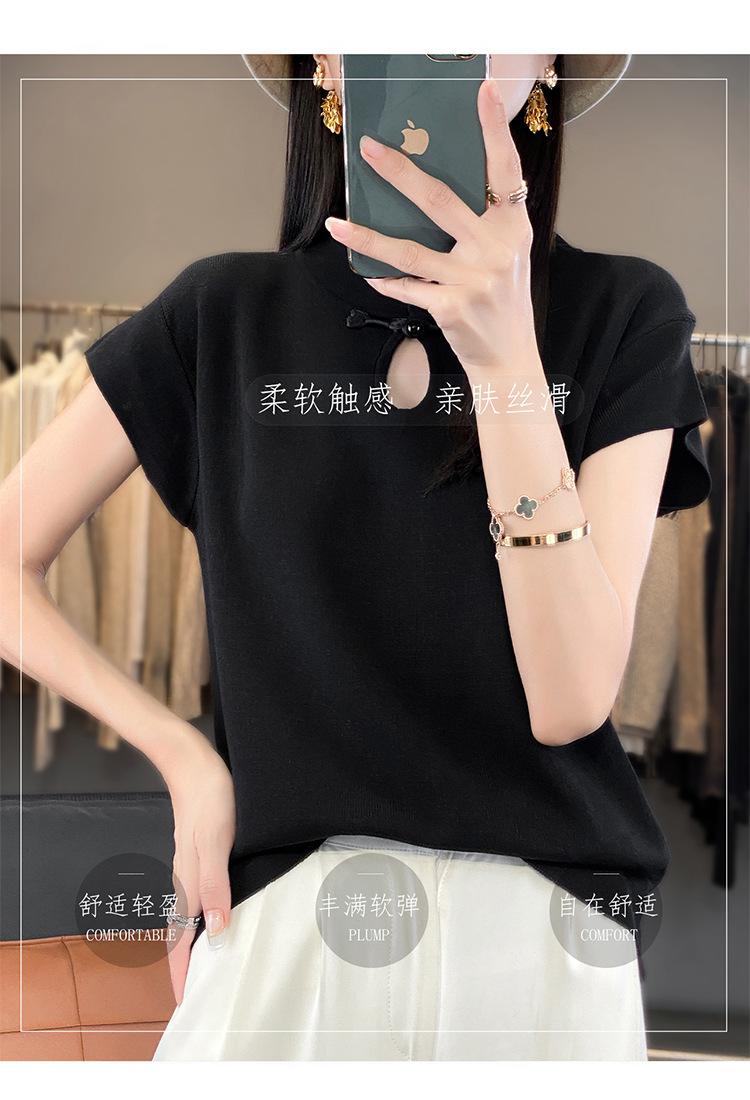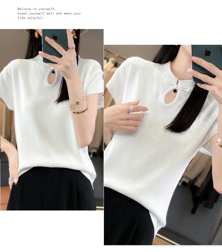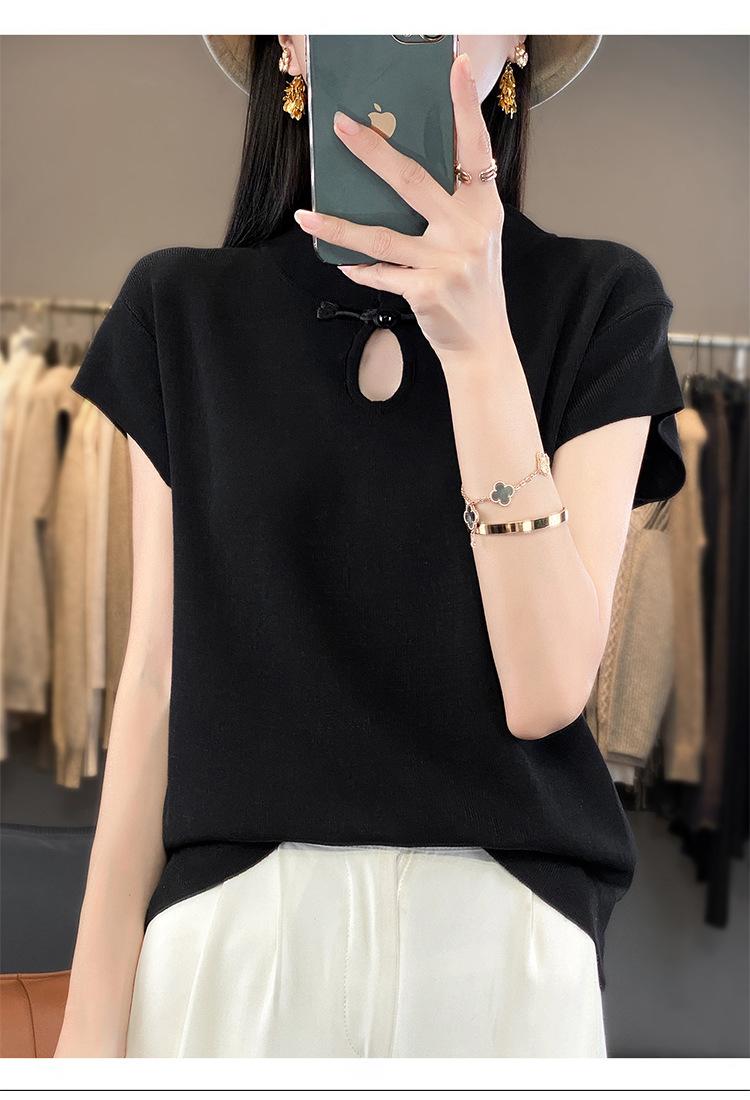 Compra Suéter de cuello alto de seda helada de estilo nacional chino para mujer, novedad de verano de 2024, suéter de manga corta con hebilla de color sólido, top suelto al por mayor en Joom.pro