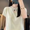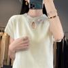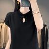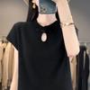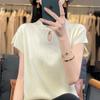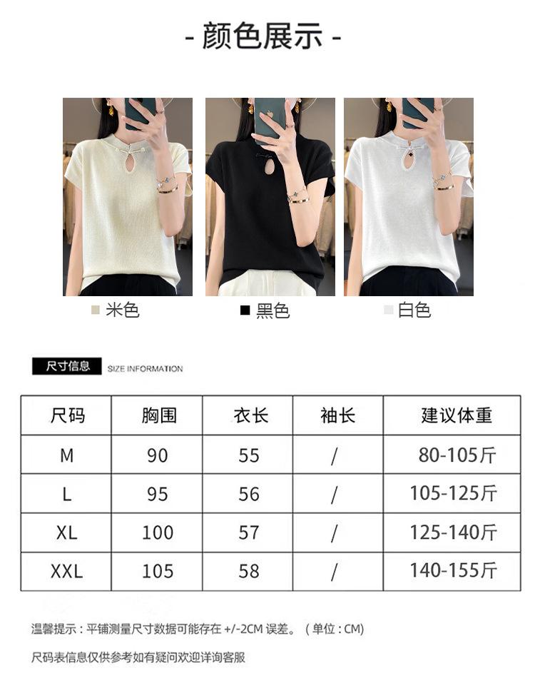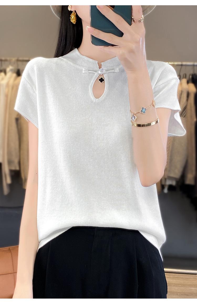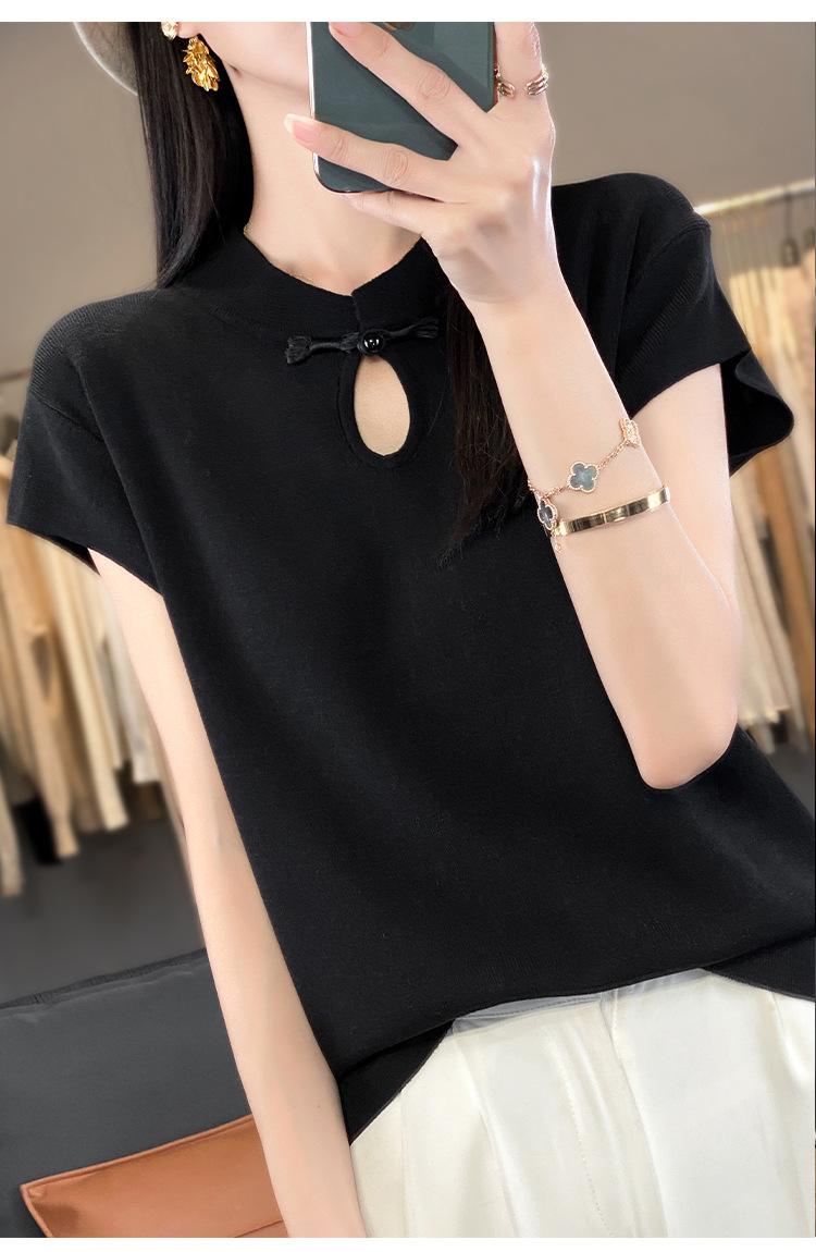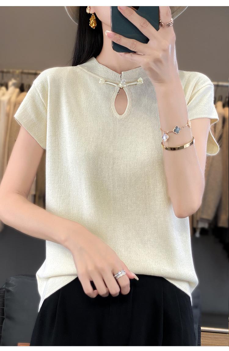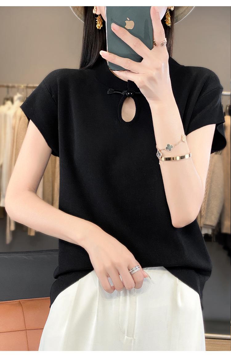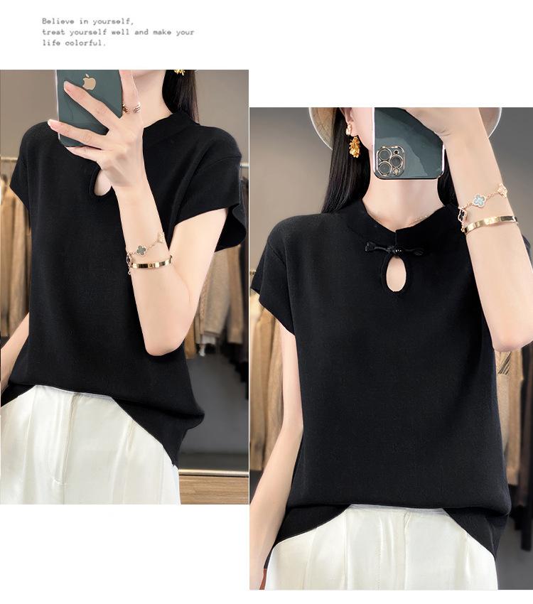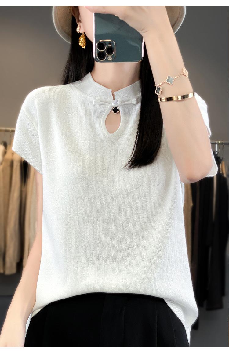 Compra Suéter de cuello alto de seda helada de estilo nacional chino para mujer, novedad de verano de 2024, suéter de manga corta con hebilla de color sólido, top suelto al por mayor en Joom.pro