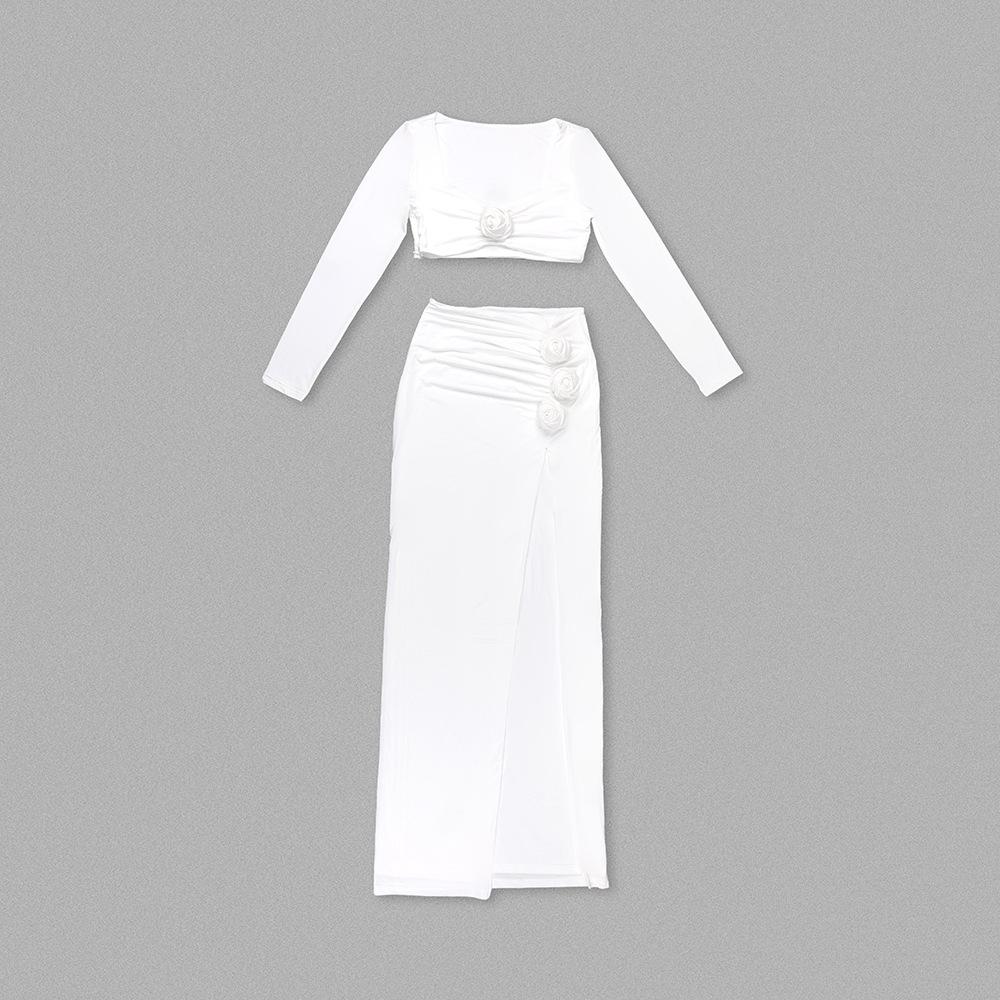Traje de dos piezas negro de primavera y verano europeo y americano transfronterizo nuevo para mujer, top de flores de cuello cuadrado de seda helada, falda larga con abertura.