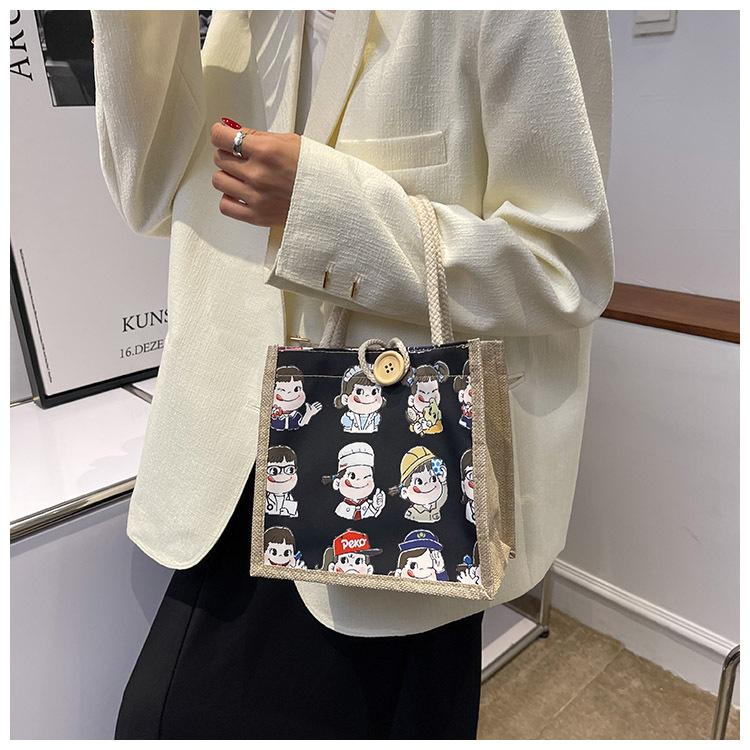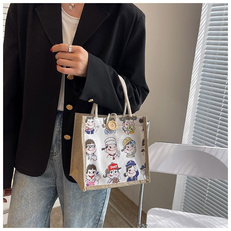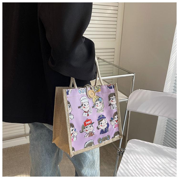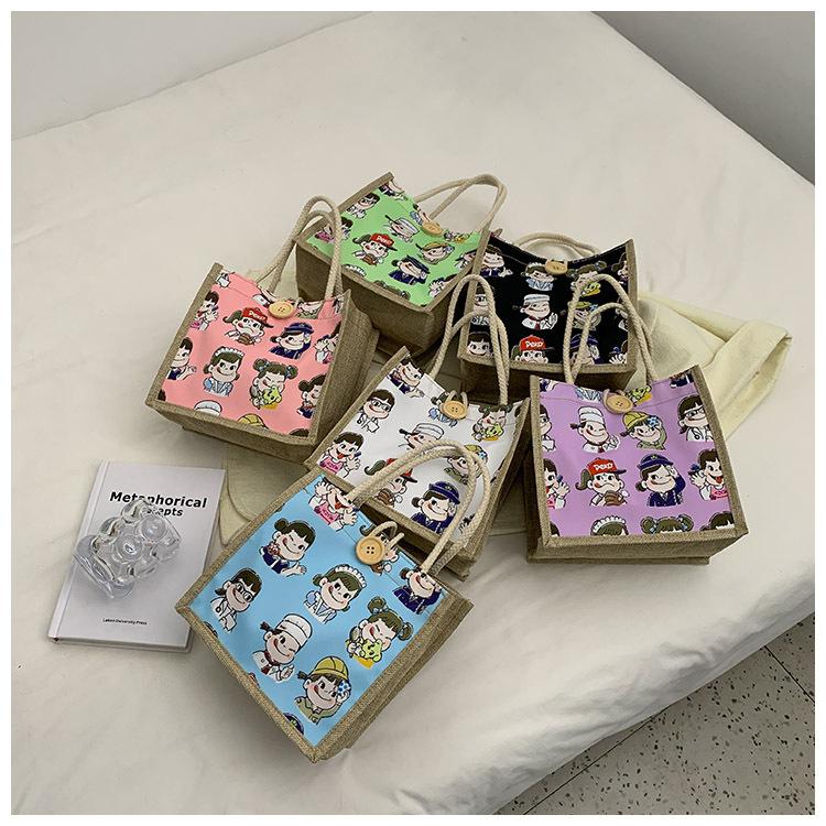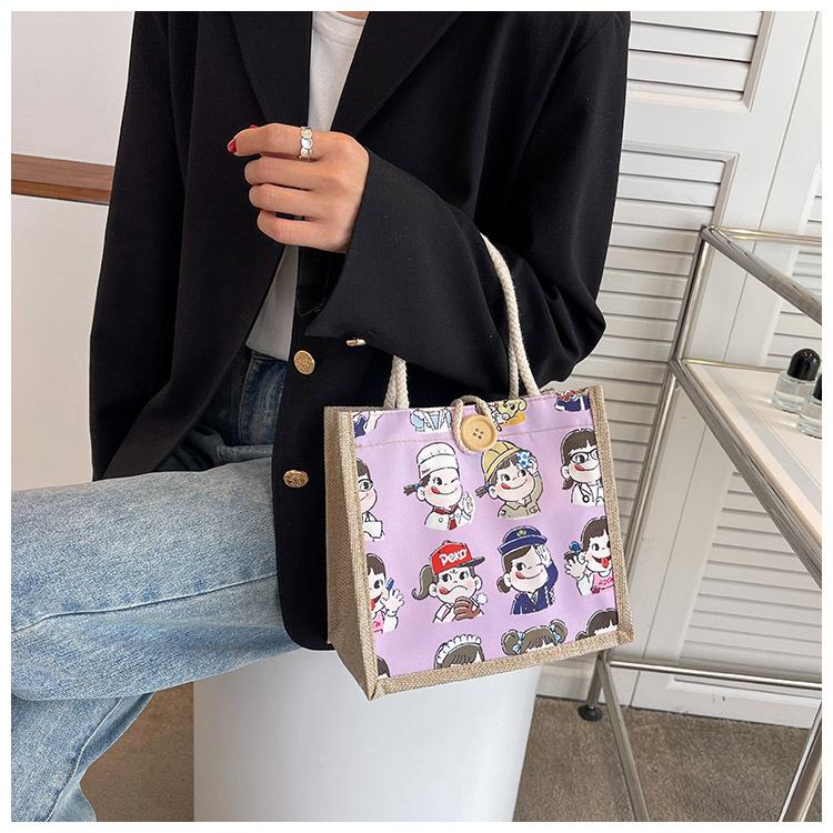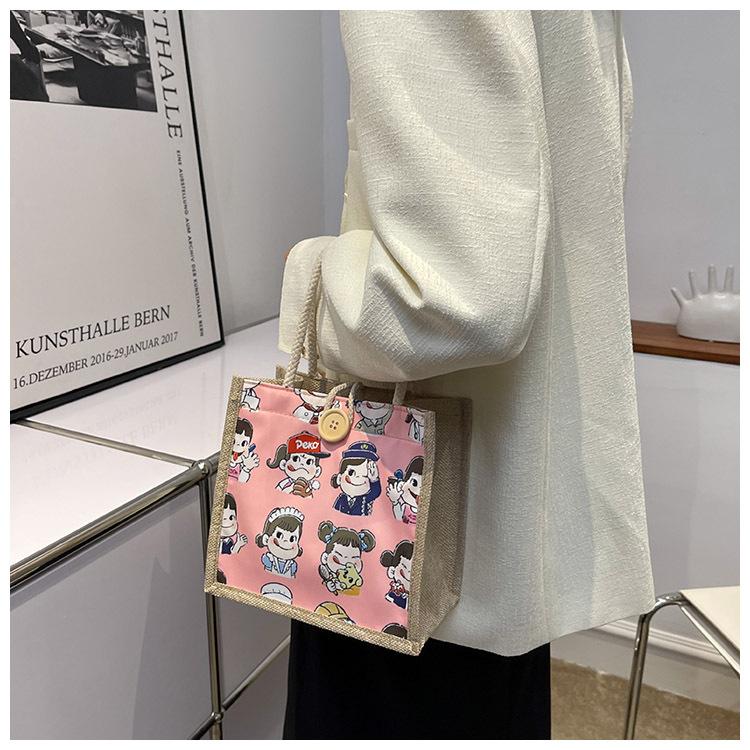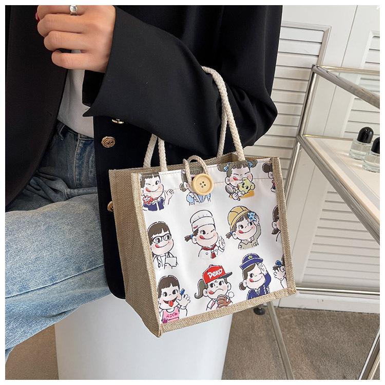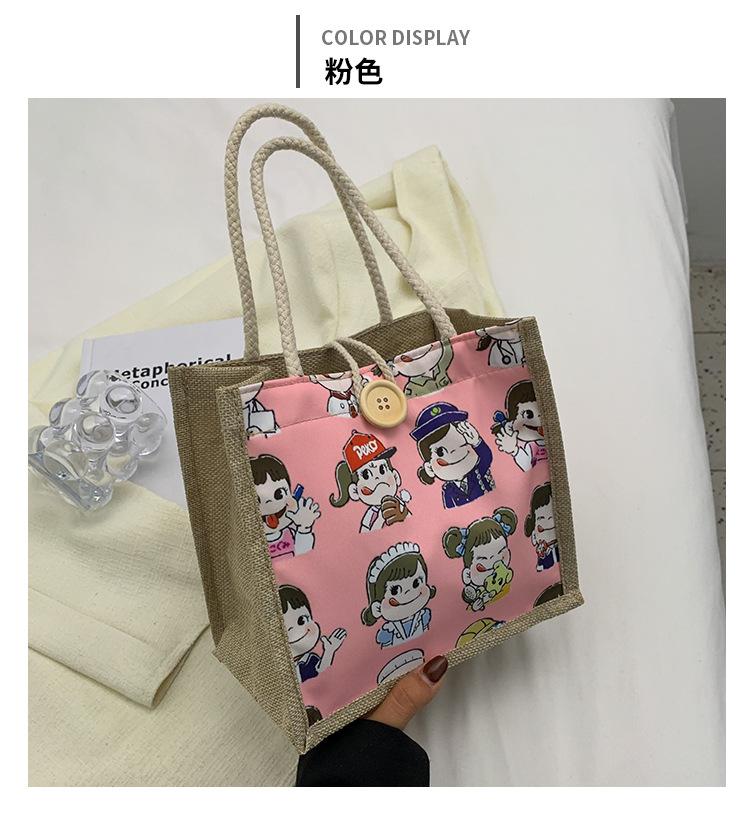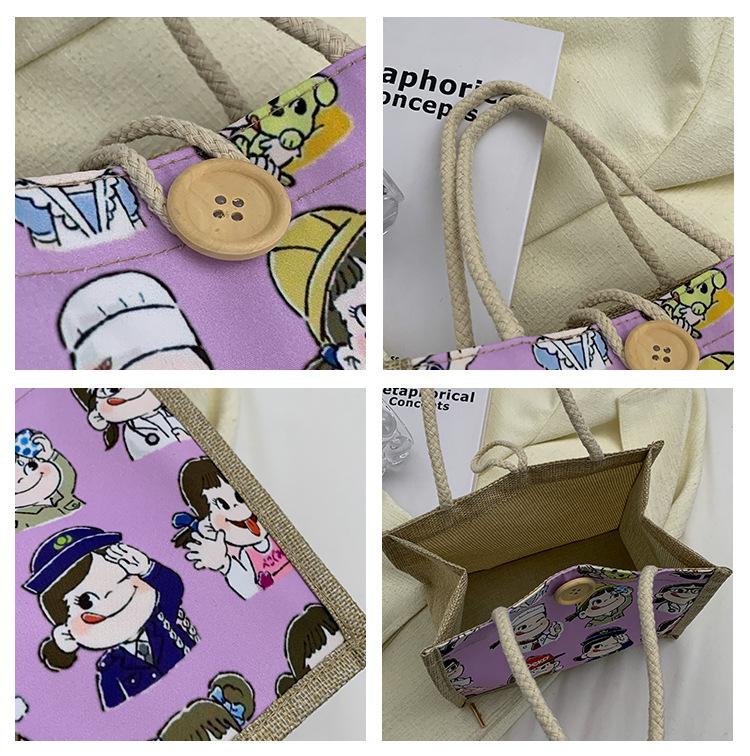 Bolsa Lonchera de Dibujos Animados Bolso de Mano de Lino para Mujer Salida Duradera Bolsa de Almacenamiento de Maquillaje Verano Mano Lona Bolsa de Compras