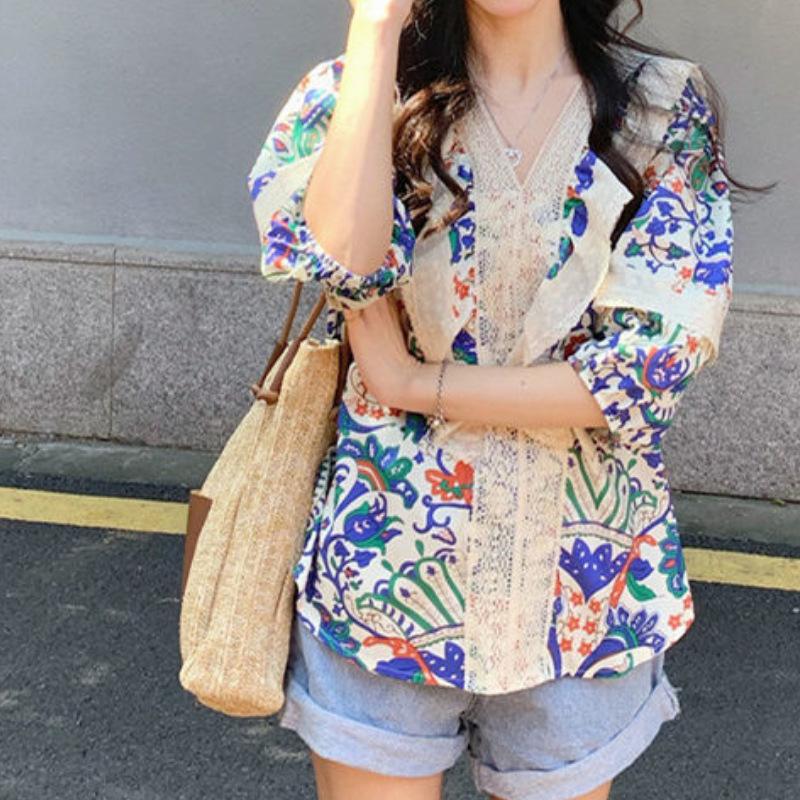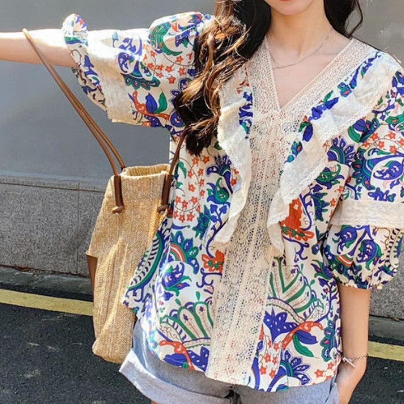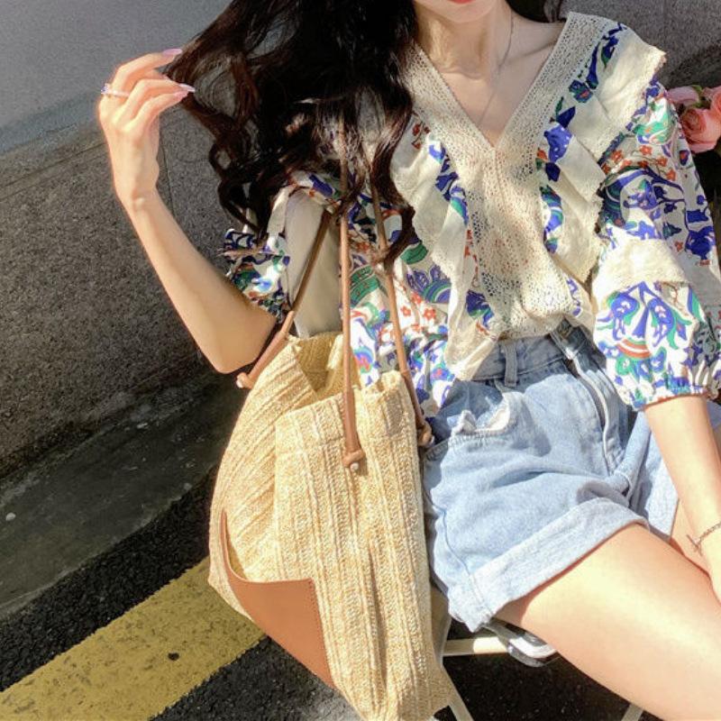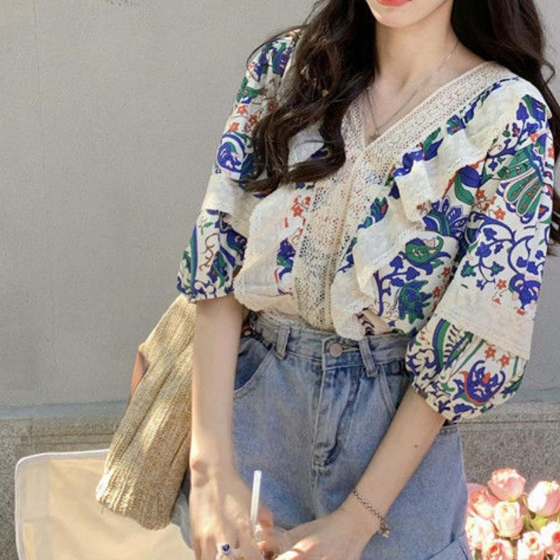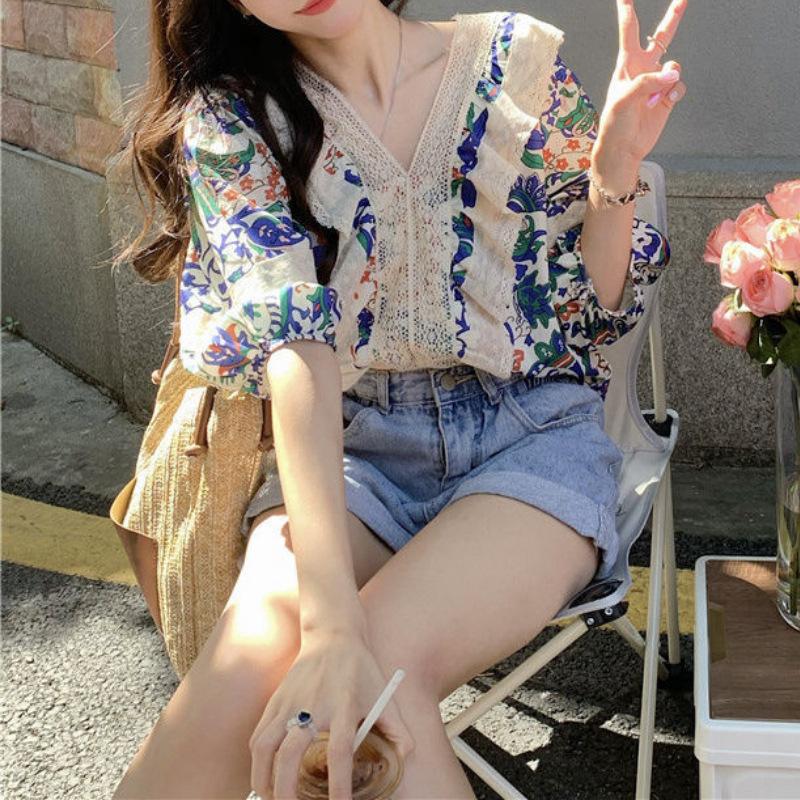 Camisa de Manga Corta Top de Mujer Verano 2023 Nuevo Cuello Encaje Floral Manga Abullonada Camisa de Alta Gama