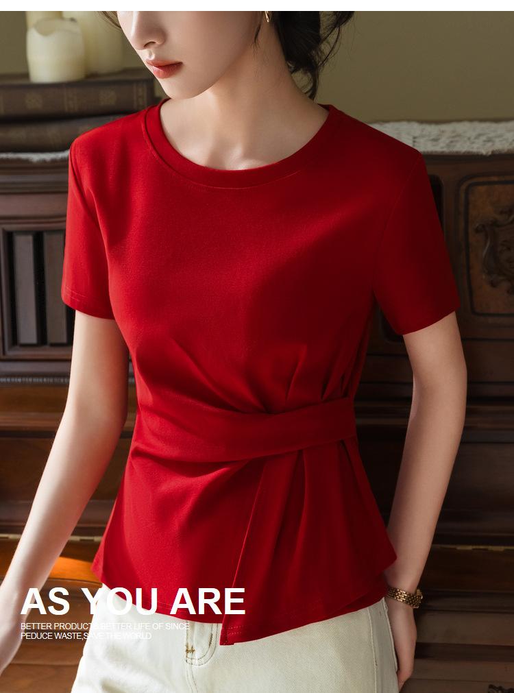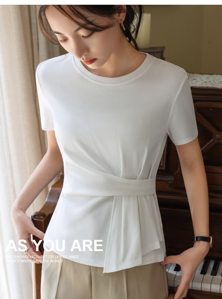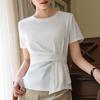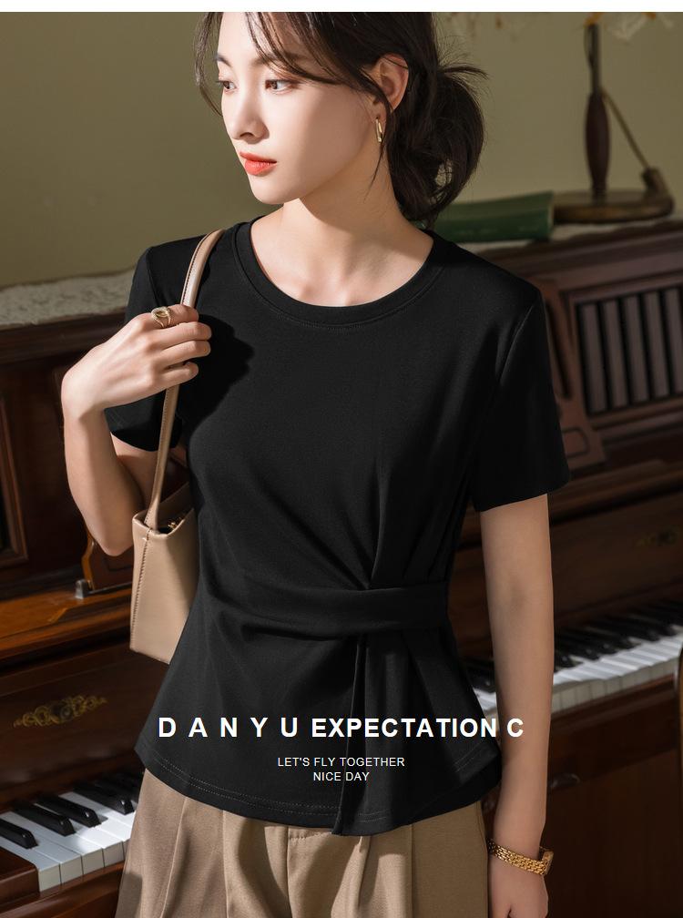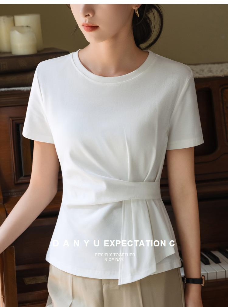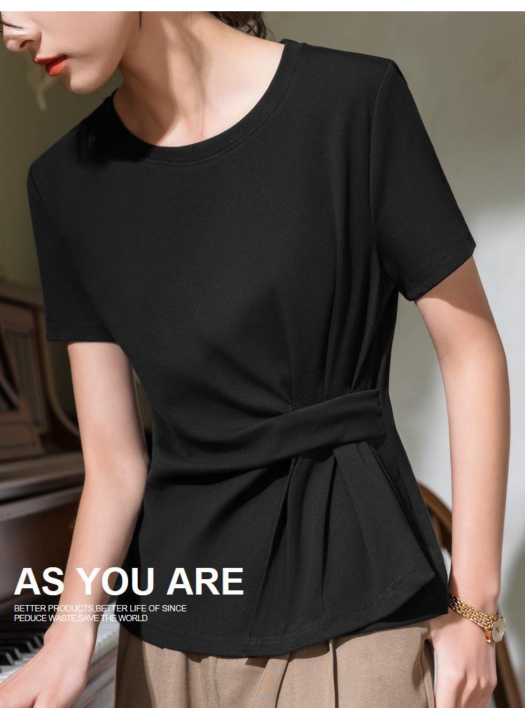 Playera de Manga Corta para Mujer Verano 2023 Nueva Camiseta de Algodón de Color Puro con Cuello Redondo para Mujer Diseño Cintura Pellizcada Top con Cintura Plisada