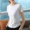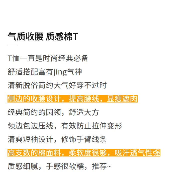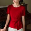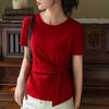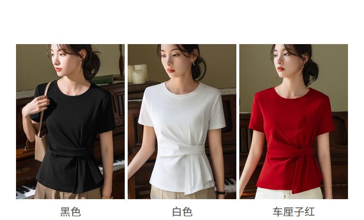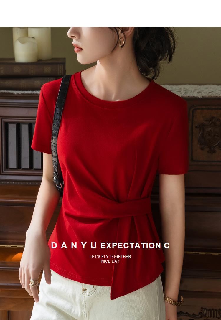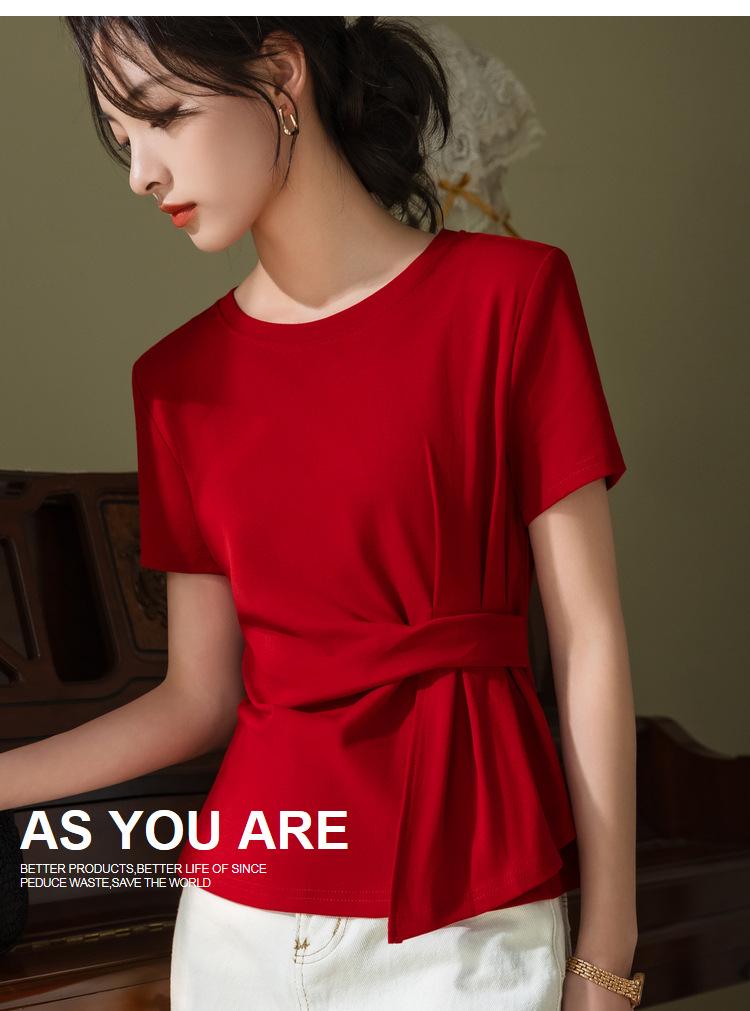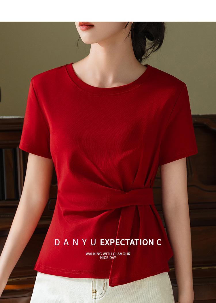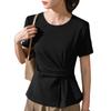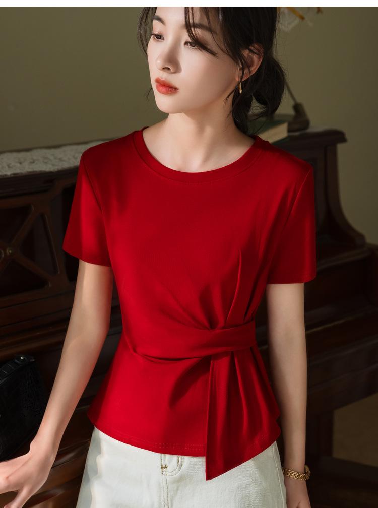 Playera de Manga Corta para Mujer Verano 2023 Nueva Camiseta de Algodón de Color Puro con Cuello Redondo para Mujer Diseño Cintura Pellizcada Top con Cintura Plisada