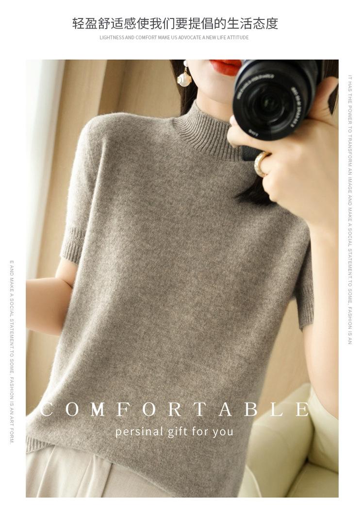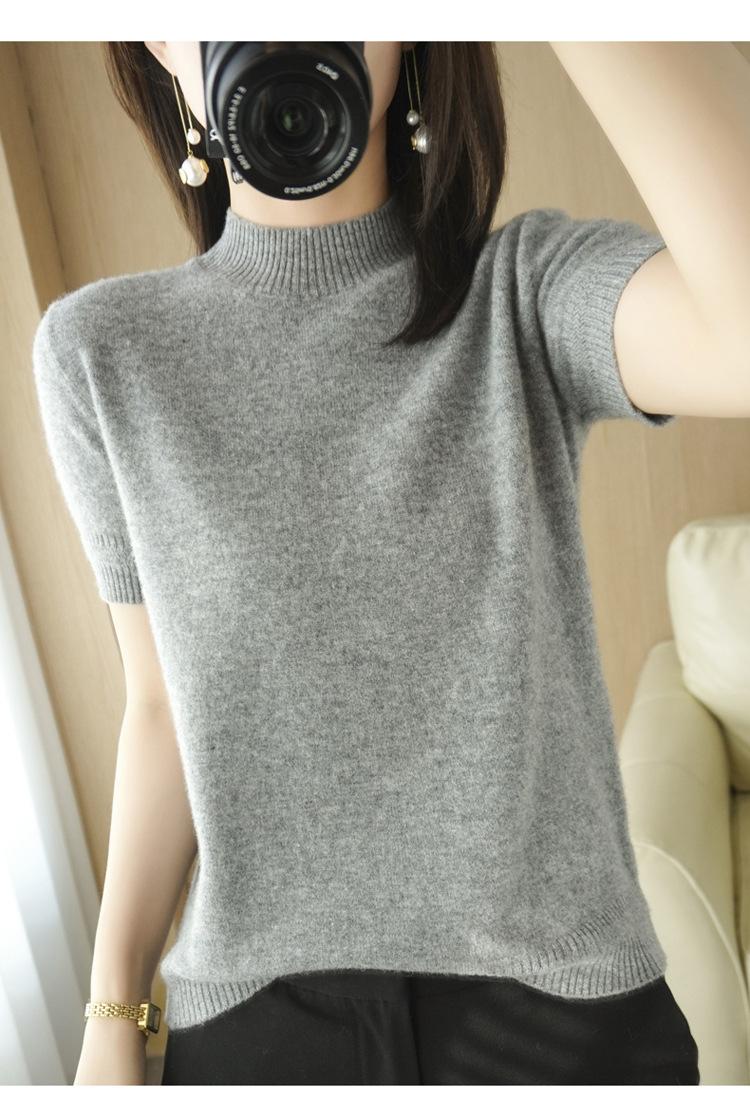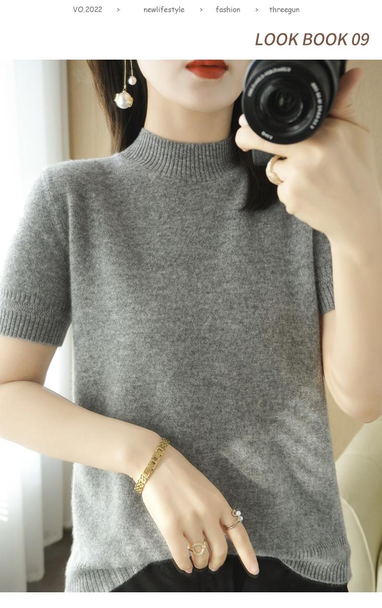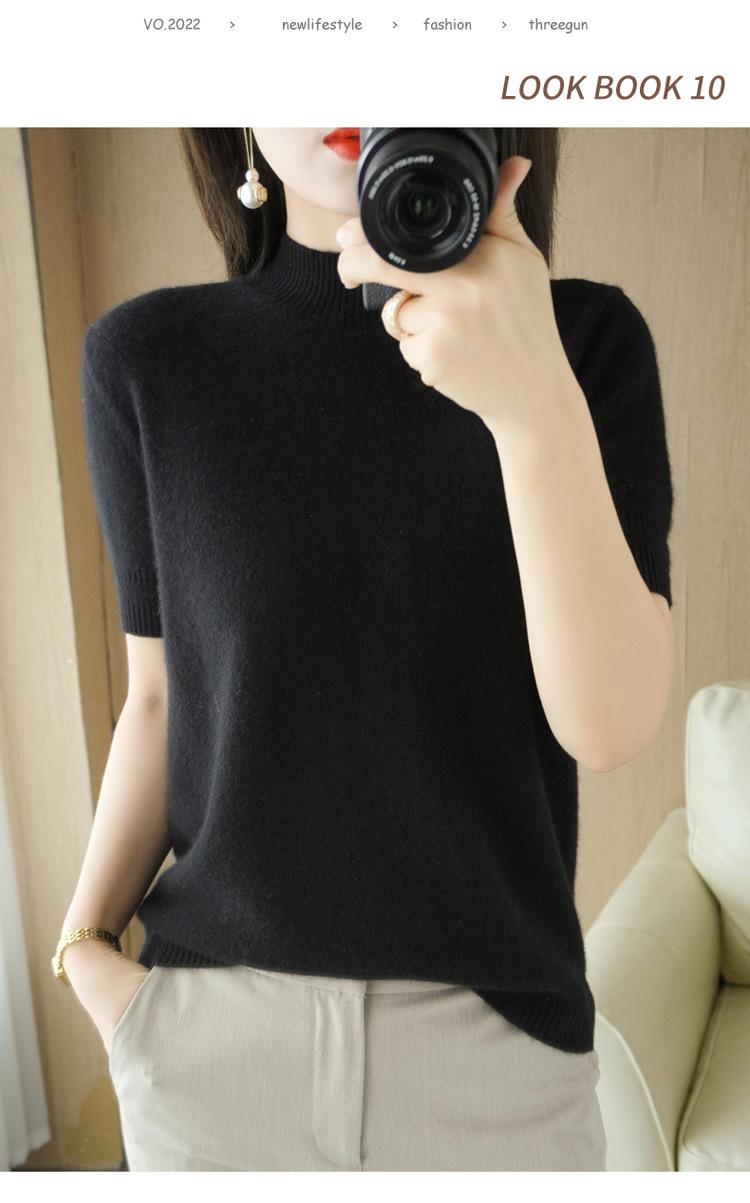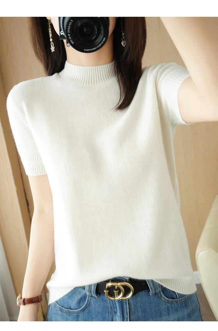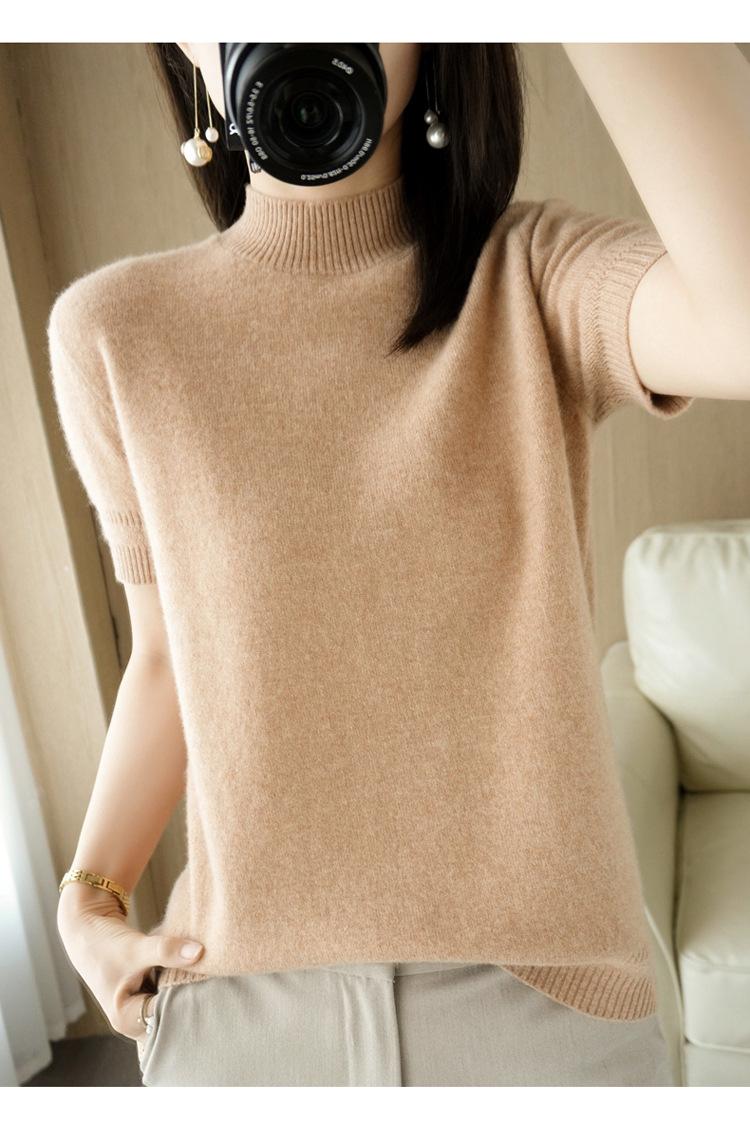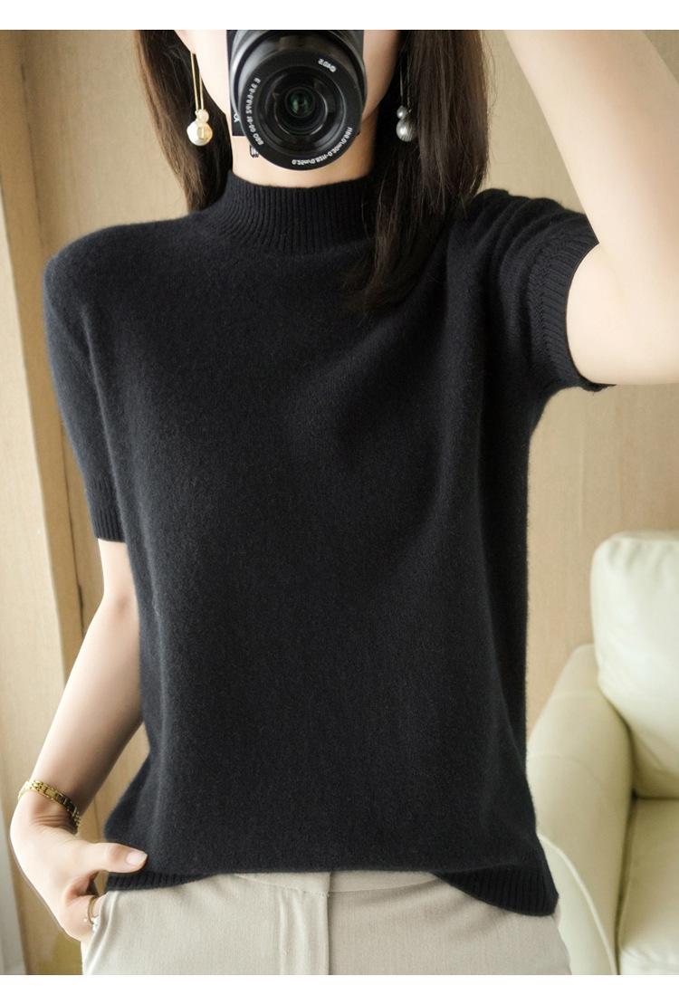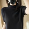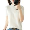 Camiseta básica de cuello alto de manga corta de punto de primavera para mujer, suéter ajustado adelgazante de moda, jersey con media manga interior.