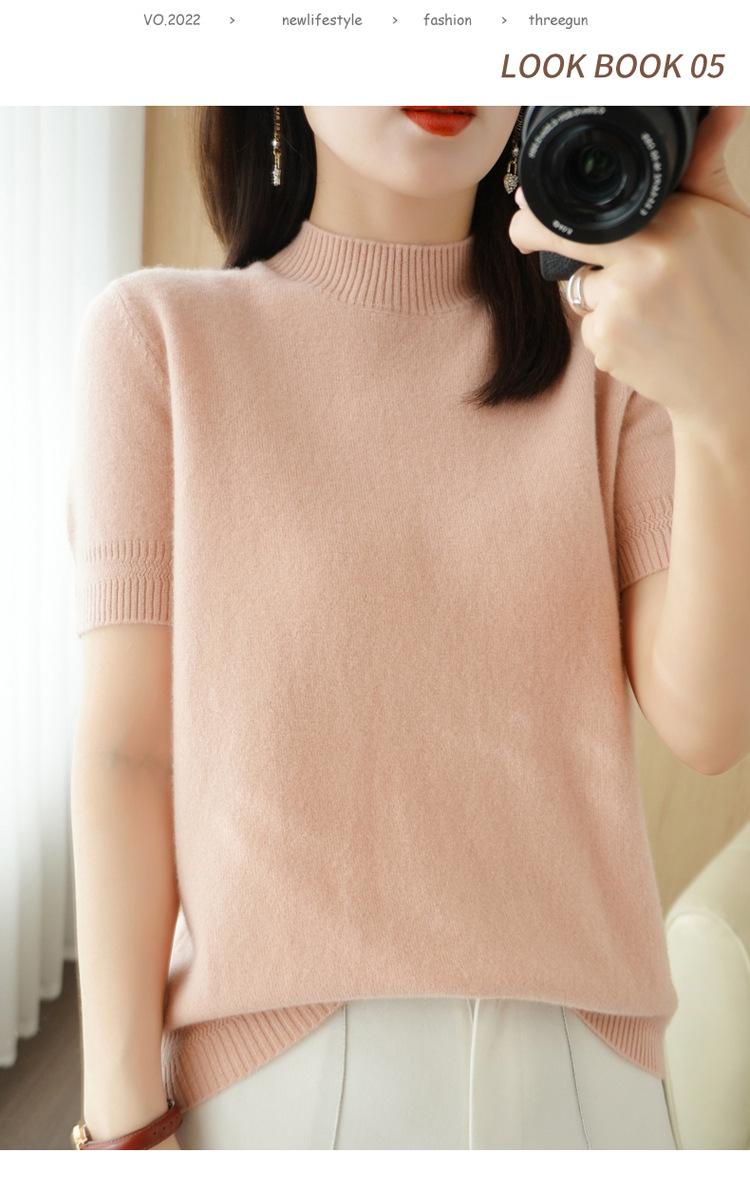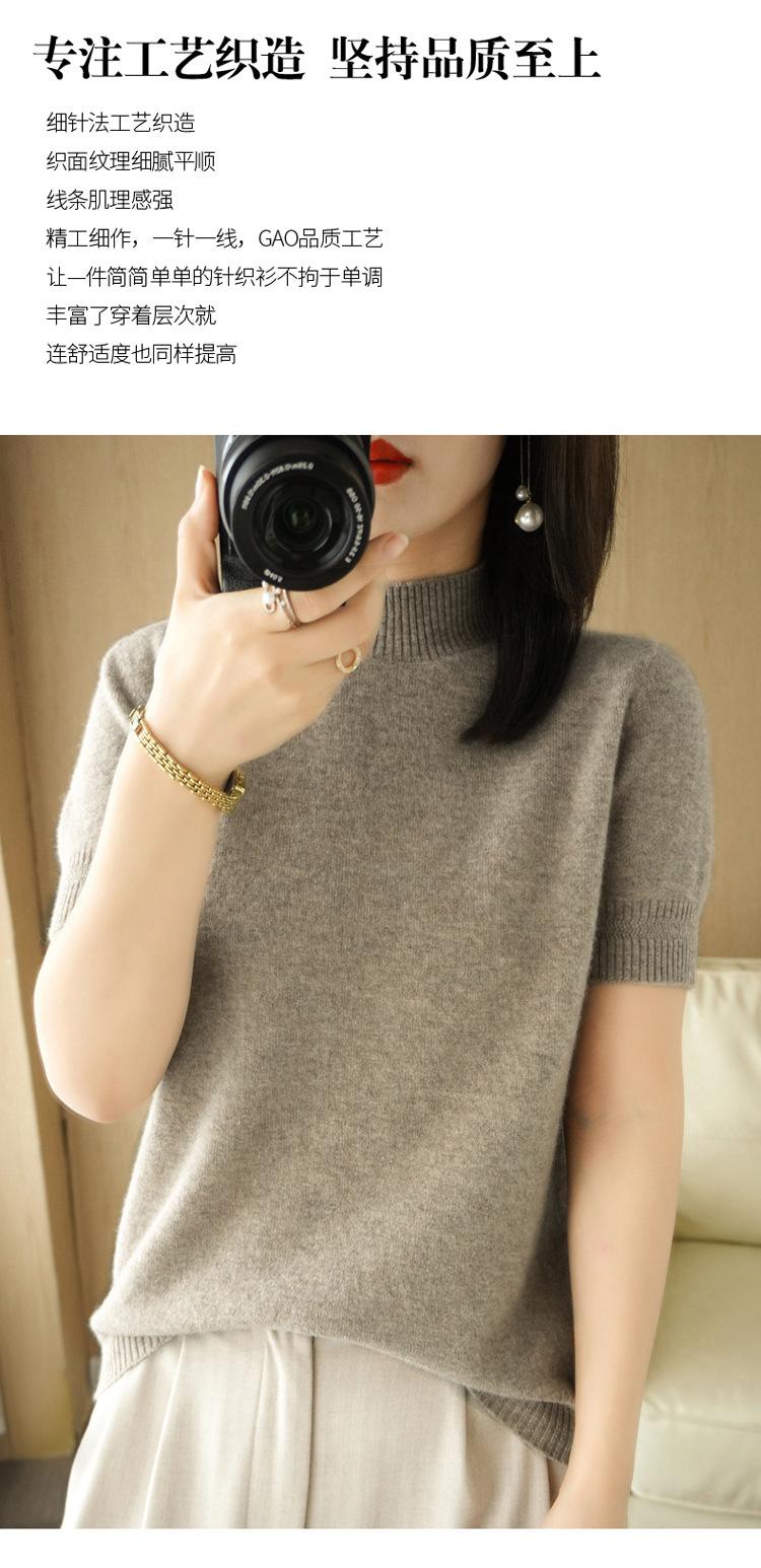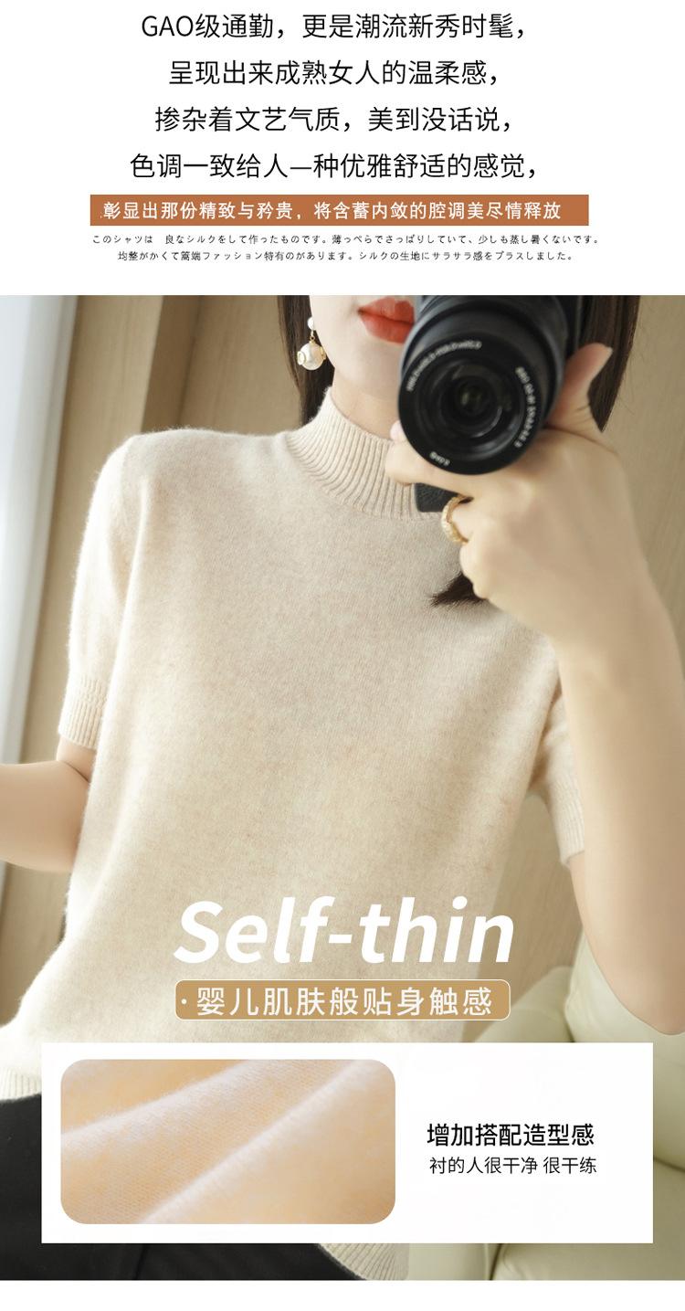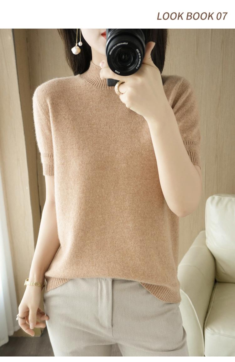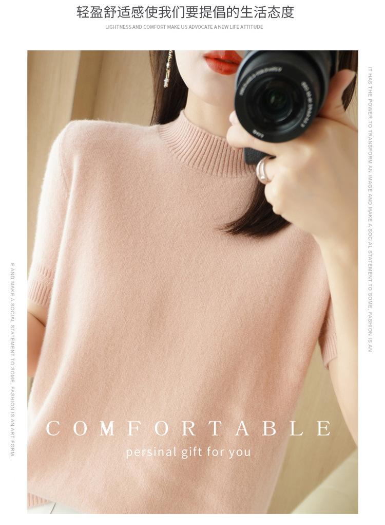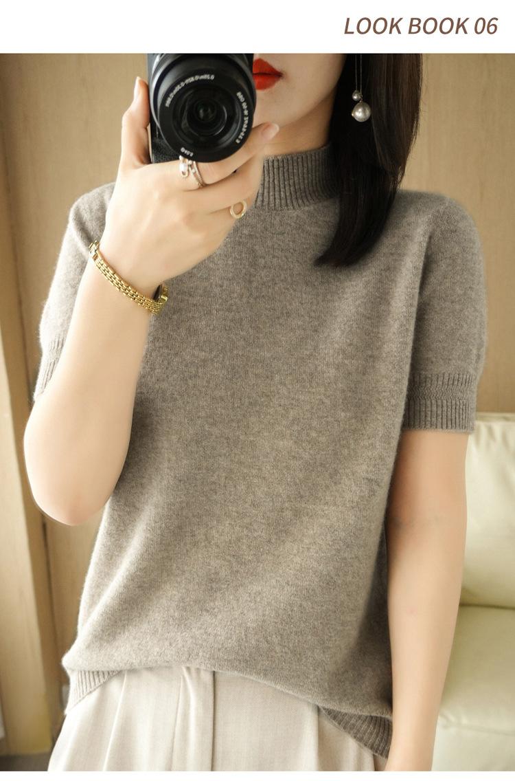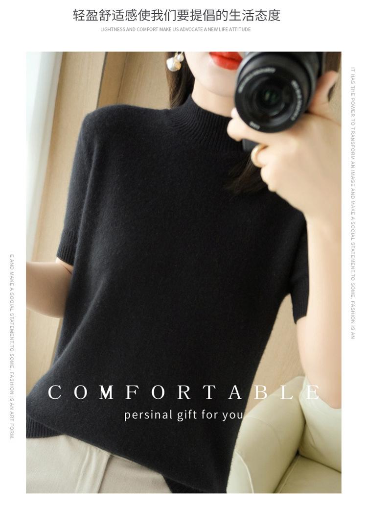 Camiseta básica de cuello alto de manga corta de punto de primavera para mujer, suéter ajustado adelgazante de moda, jersey con media manga interior.