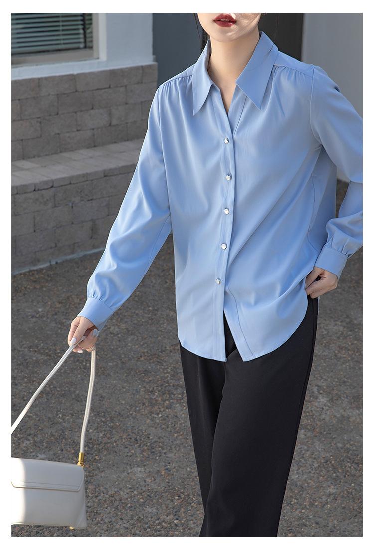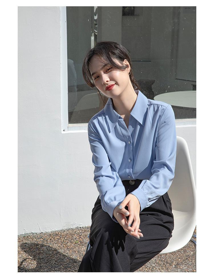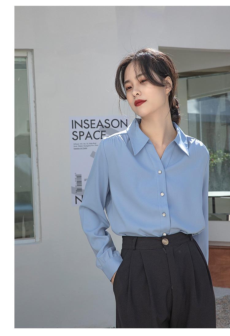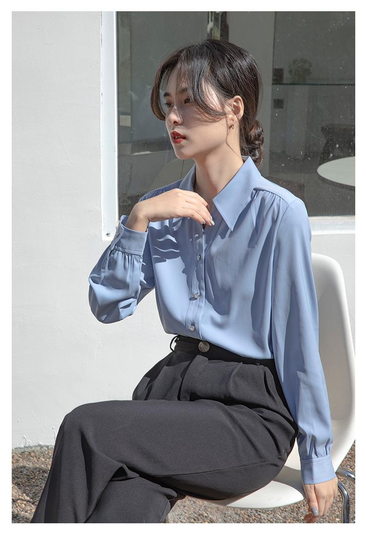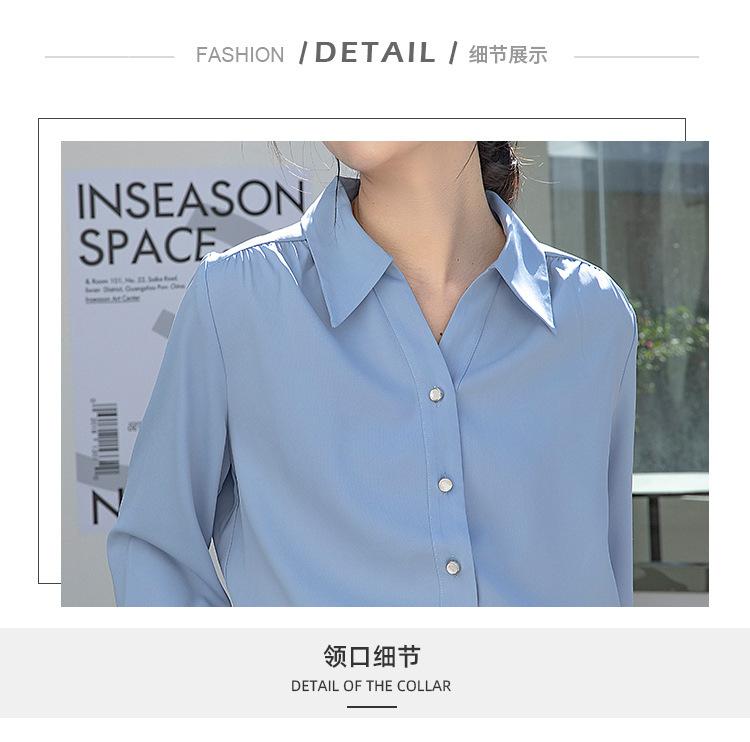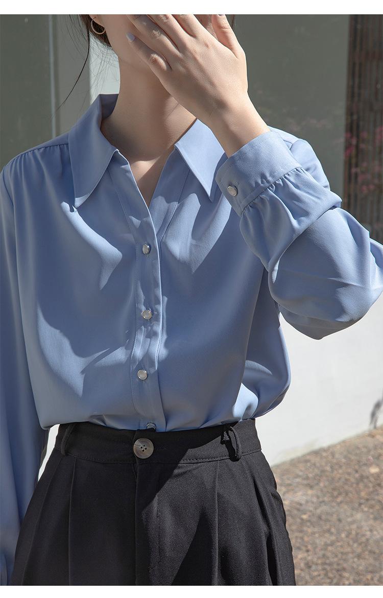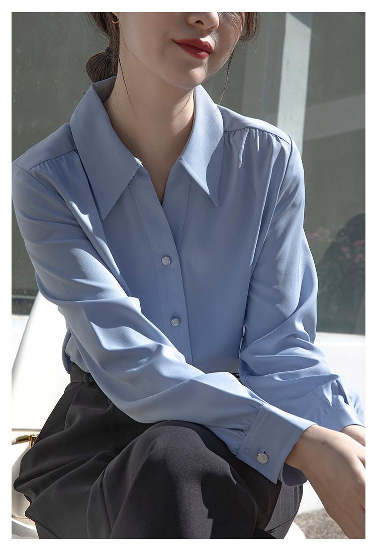 Camisa de gasa azul para mujer, de manga larga, con cuello en V, estilo otoñal, ideal para entrevistas formales profesionales.