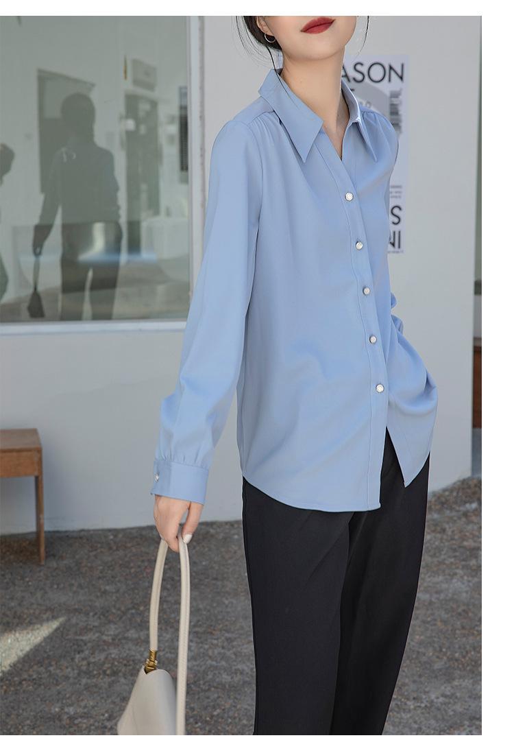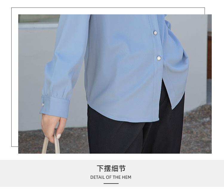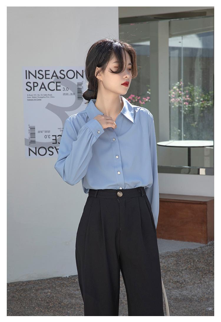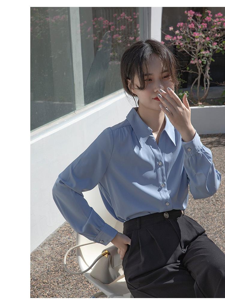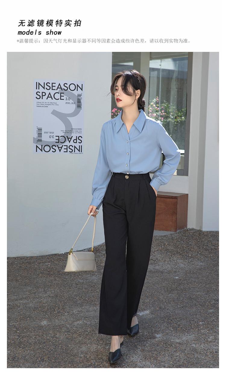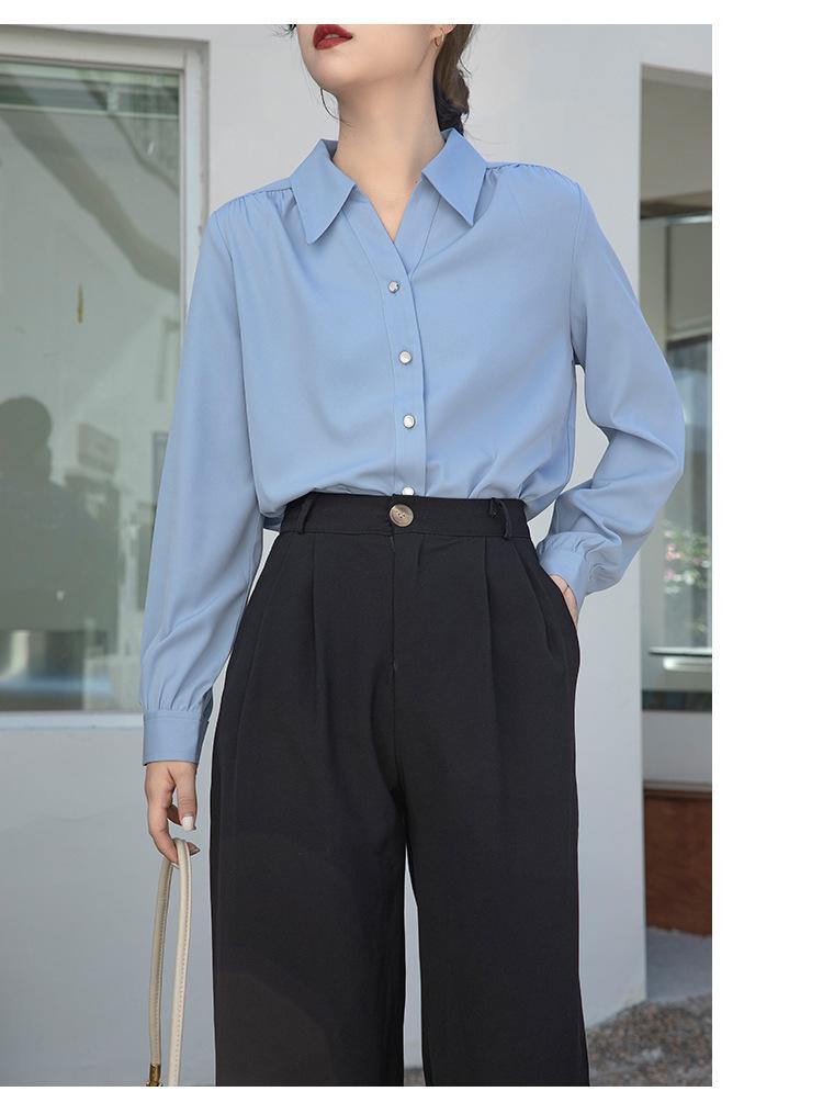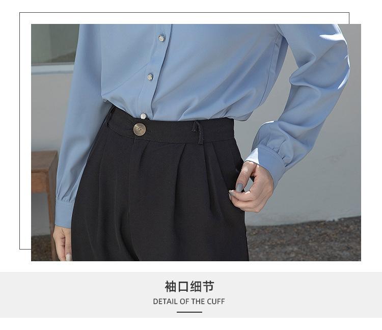 Camisa de gasa azul para mujer, de manga larga, con cuello en V, estilo otoñal, ideal para entrevistas formales profesionales.
