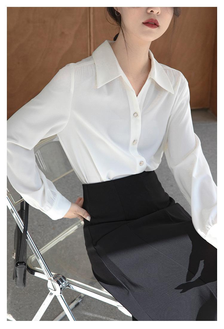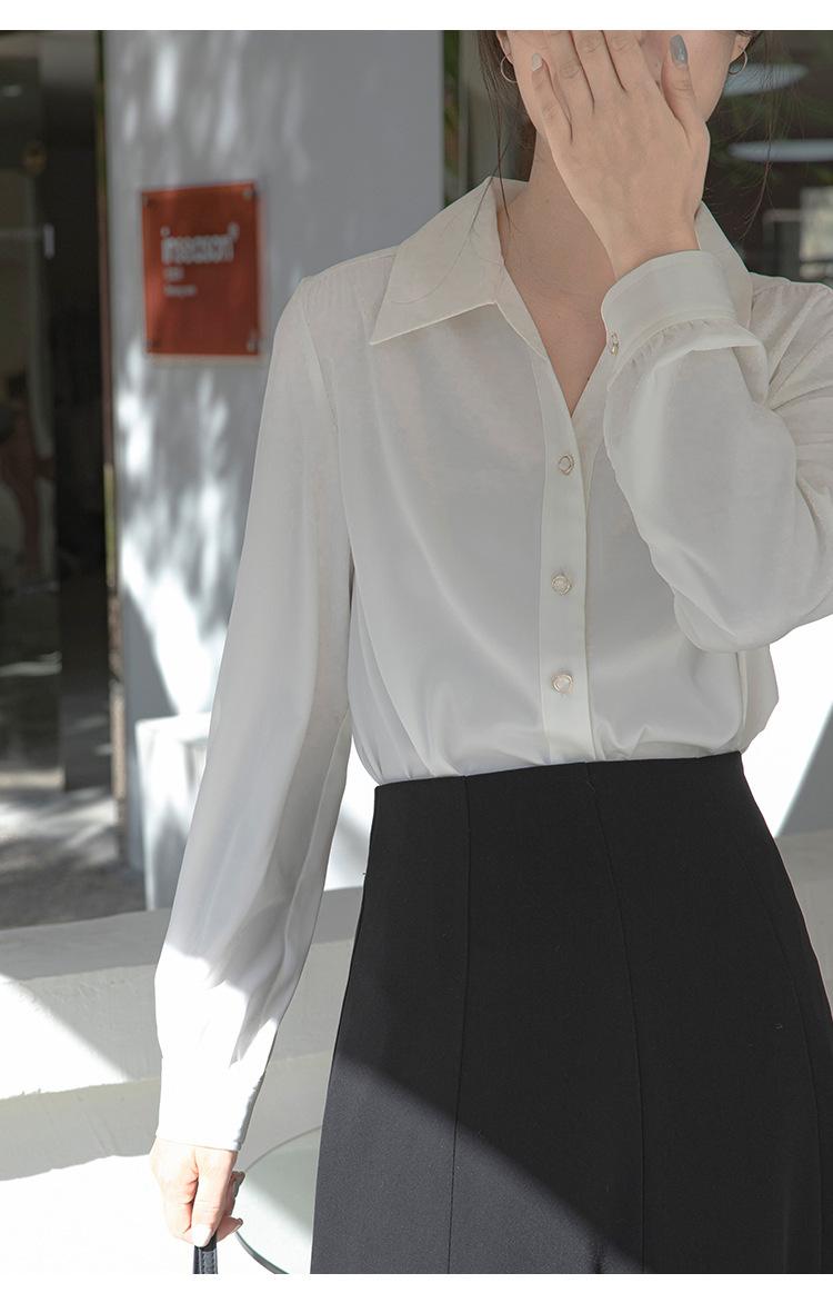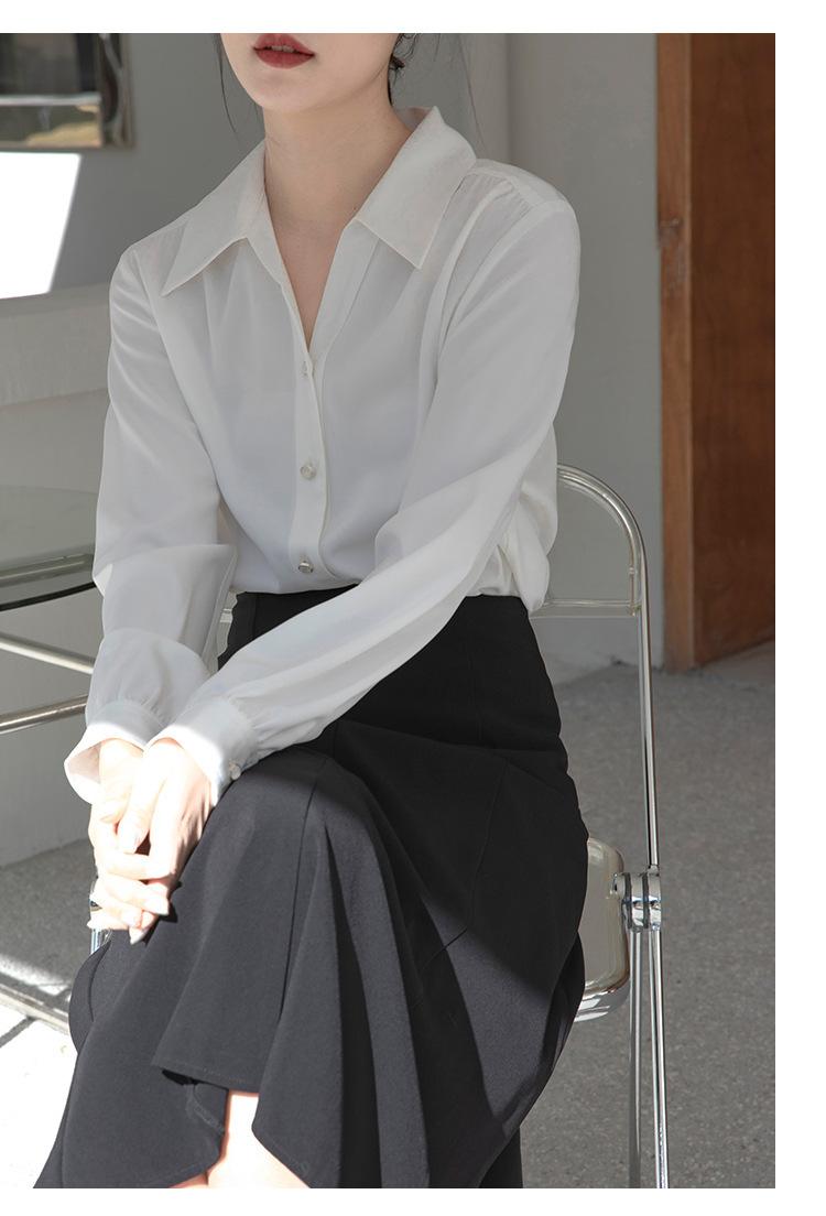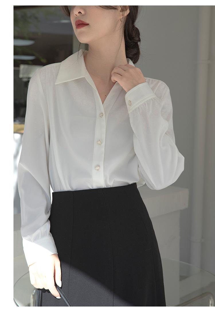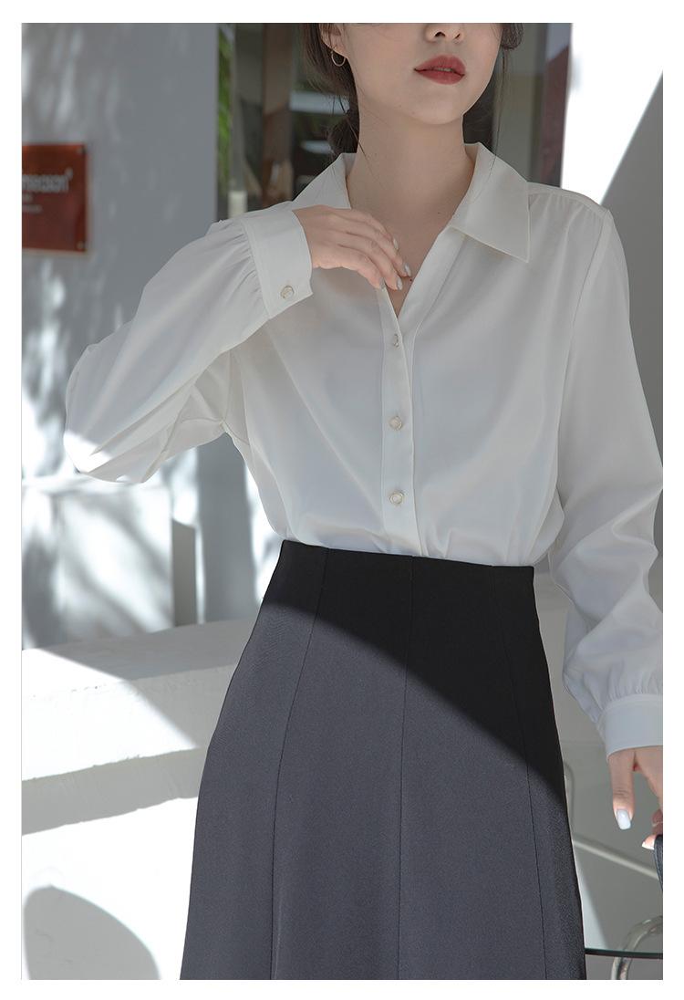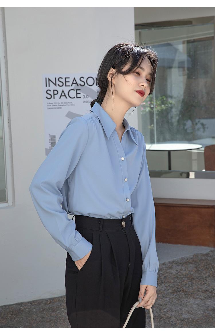 Camisa de gasa azul para mujer, de manga larga, con cuello en V, estilo otoñal, ideal para entrevistas formales profesionales.