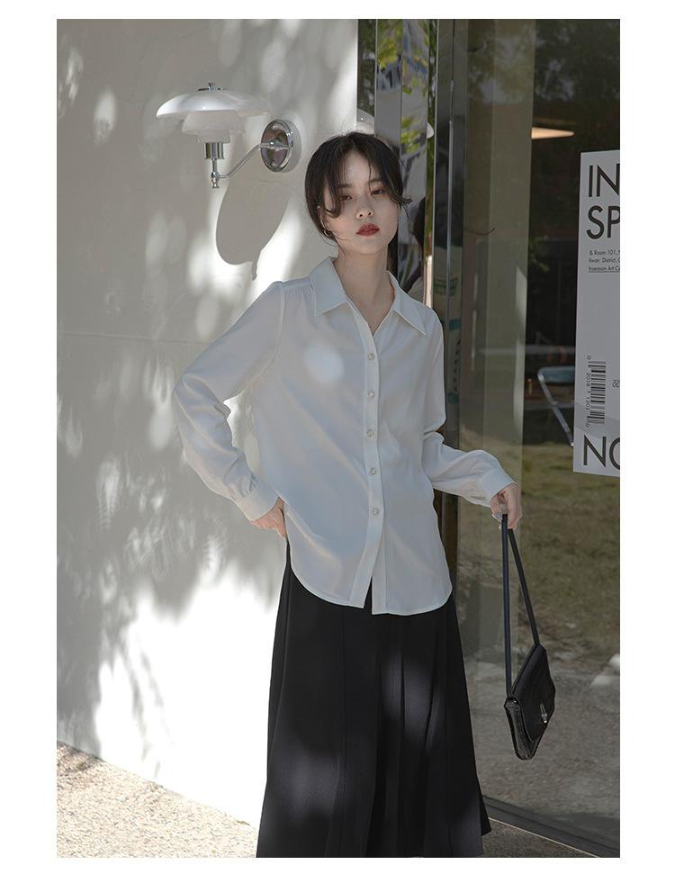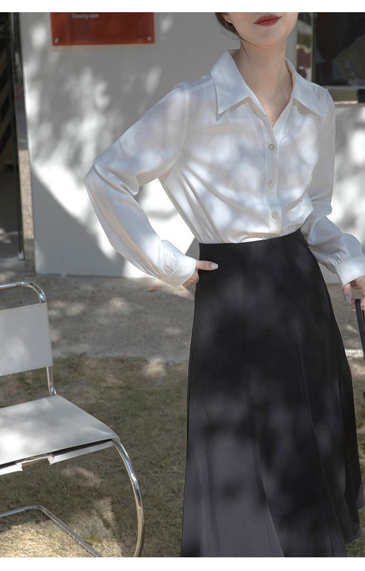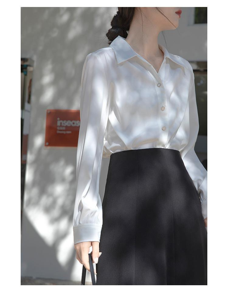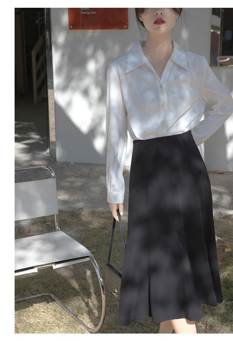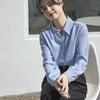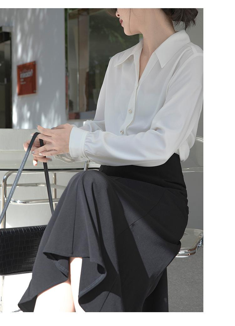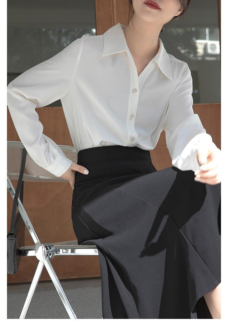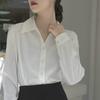 Camisa de gasa azul para mujer, de manga larga, con cuello en V, estilo otoñal, ideal para entrevistas formales profesionales.