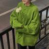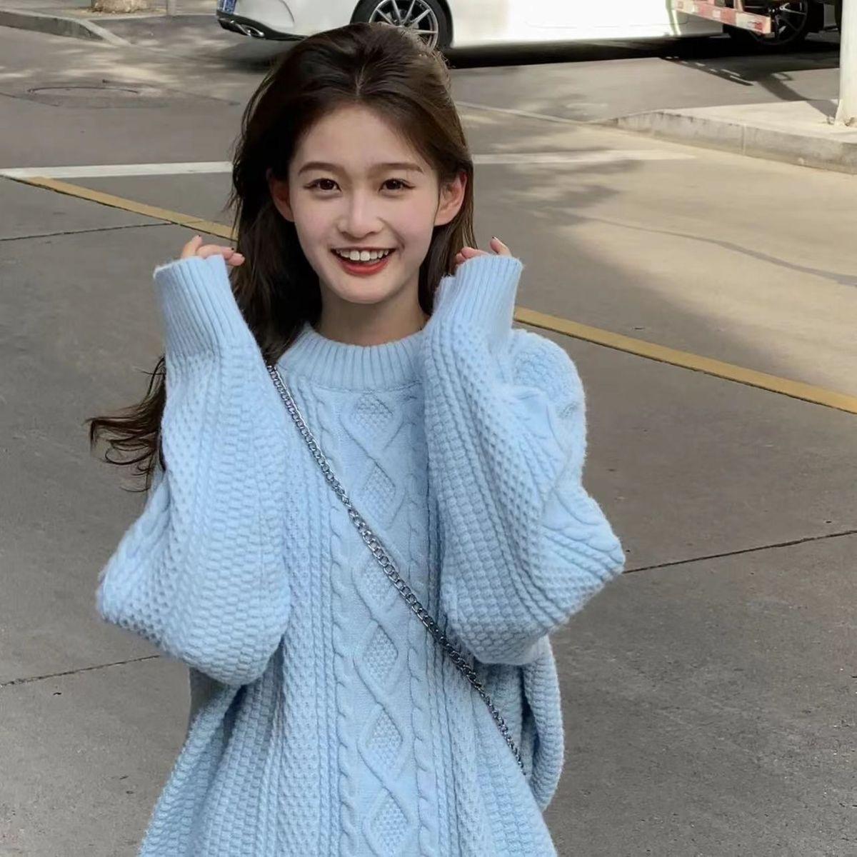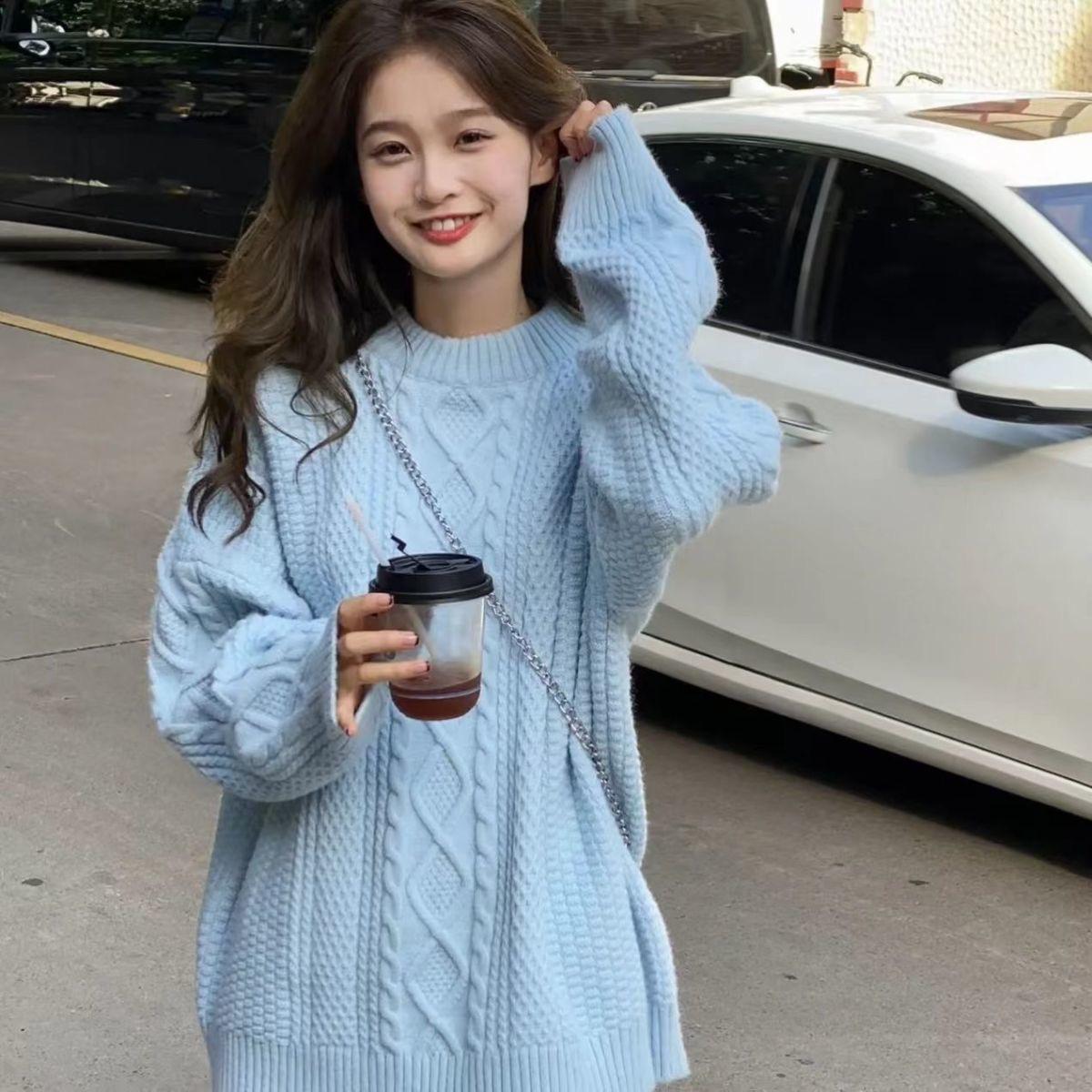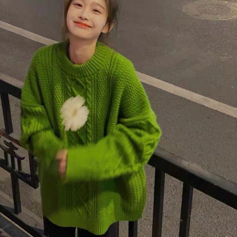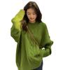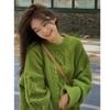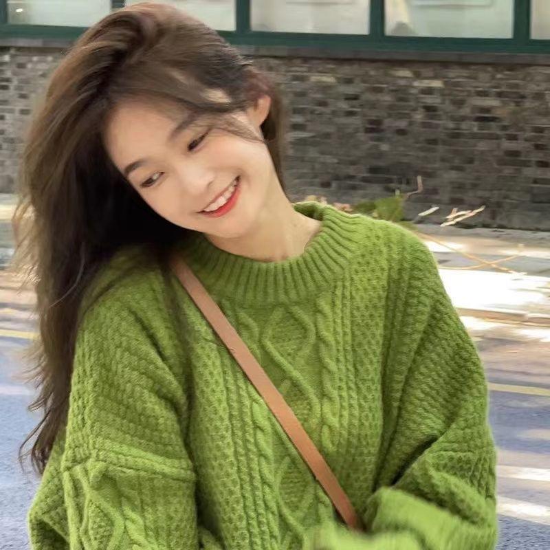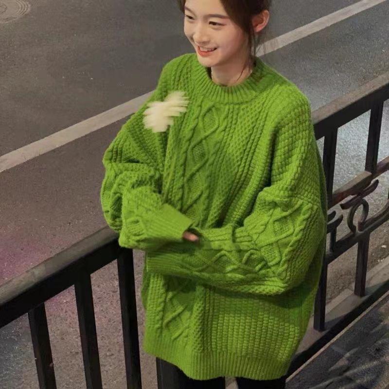 Suéter Verde Trenzado para Mujer Otoño e Invierno Engrosado Retro Estilo Coreano Relajado Holgado Jersey Tejido Top Falta Parte Inferior