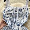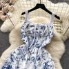Vestido de tirantes con estampado floral de hadas francesas transfronterizas para mujer, falda elegante de estilo playero para vacaciones de verano y cintura alta.