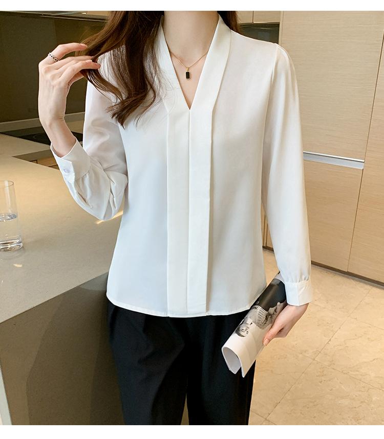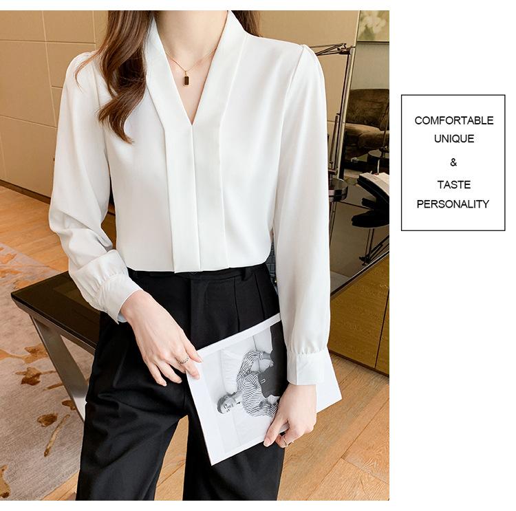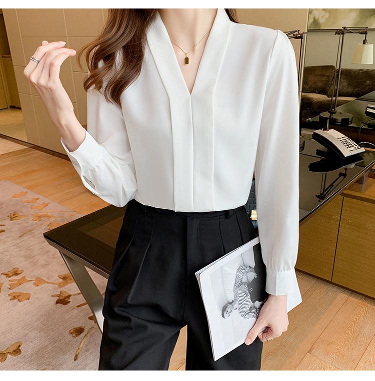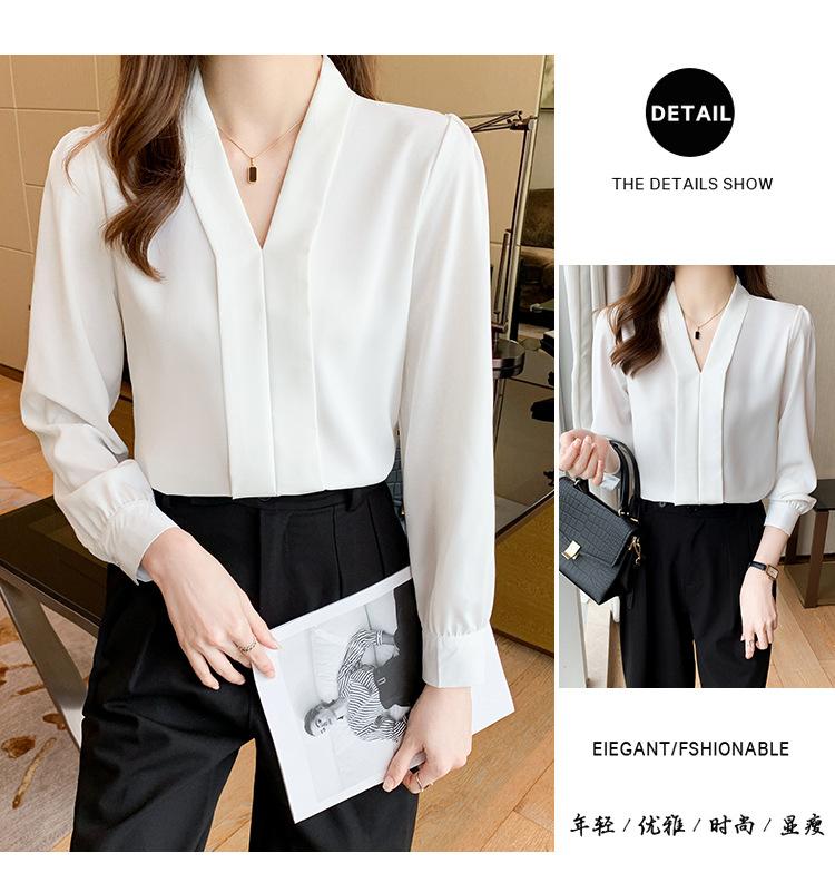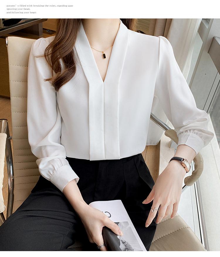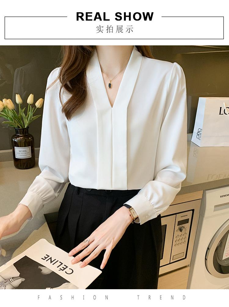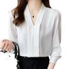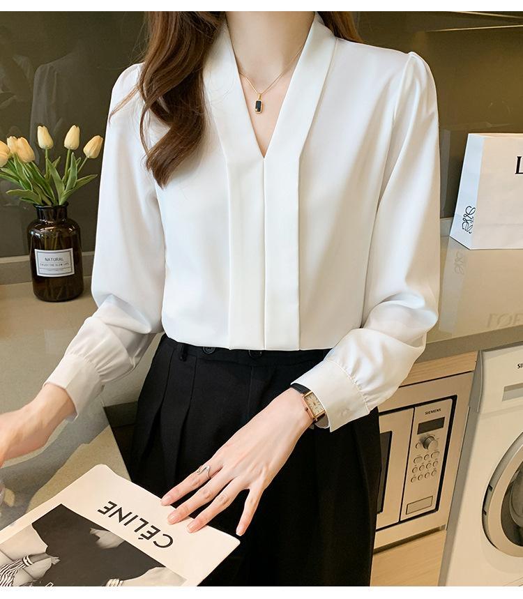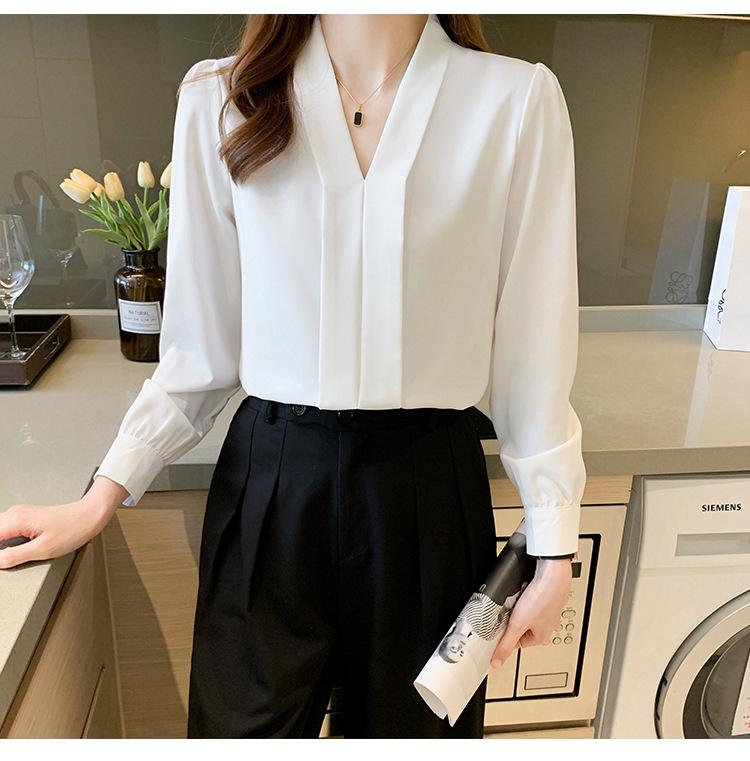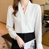 Camisa de satén con cuello en V blanca de moda de otoño, blusa holgada de manga larga para mujer, blusa versátil para uso profesional.