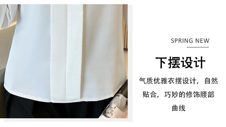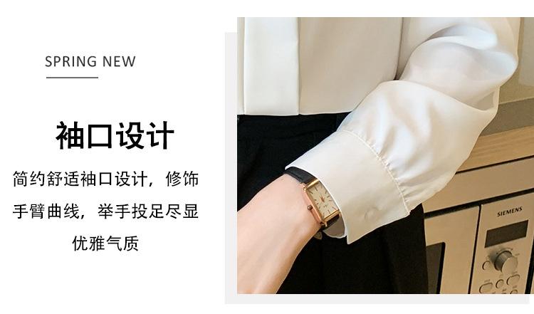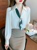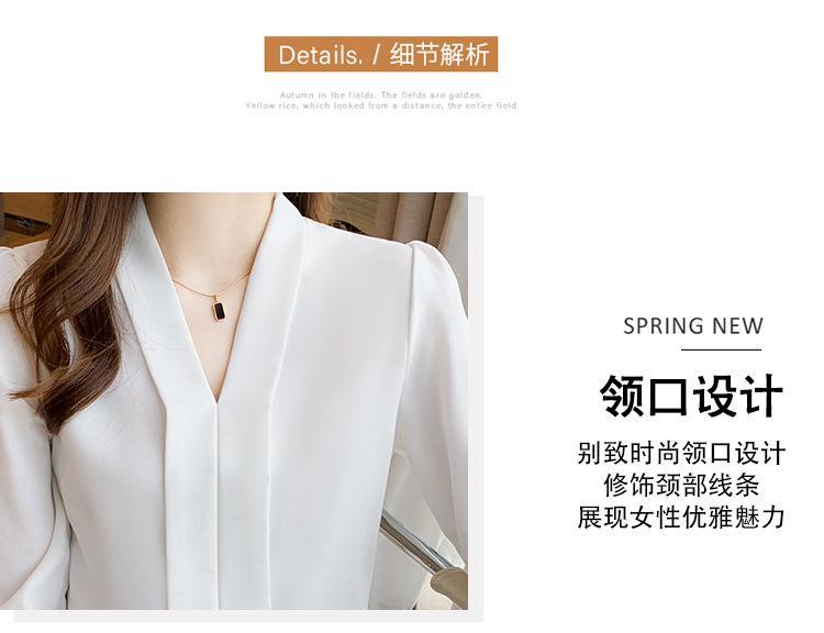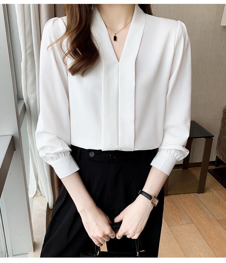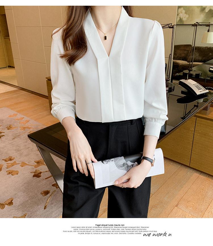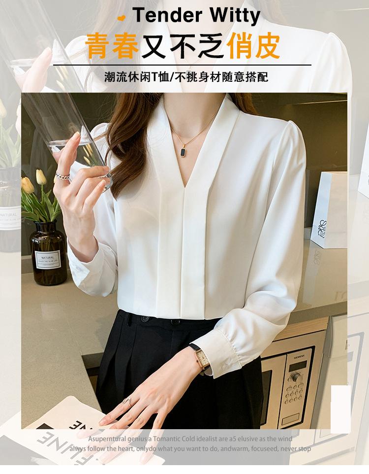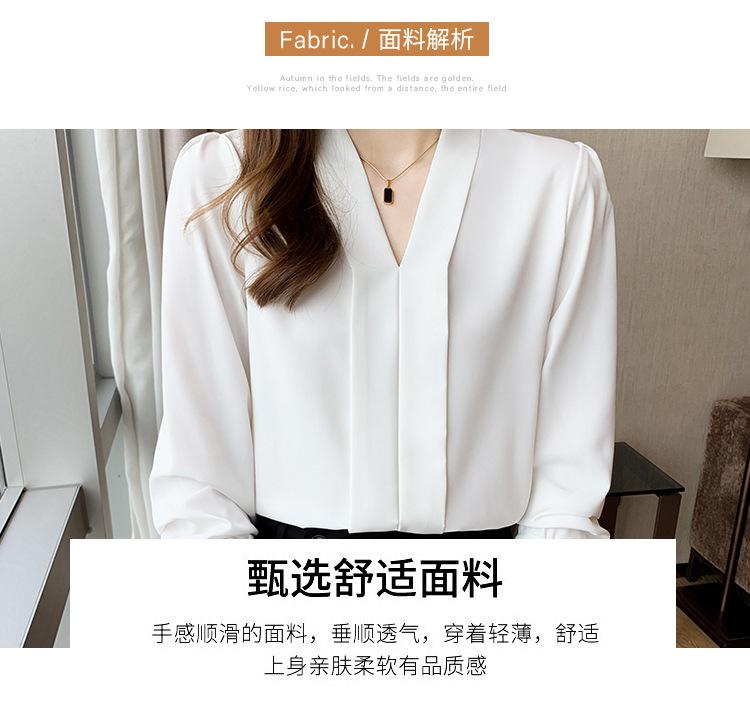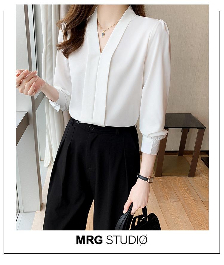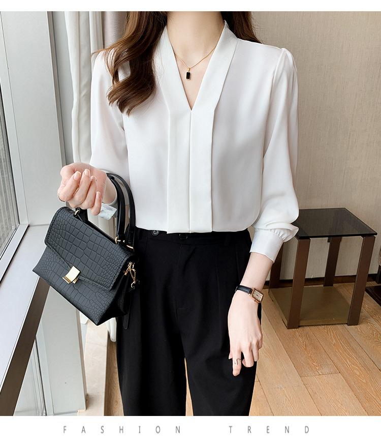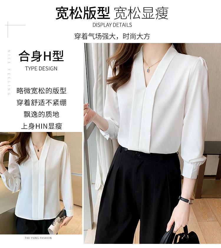 Camisa de satén con cuello en V blanca de moda de otoño, blusa holgada de manga larga para mujer, blusa versátil para uso profesional.