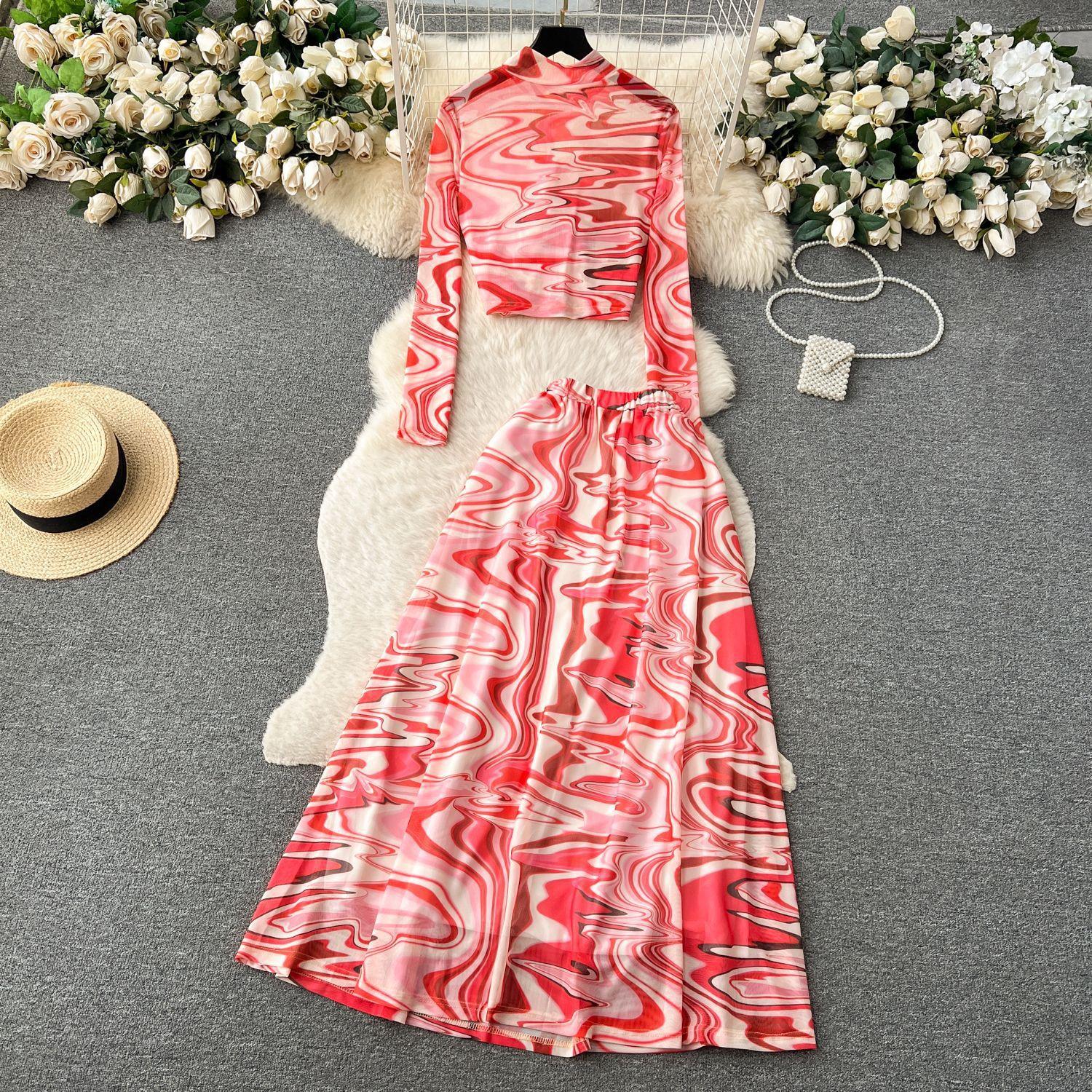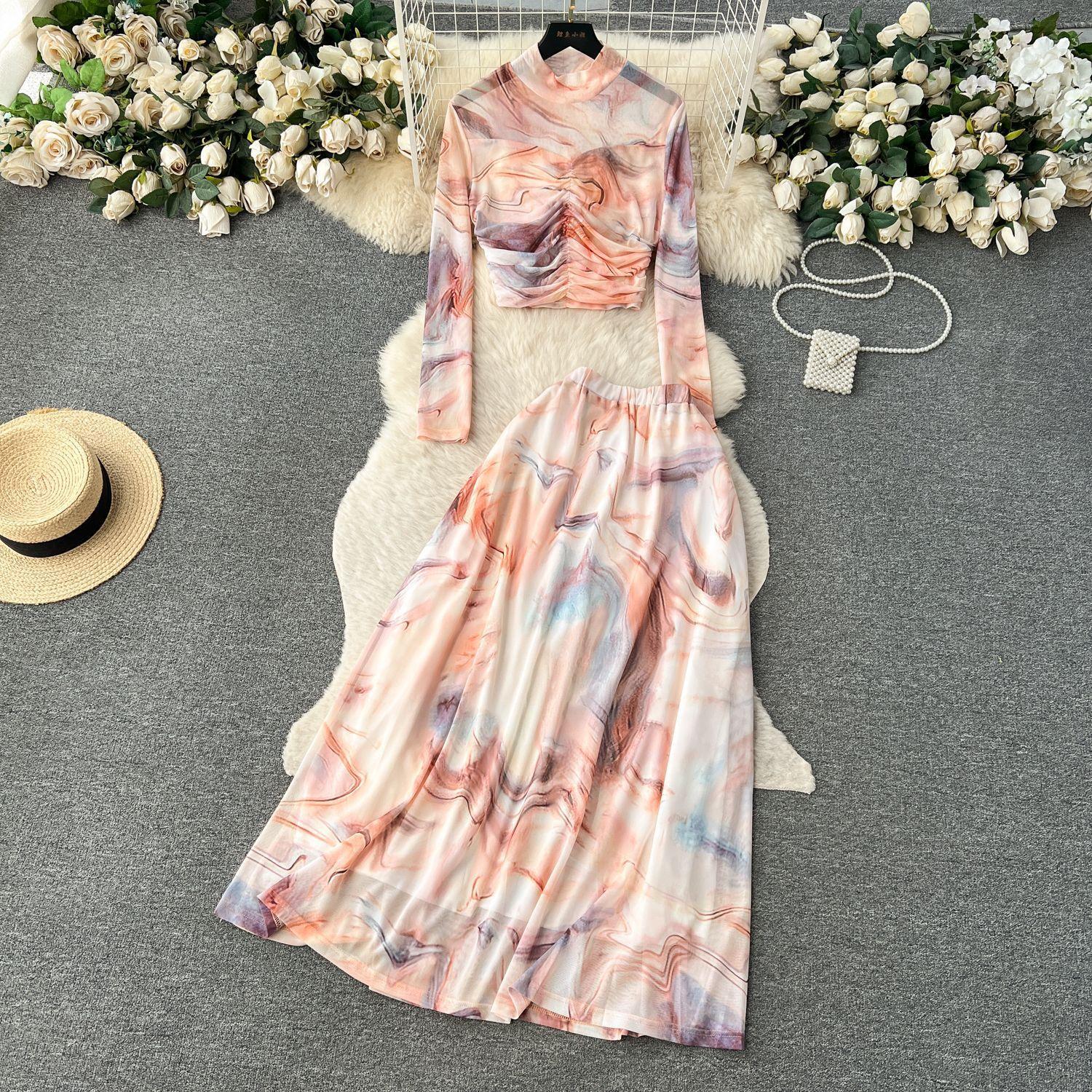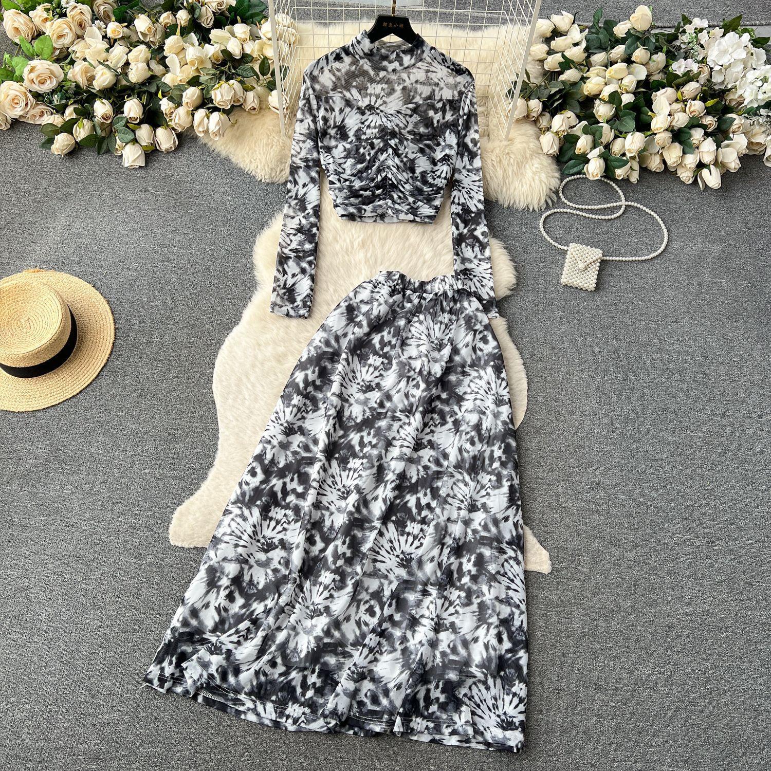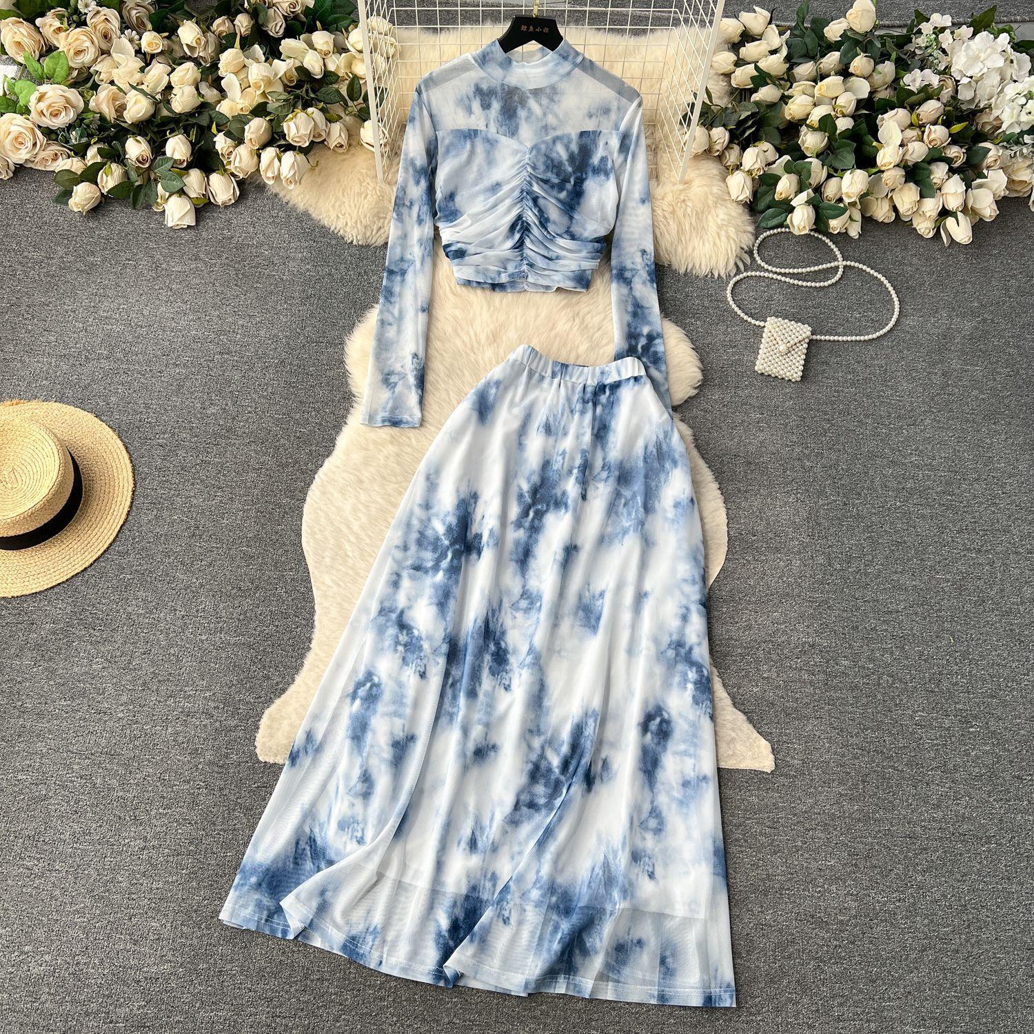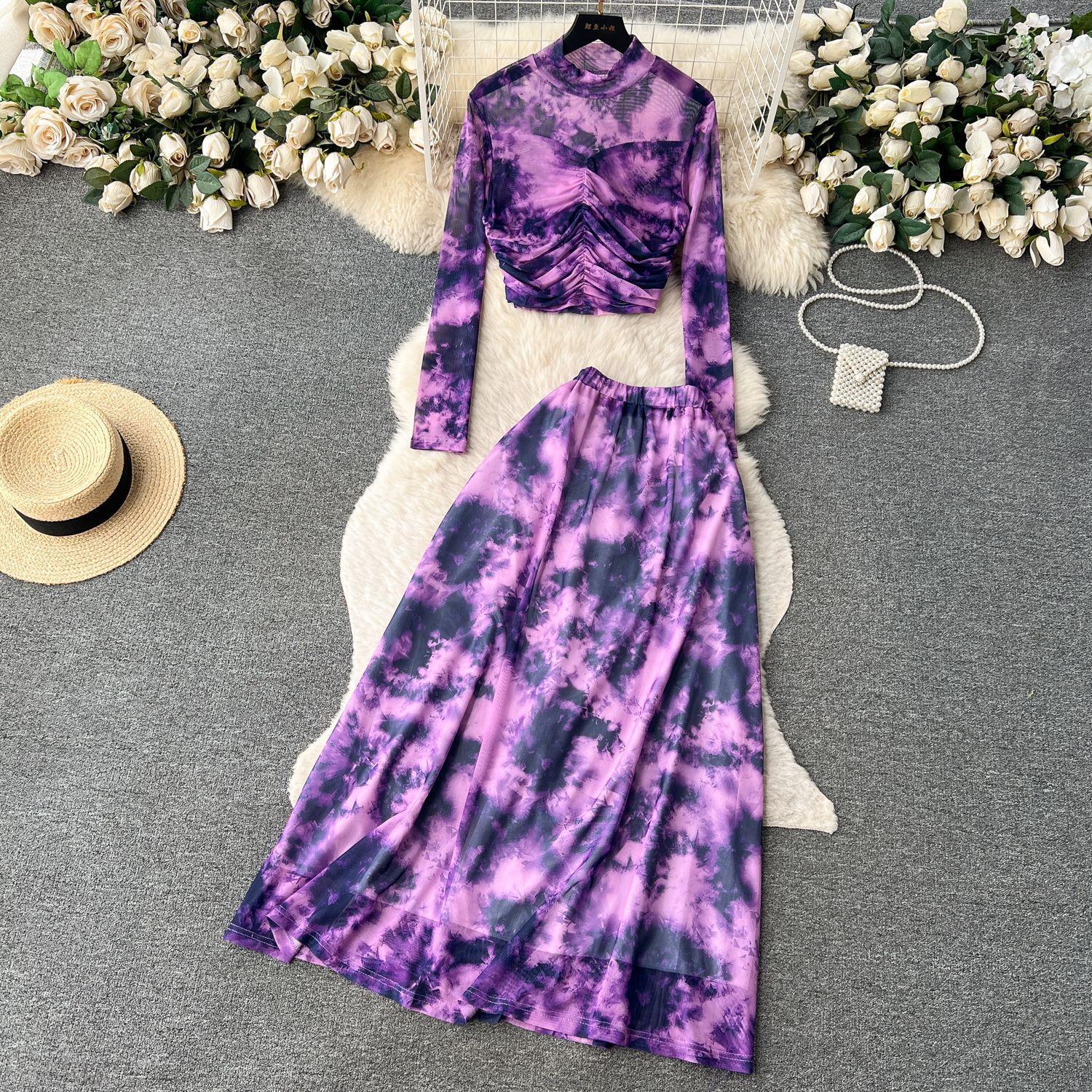Estilo europeo y americano 2023 nuevo top de malla de manga corta y larga para chica pura y sexy, falda de cintura alta, traje moderno tie-dye