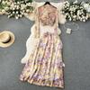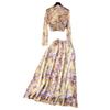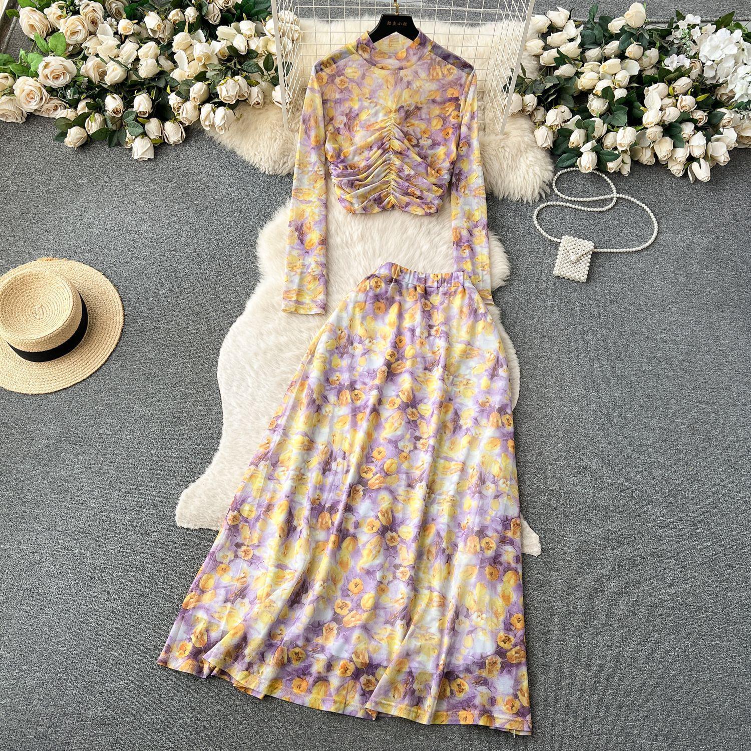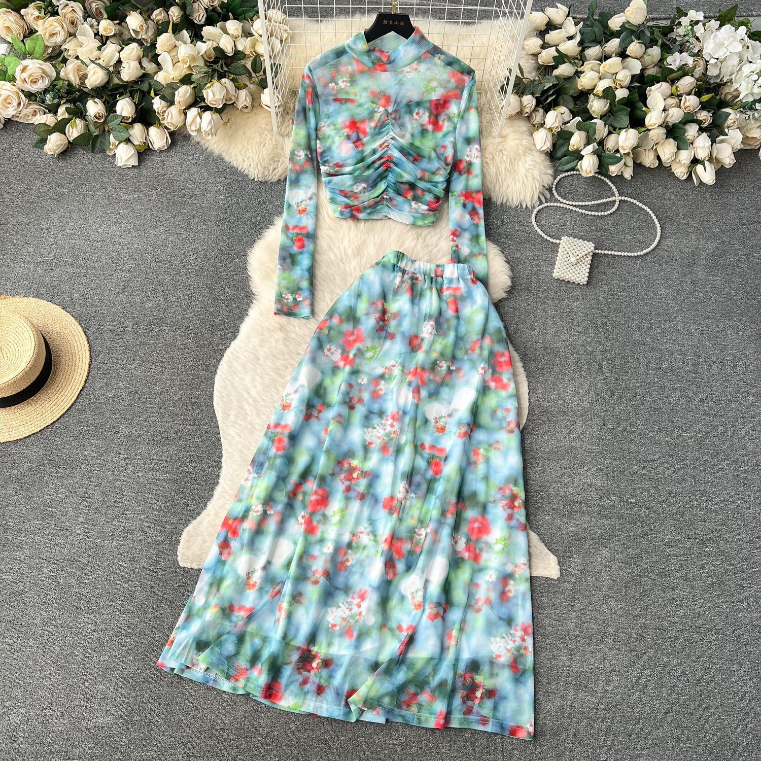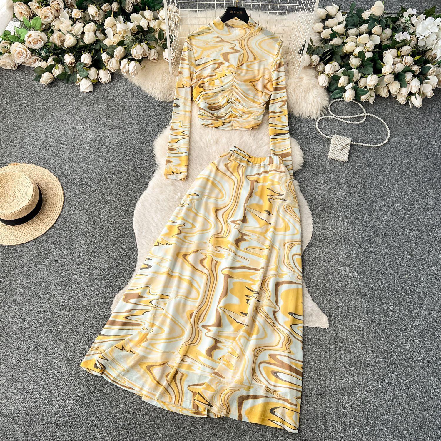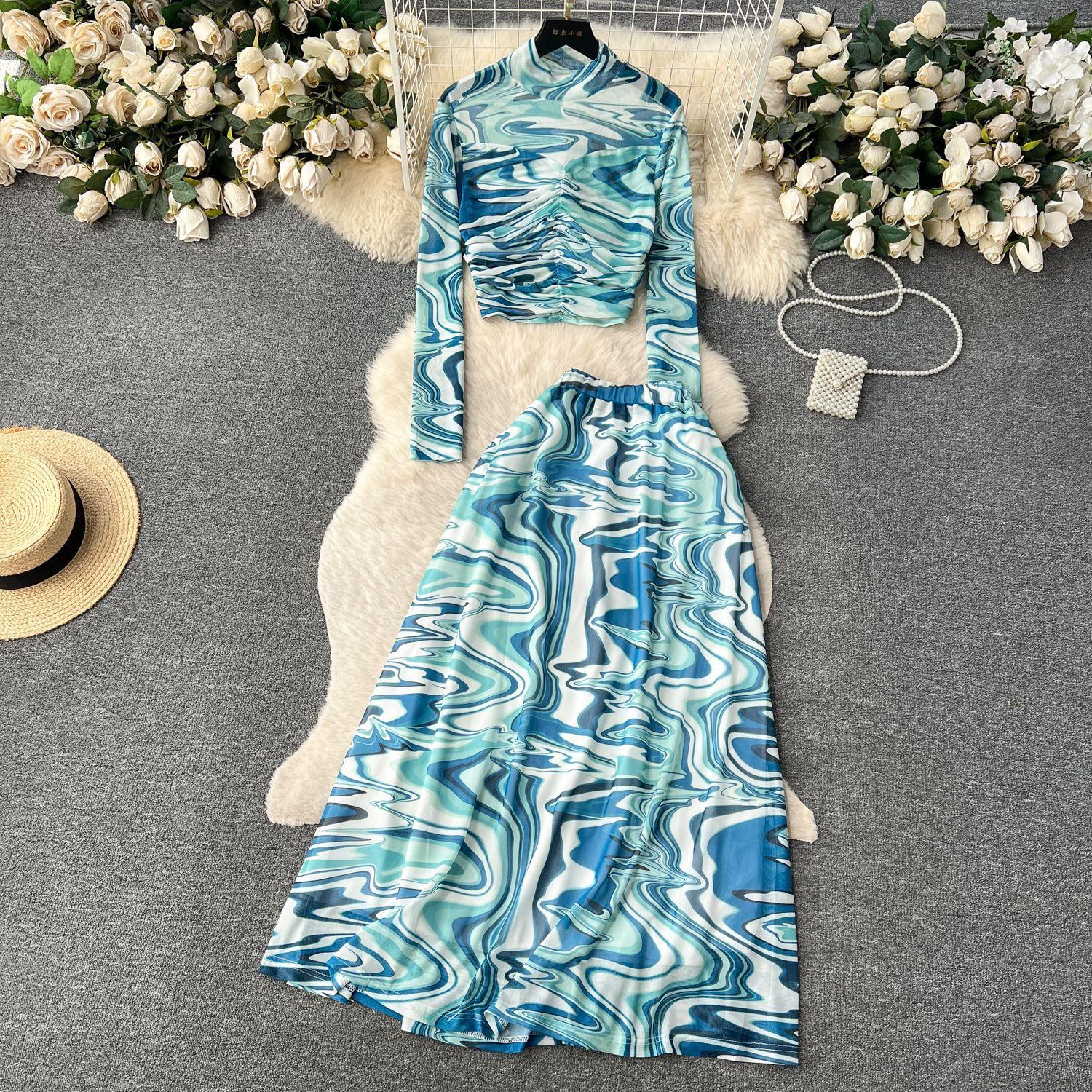 Estilo europeo y americano 2023 nuevo top de malla de manga corta y larga para chica pura y sexy, falda de cintura alta, traje moderno tie-dye