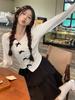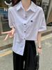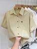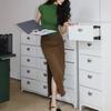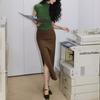 Camiseta verde de manga corta para mujer 2024, nuevo diseño de nicho, hermosa camiseta de estilo occidental ajustada con cuello vertical y hombros descubiertos.