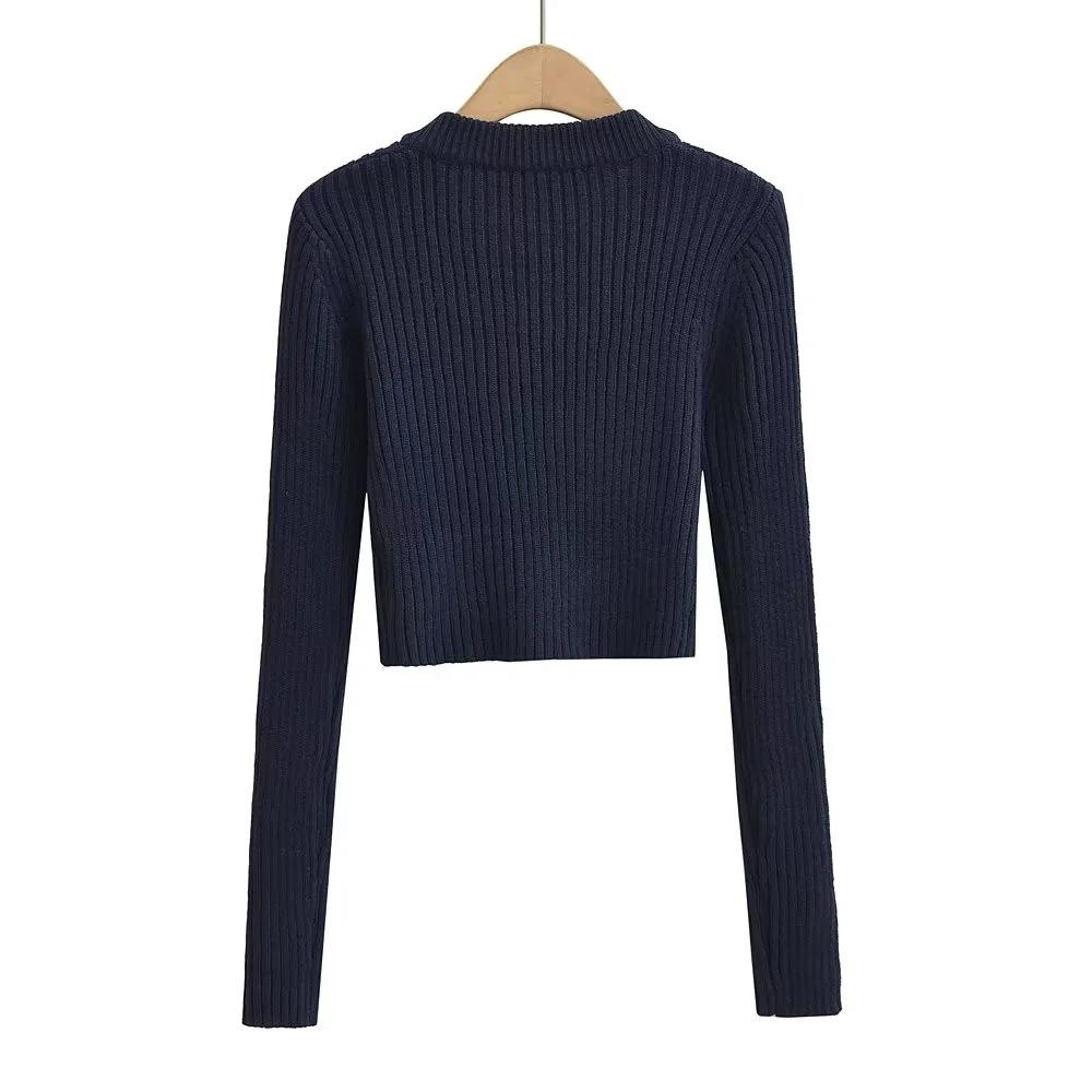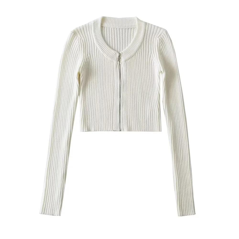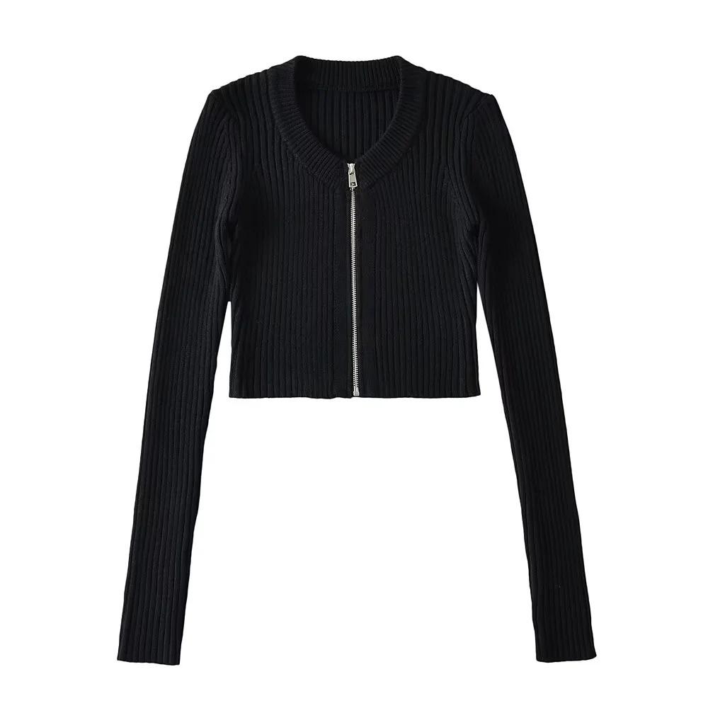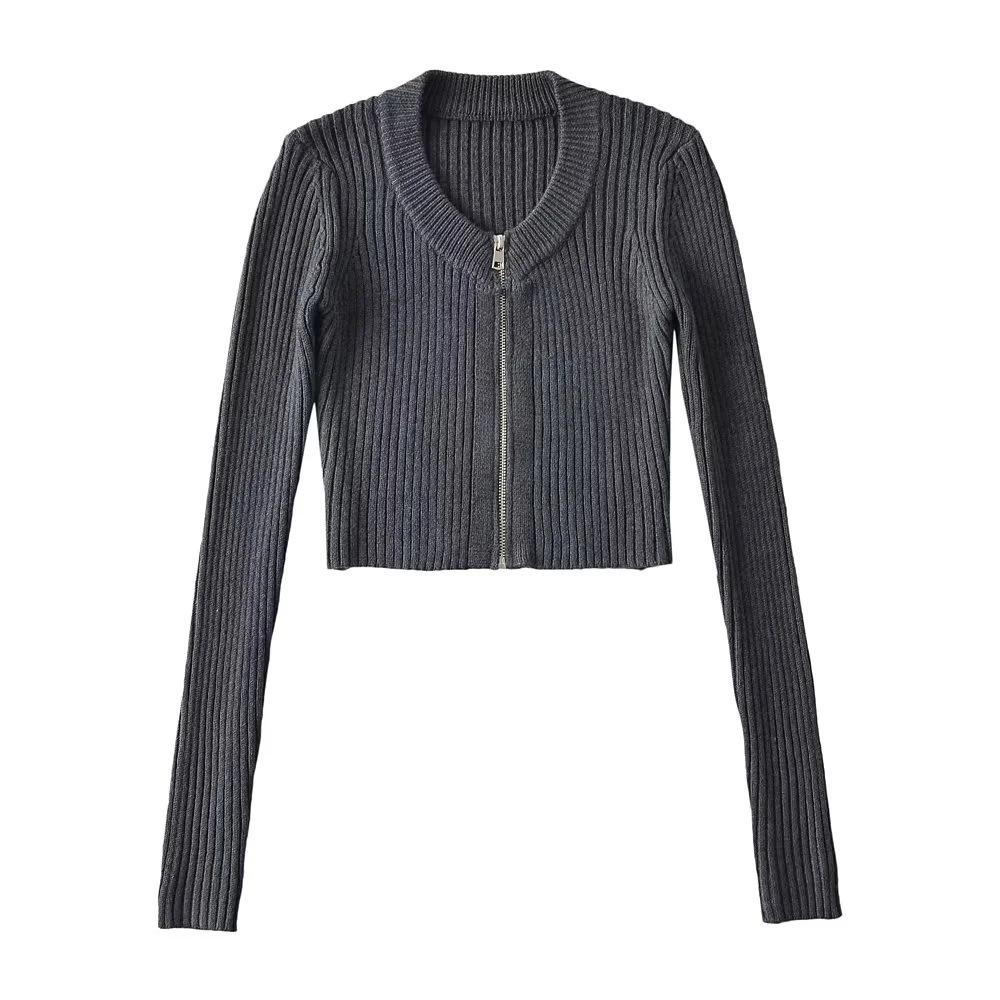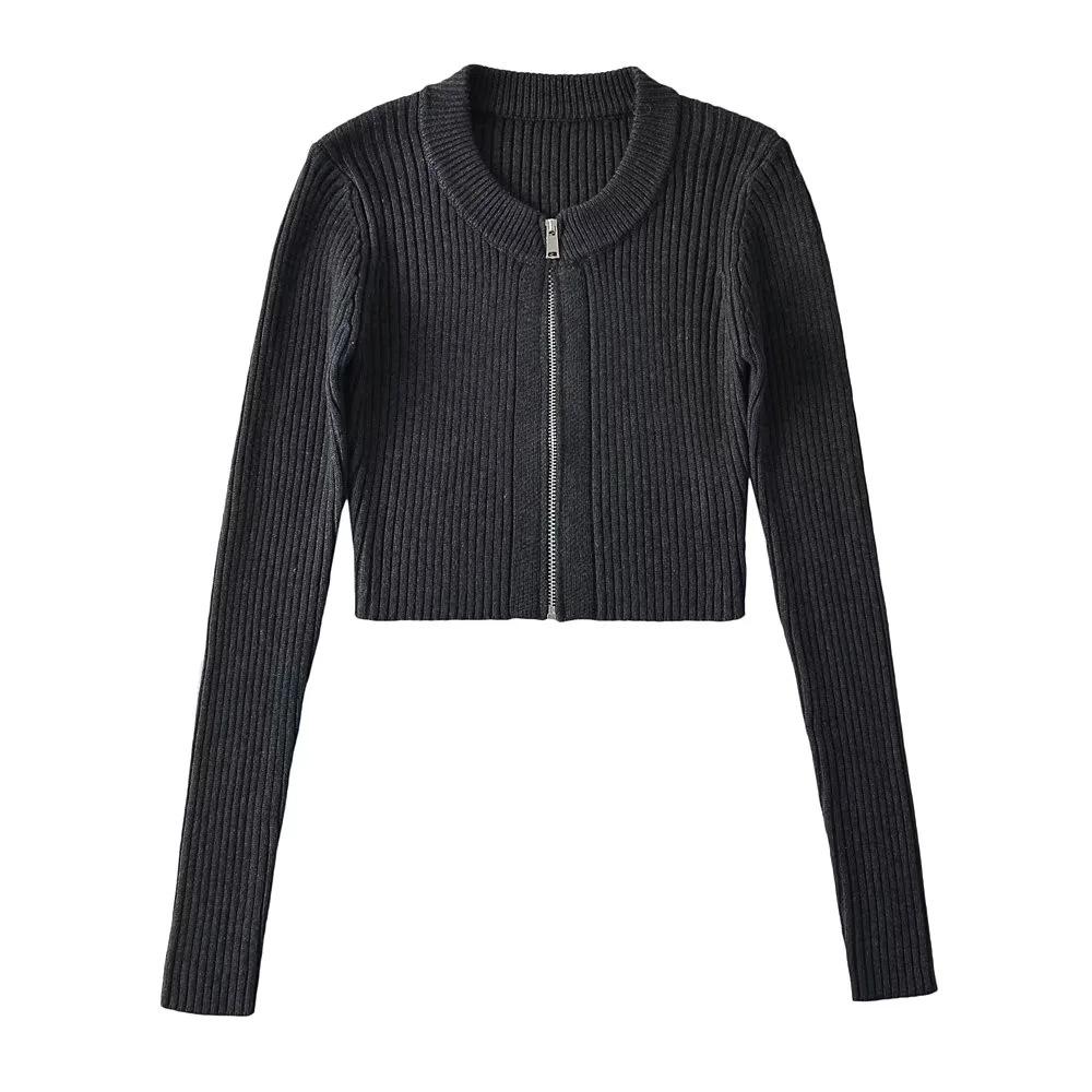 Nuevo Top Corto de Punto de Canalé Vertical de Cuello Redondo Europeo y Americano para Otoño e Invierno 2022 Trenzado Ajustado Adelgazante con Cierre de Cremallera Suéter de Punto