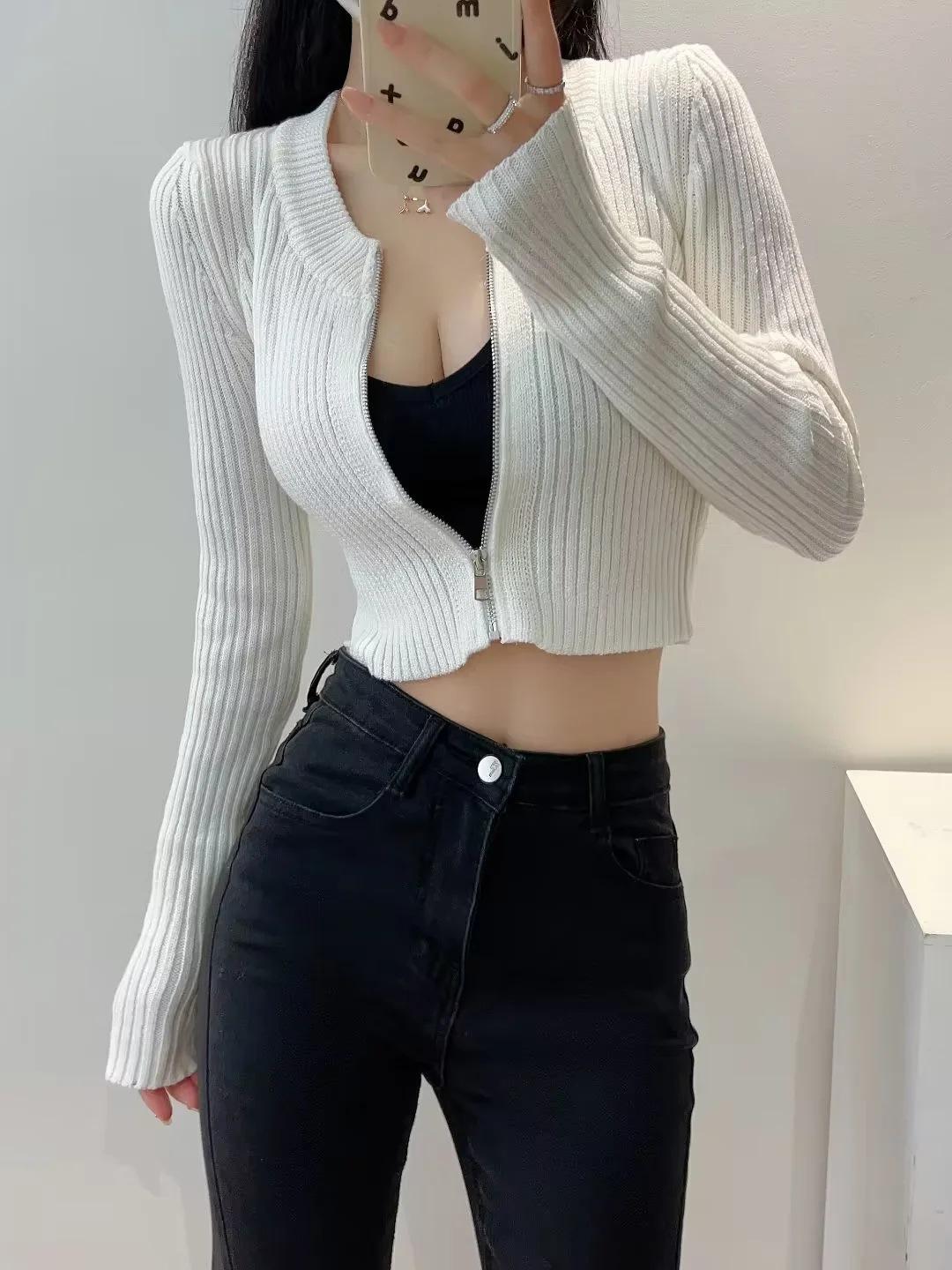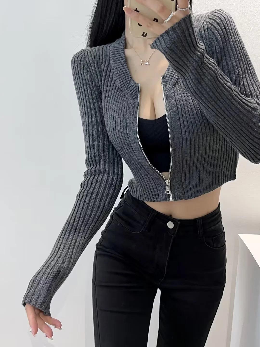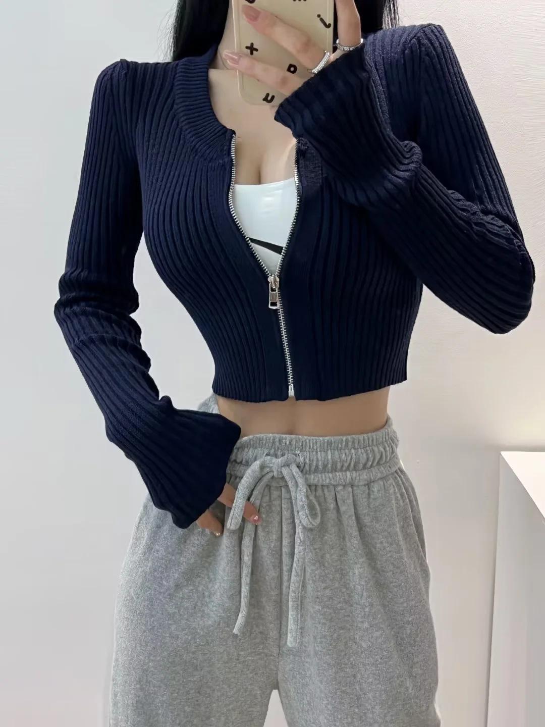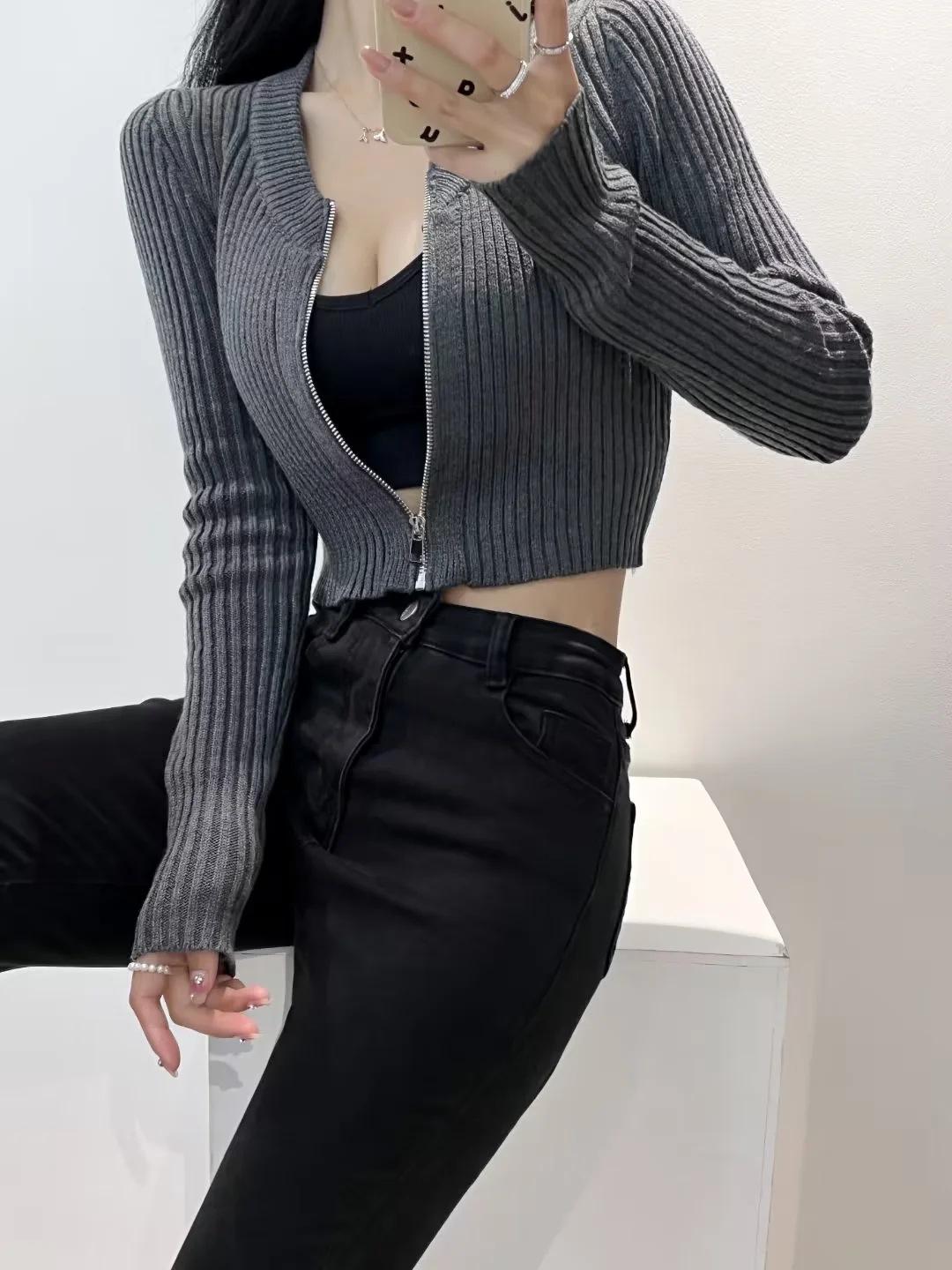 Nuevo Top Corto de Punto de Canalé Vertical de Cuello Redondo Europeo y Americano para Otoño e Invierno 2022 Trenzado Ajustado Adelgazante con Cierre de Cremallera Suéter de Punto