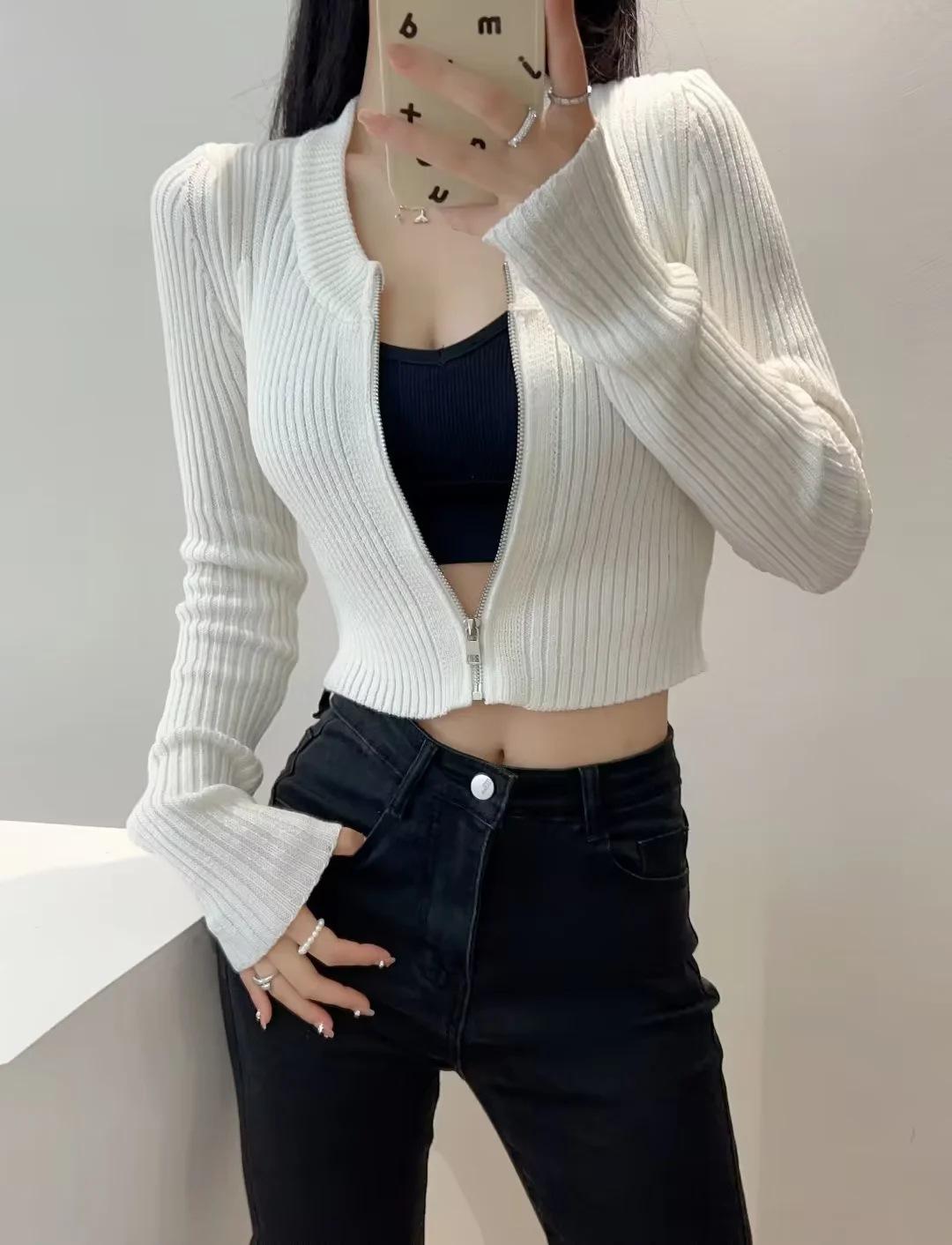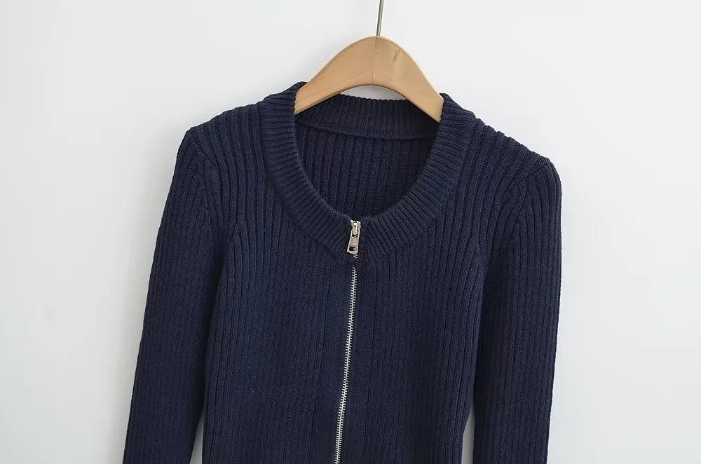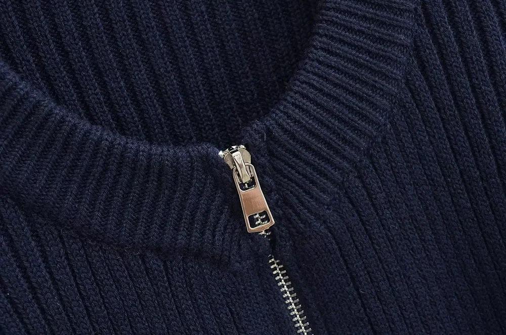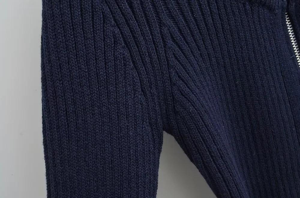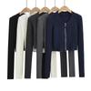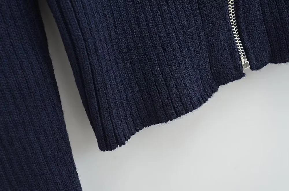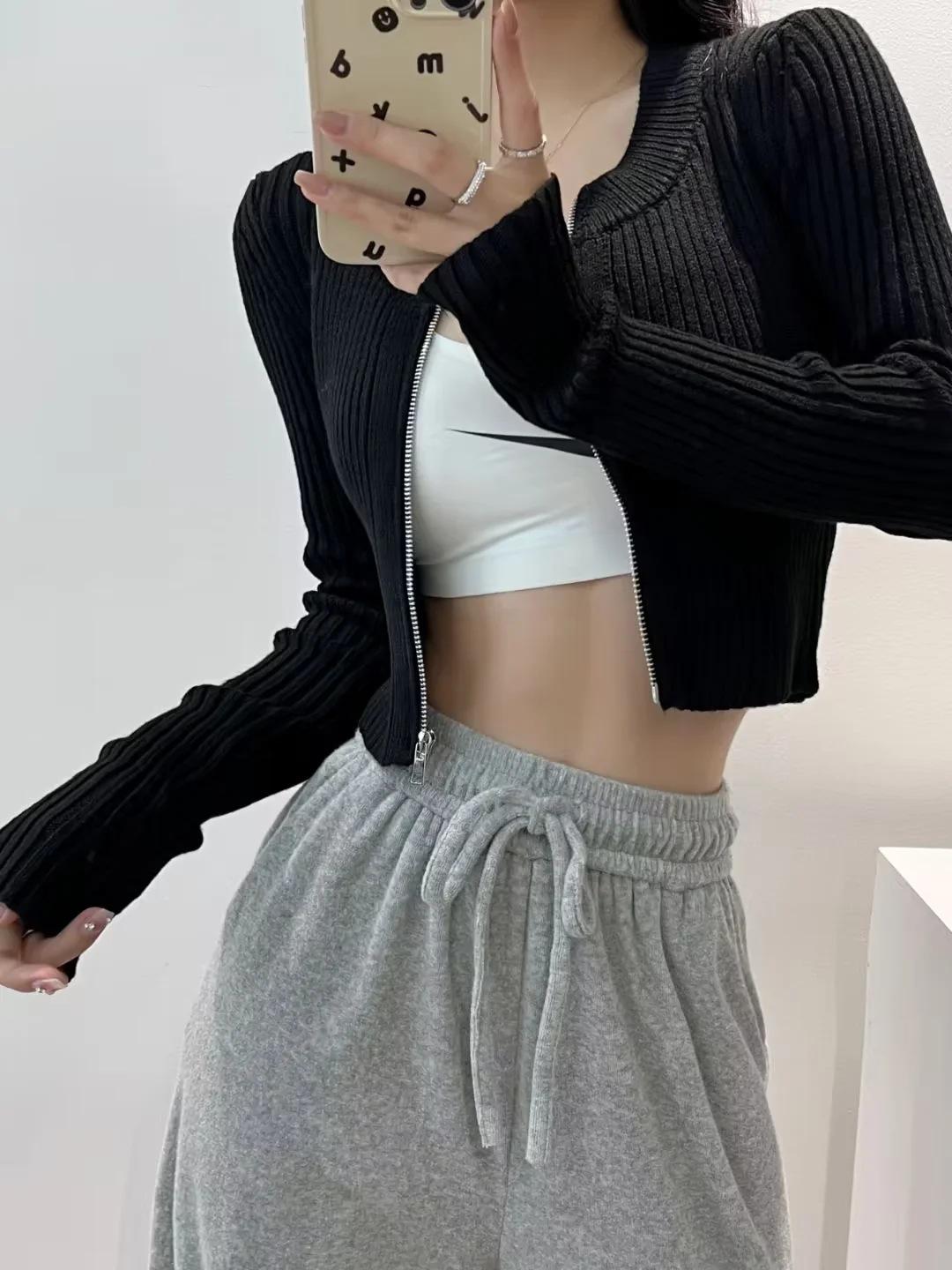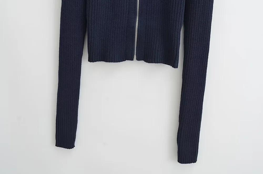 Nuevo Top Corto de Punto de Canalé Vertical de Cuello Redondo Europeo y Americano para Otoño e Invierno 2022 Trenzado Ajustado Adelgazante con Cierre de Cremallera Suéter de Punto