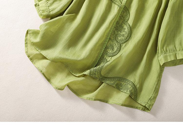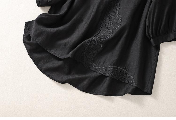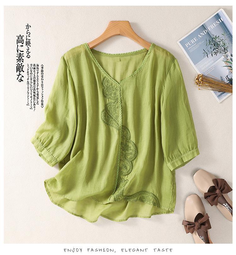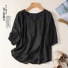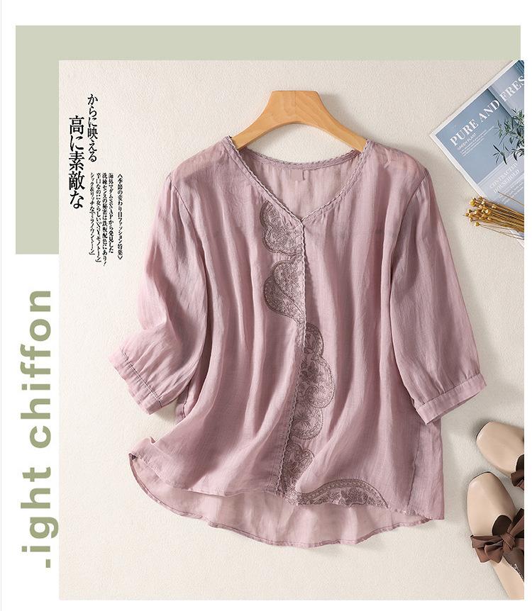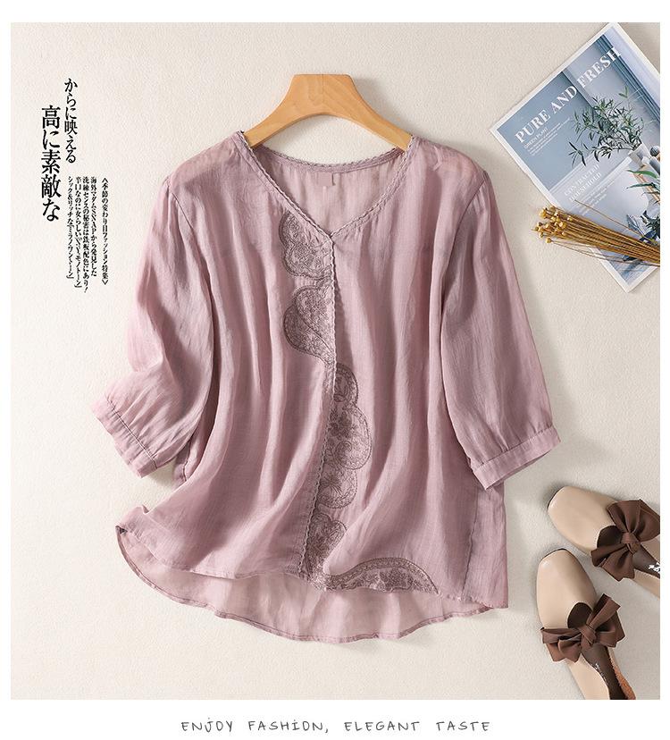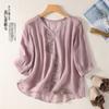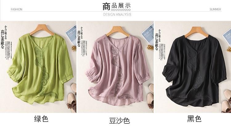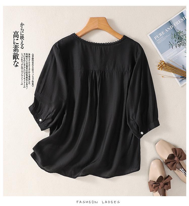 Camisa de algodón y lino bordada vintage de verano 2023 para mujer, holgada, adelgazante, con cuello en V, color liso, manga corta