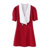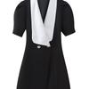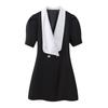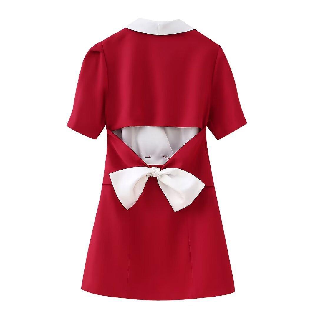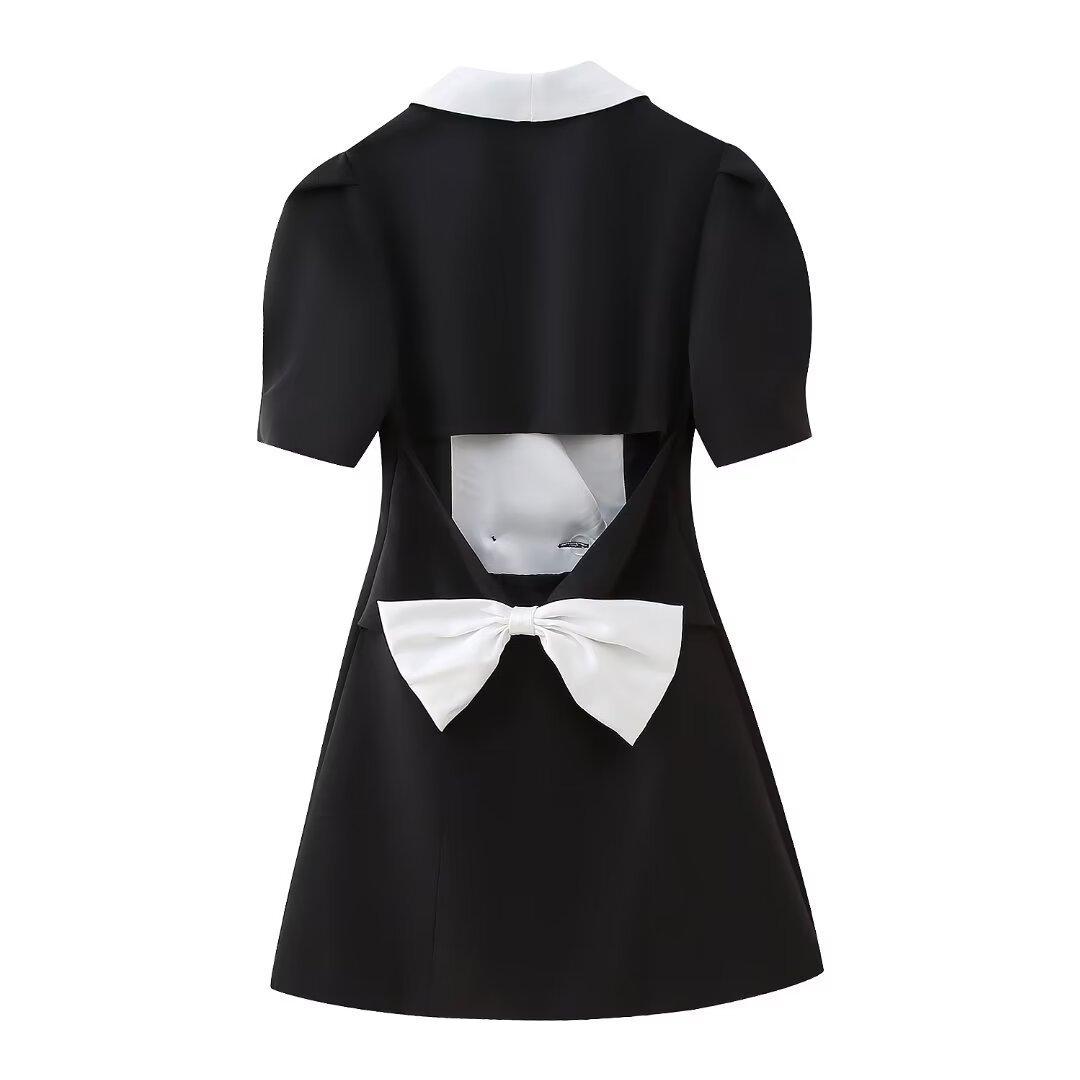 Traje estilo europeo y americano para mujer 2024 con solapa de color contrastante, espalda hueca, estilo traje, decoración de lazo, manga abullonada, vestido de cintura
