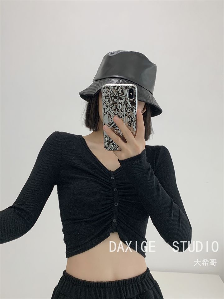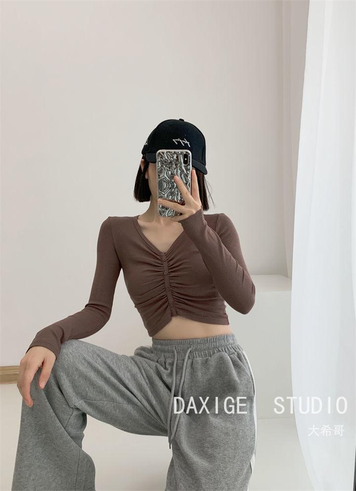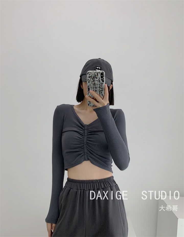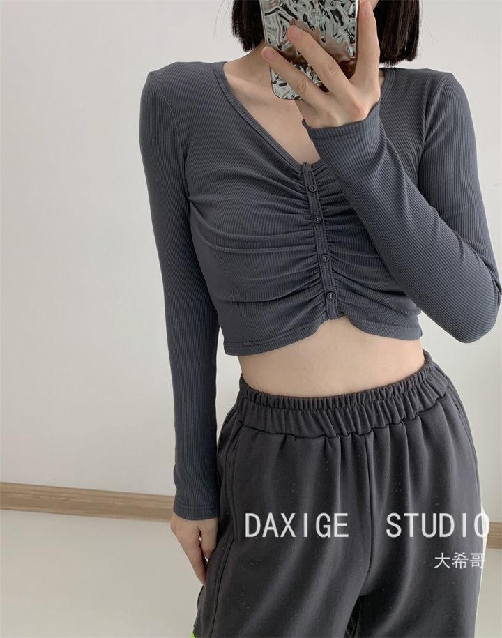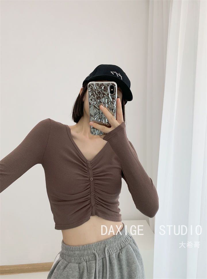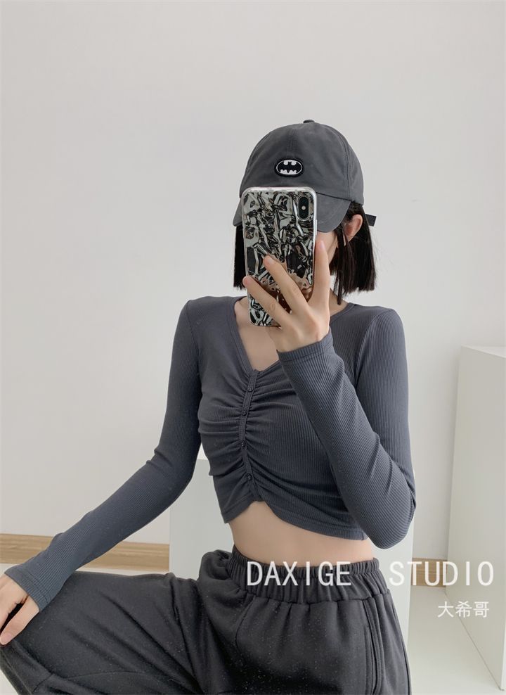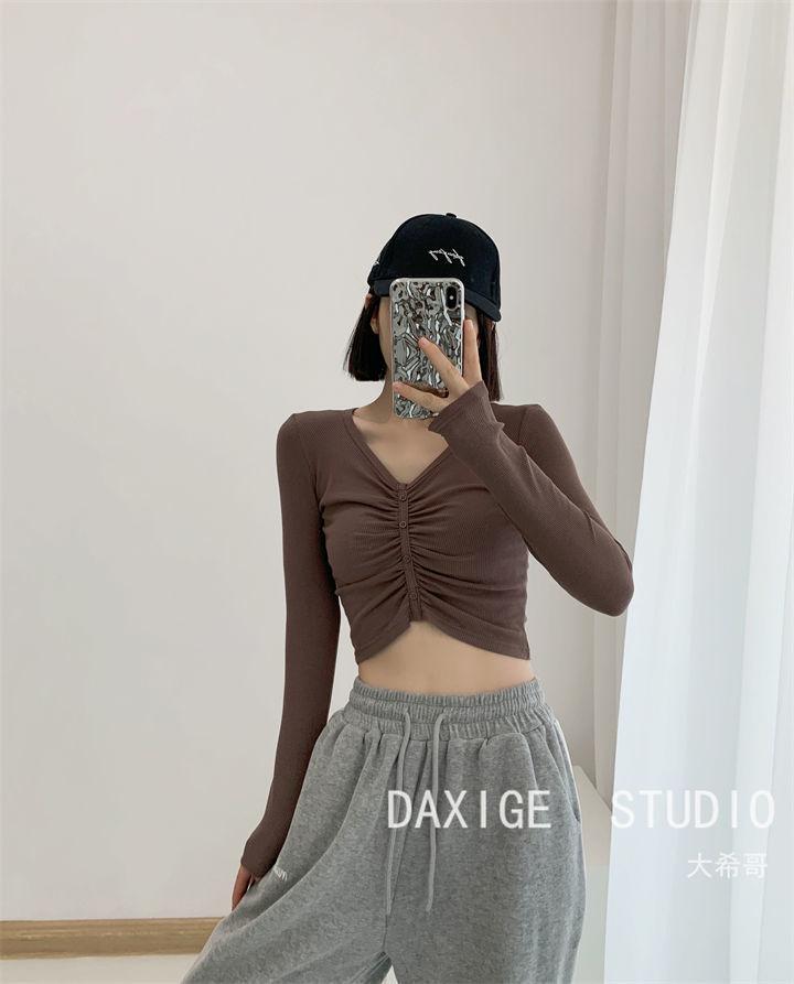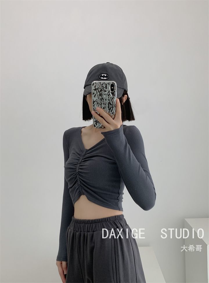 Camiseta corta plisada de diseño de nicho para mujer, de primavera y otoño, estilo urbano europeo y americano, ajustada, con escote en V y manga larga