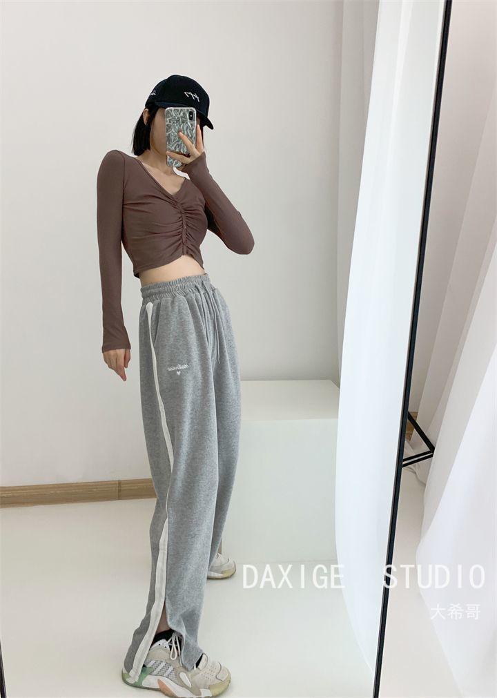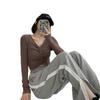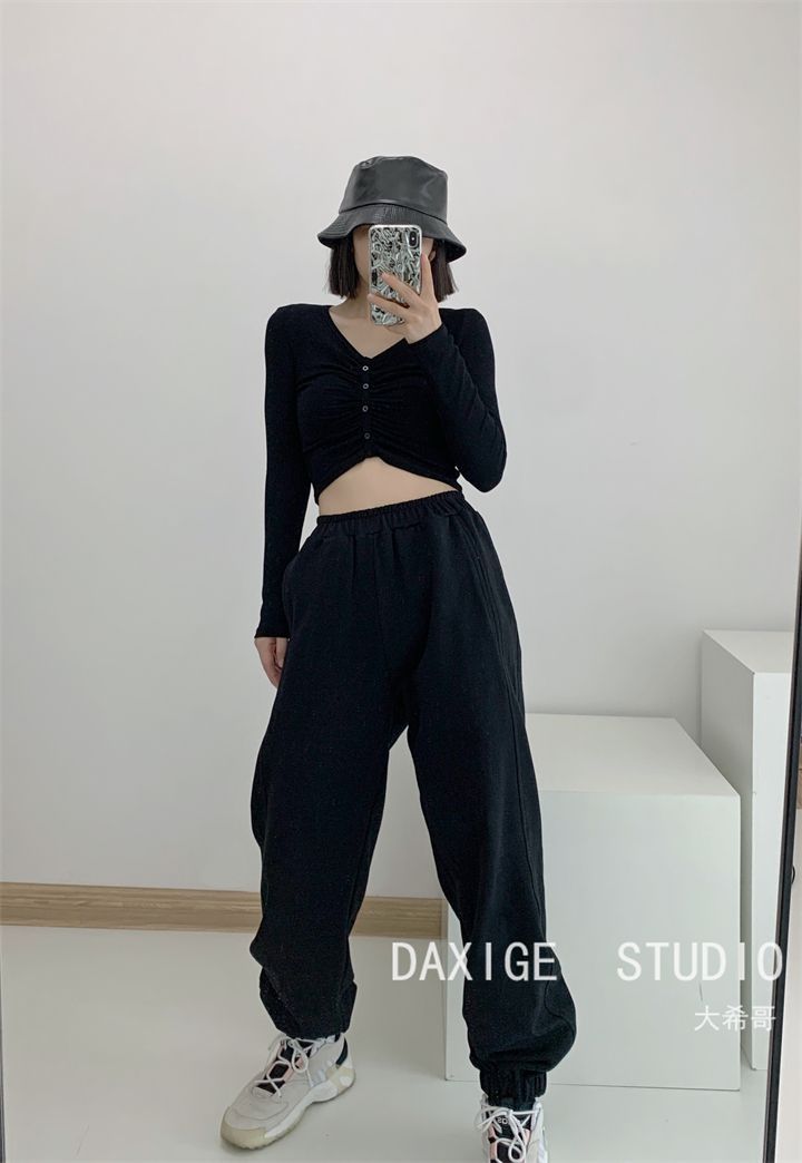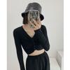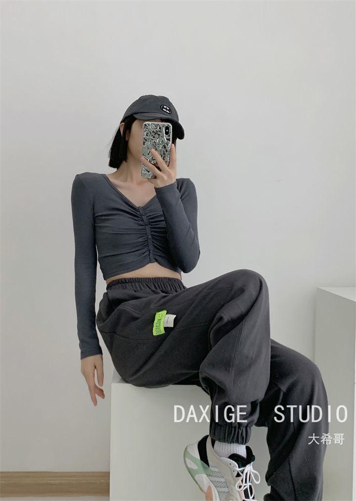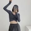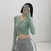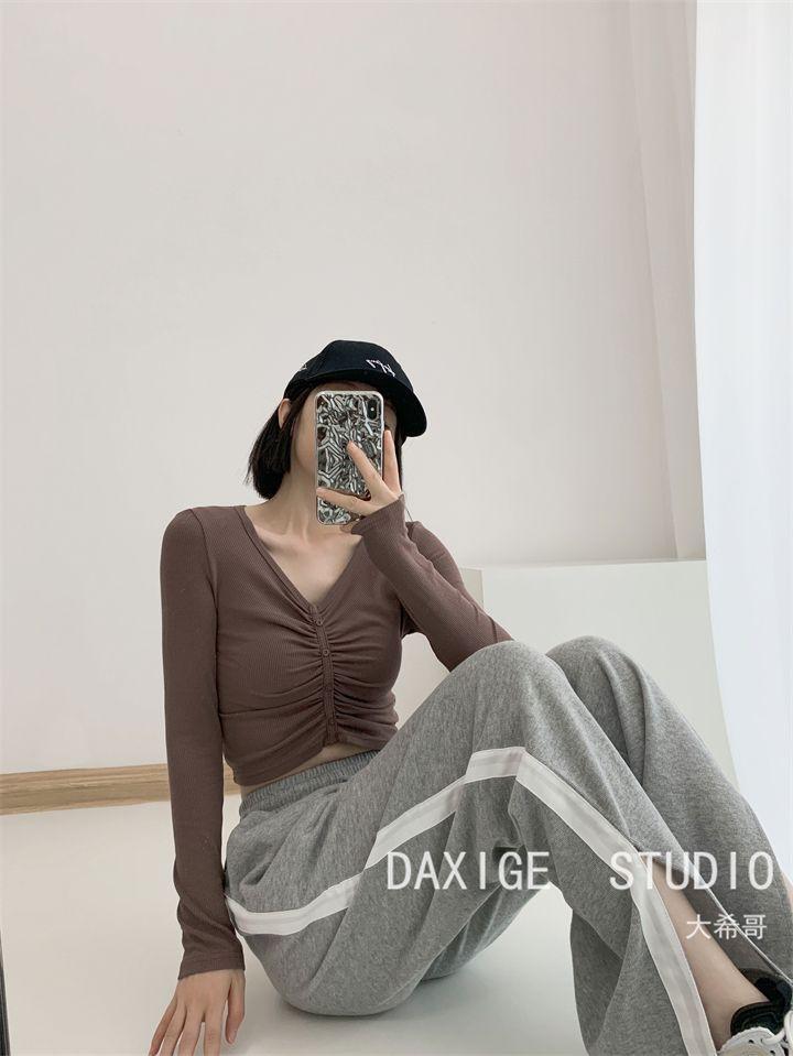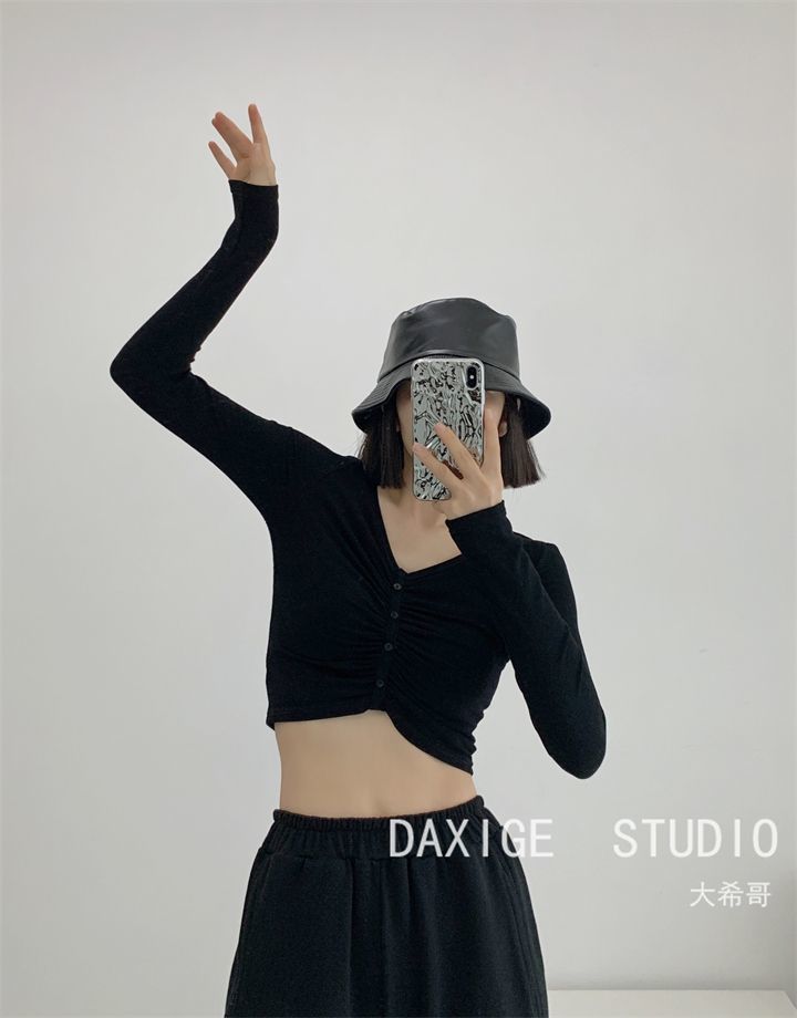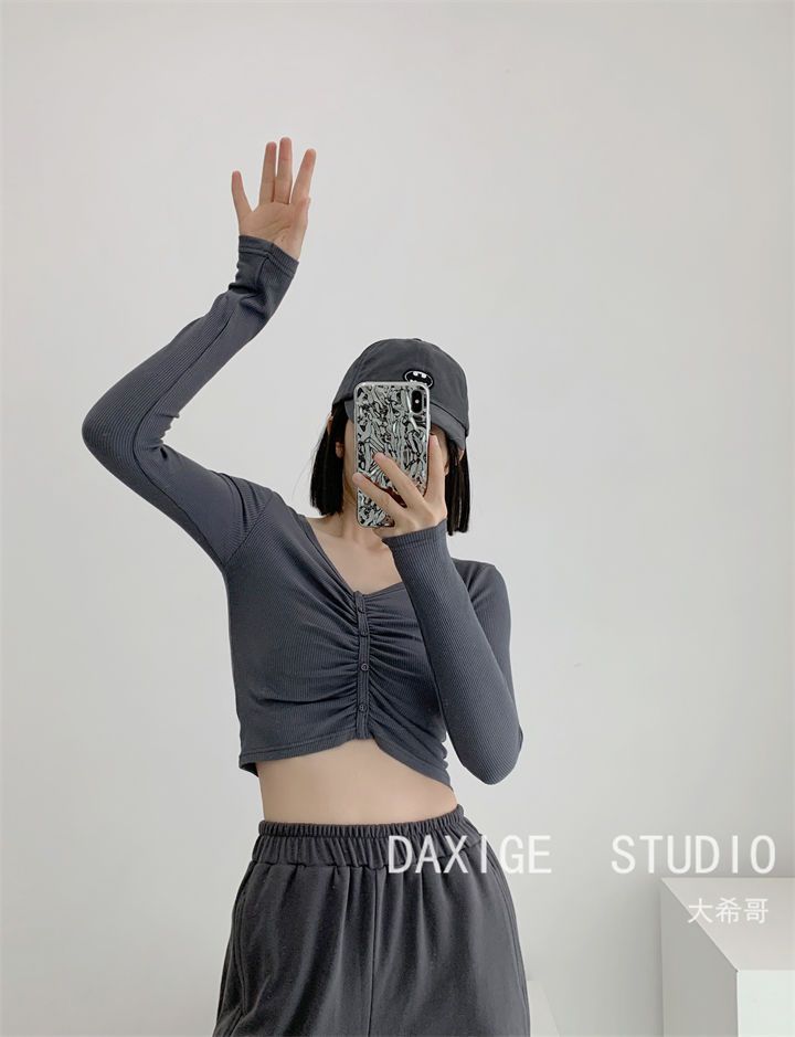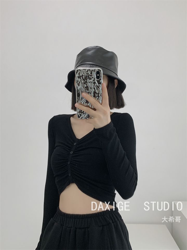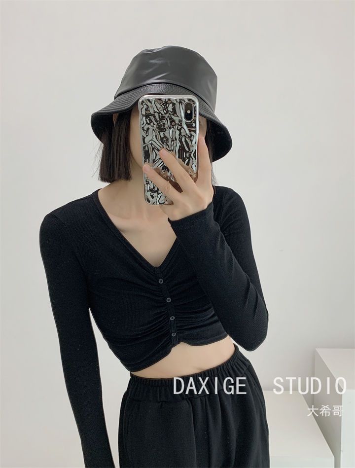 Camiseta corta plisada de diseño de nicho para mujer, de primavera y otoño, estilo urbano europeo y americano, ajustada, con escote en V y manga larga