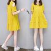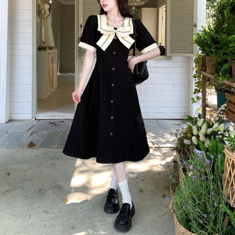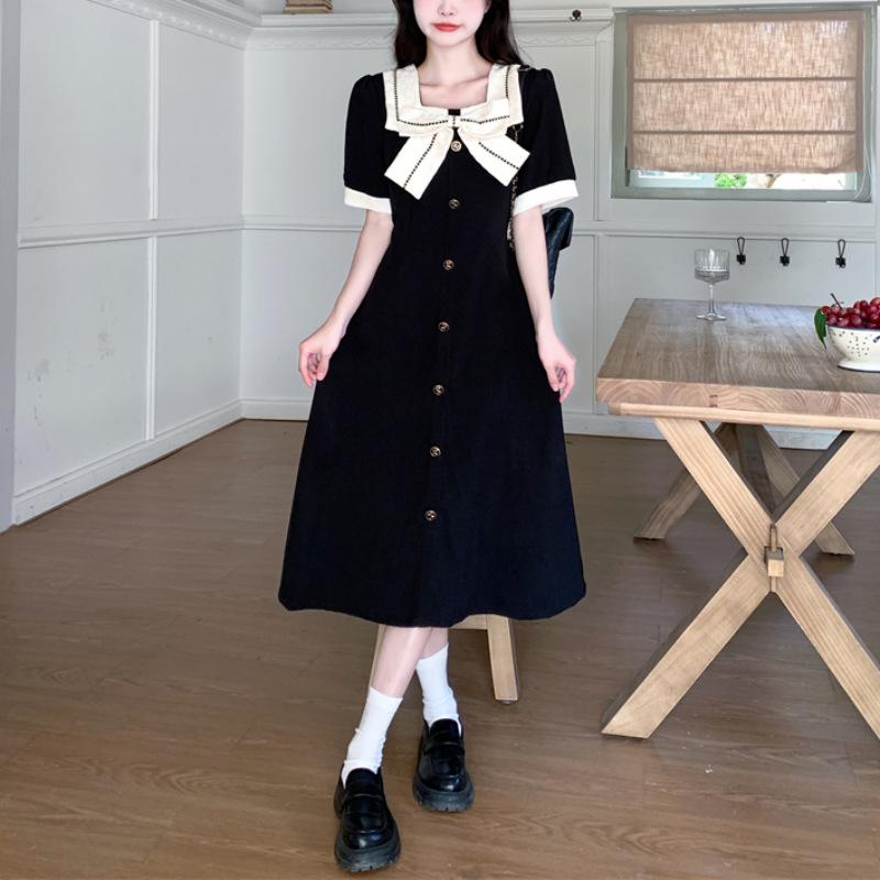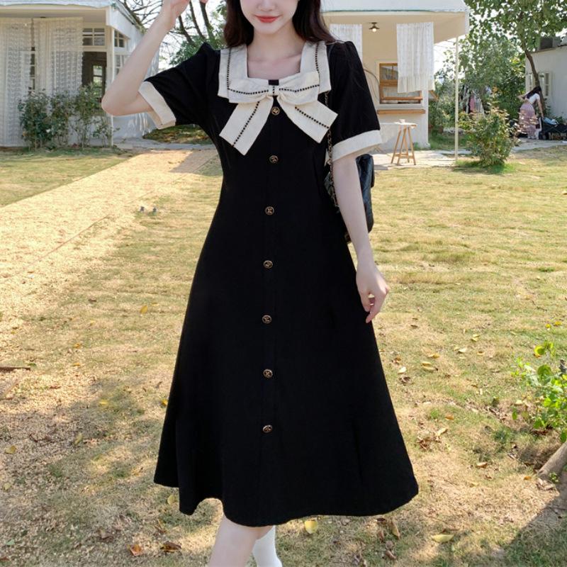 Vestido Casual y Elegante de Primavera/Verano de Talla Grande de Cintura Alta con Lazo y Escote Cuadrado de Manga Corta para Mujer, Estilo Coreano
