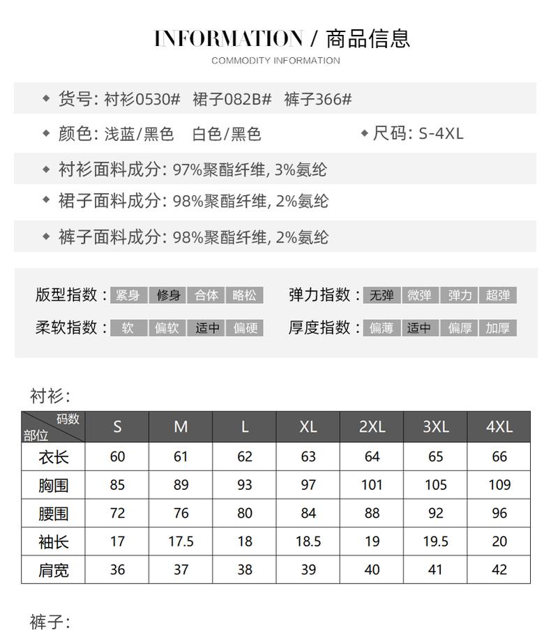 White shirt, Blue shirt, Black Flared Pants 366, Black Dress 082B