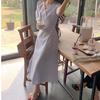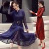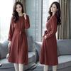 Vestido plisado de longitud media con cintura ajustada elegante de manga larga estilo coreano para mujer, primavera y otoño, con costuras de encaje.