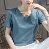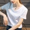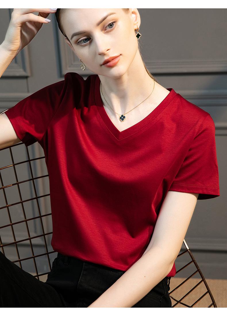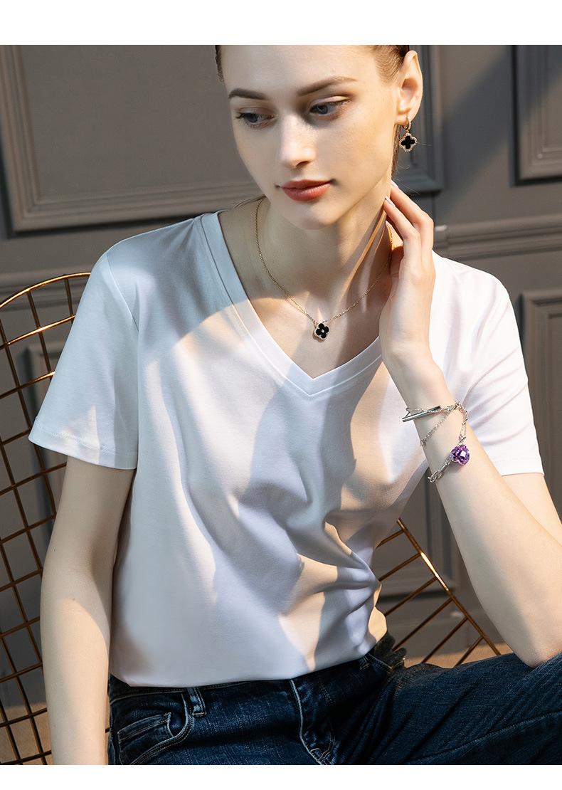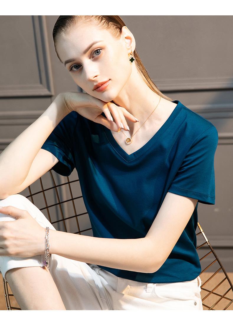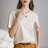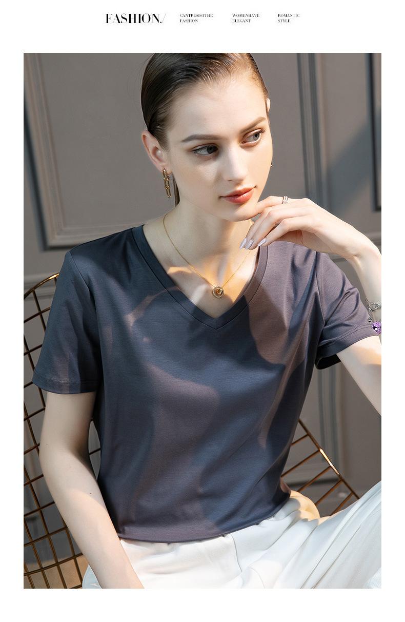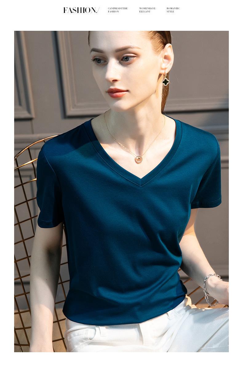 | | | | Camiseta de algodón mercerizado de seda morera de alto recuento para mujer, holgada, de cuello redondo, ajustada, de manga corta, con cuello en V, blanca para mujer | | |