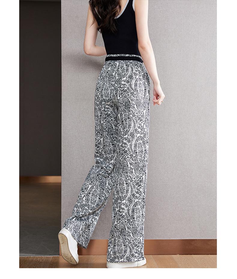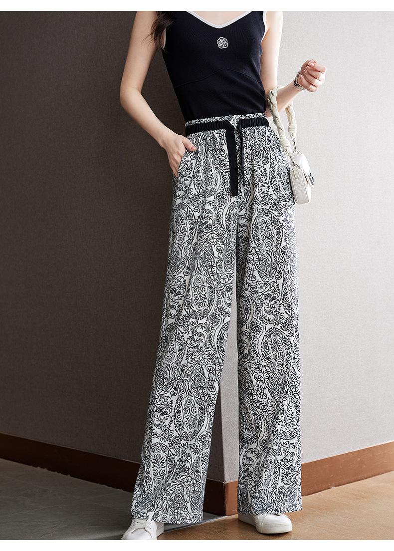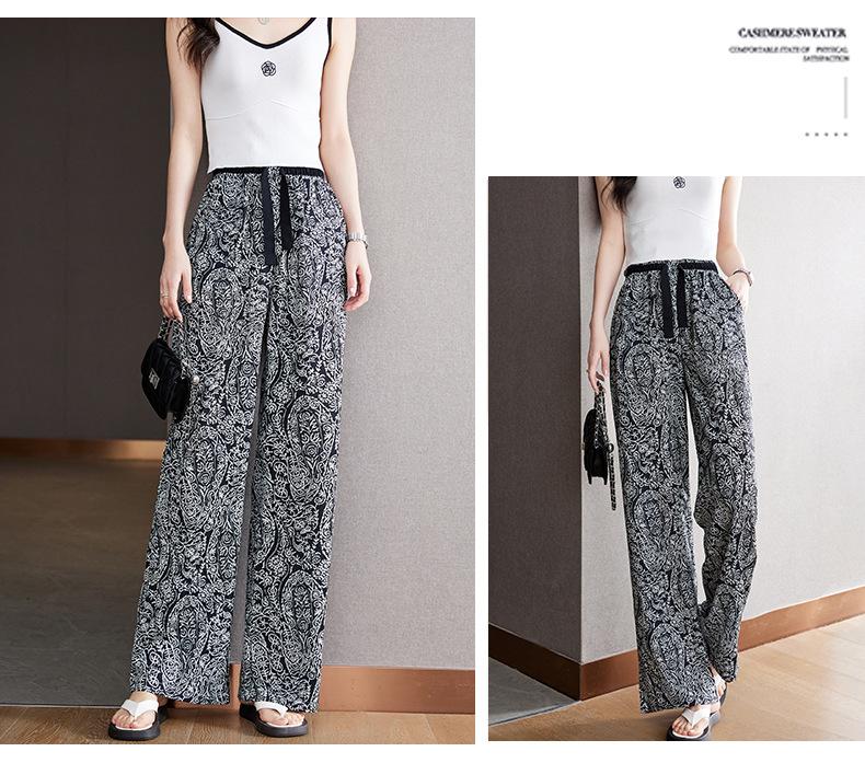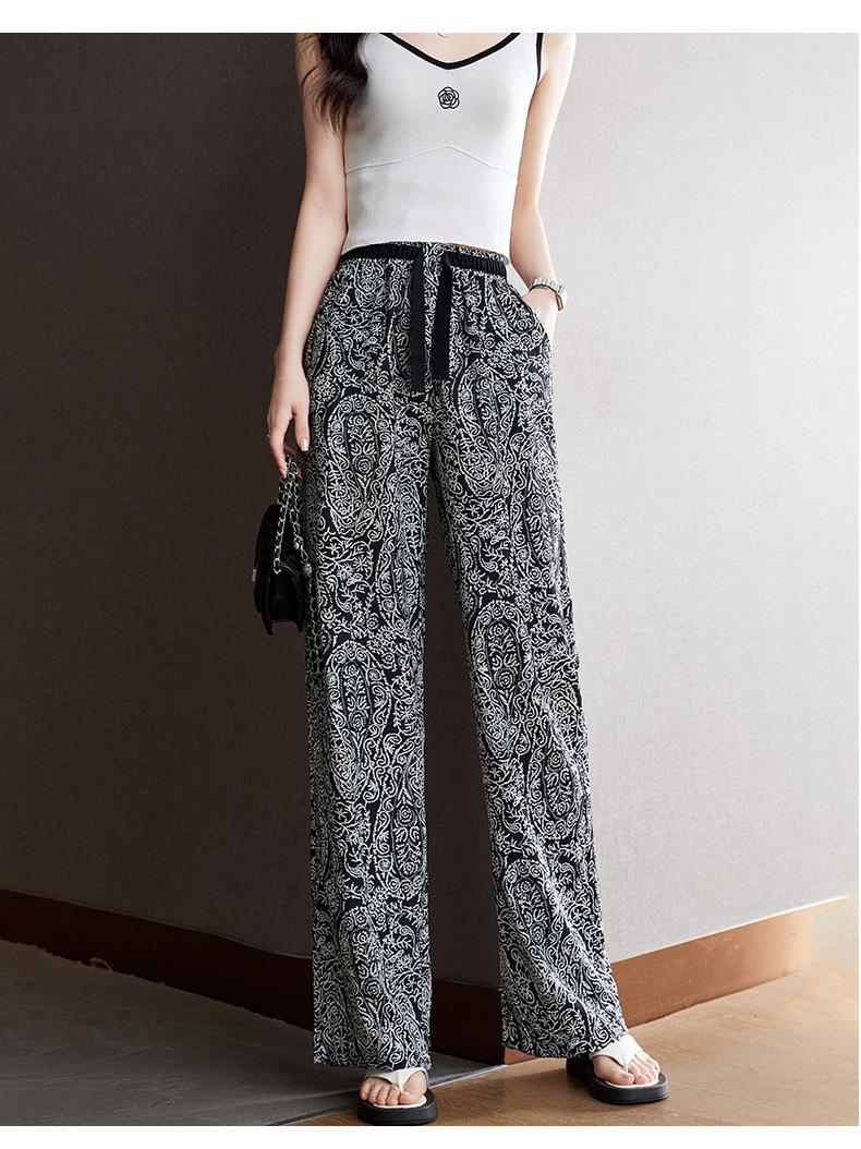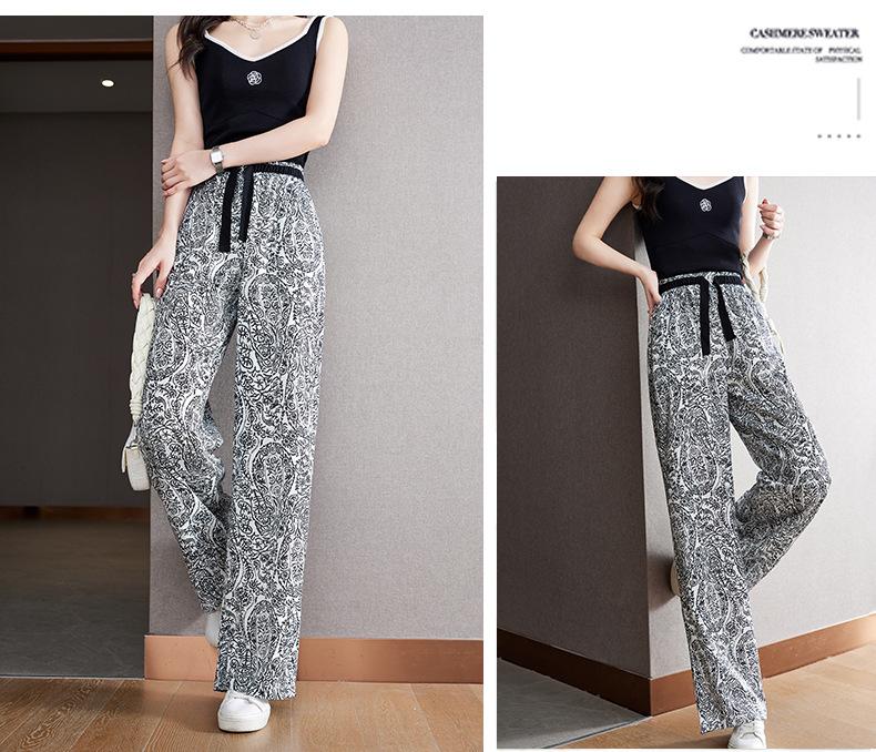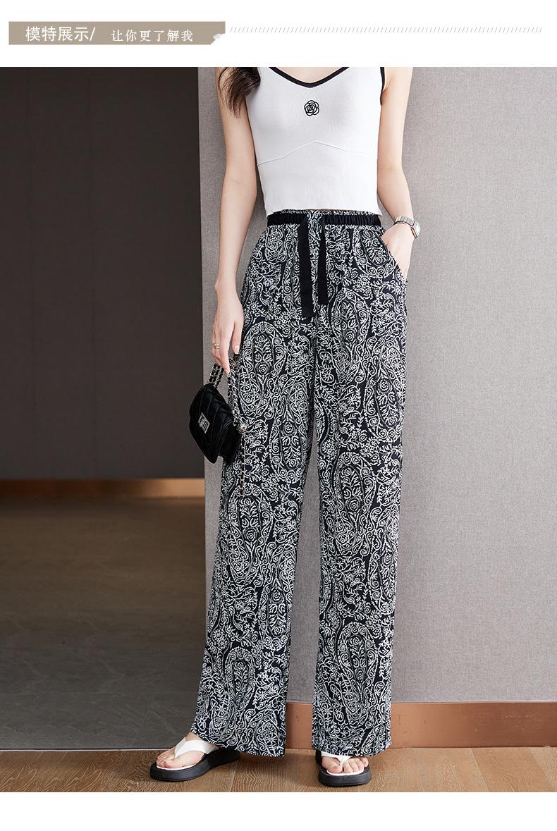 Pantalones de Pierna Ancha Rectos Slim de Cintura Alta de Seda de Hielo para Mujer Verano Nuevo Pantalones Florales Delgados Pantalones Drapeados Estampados de Moda