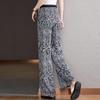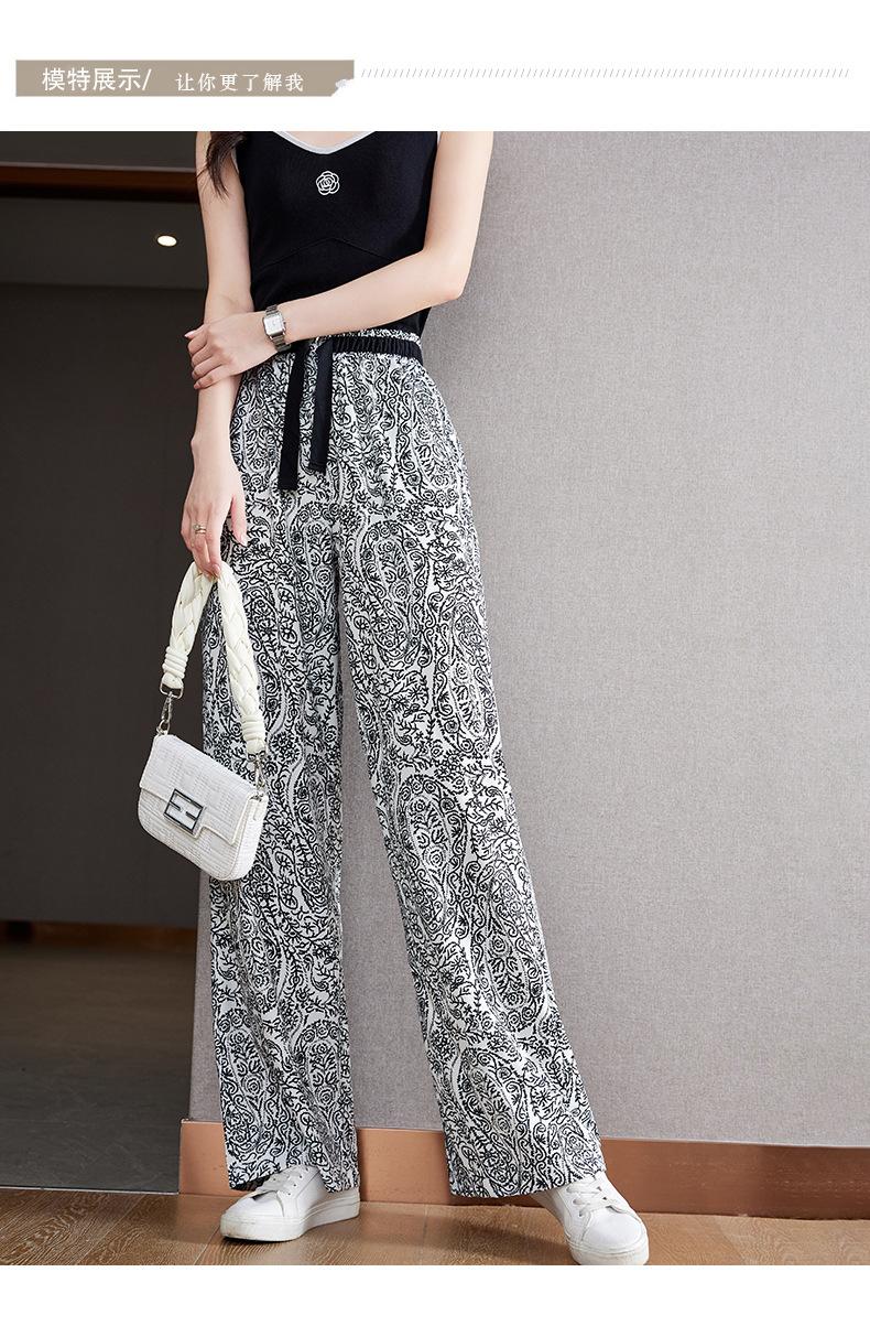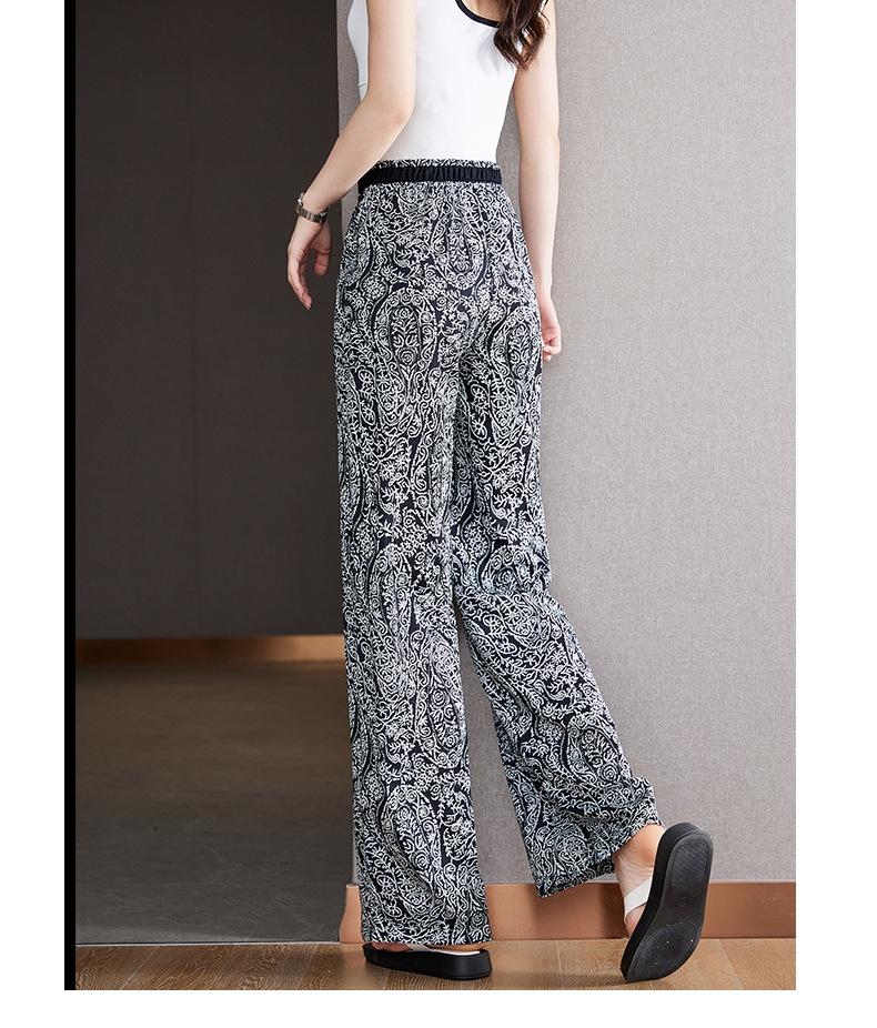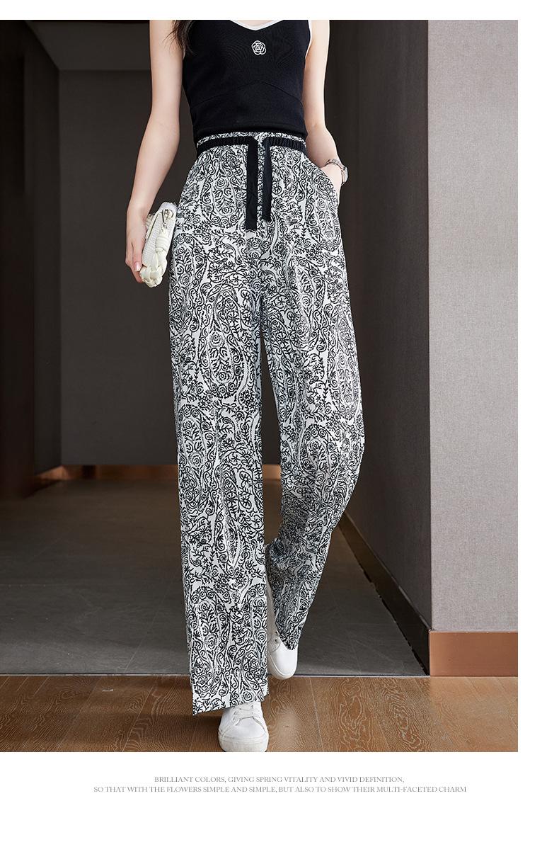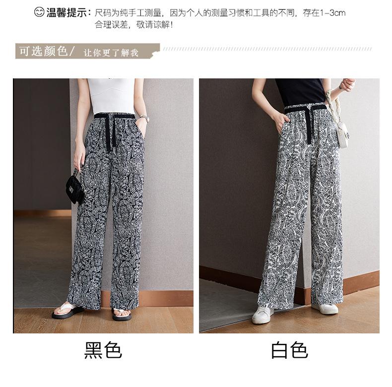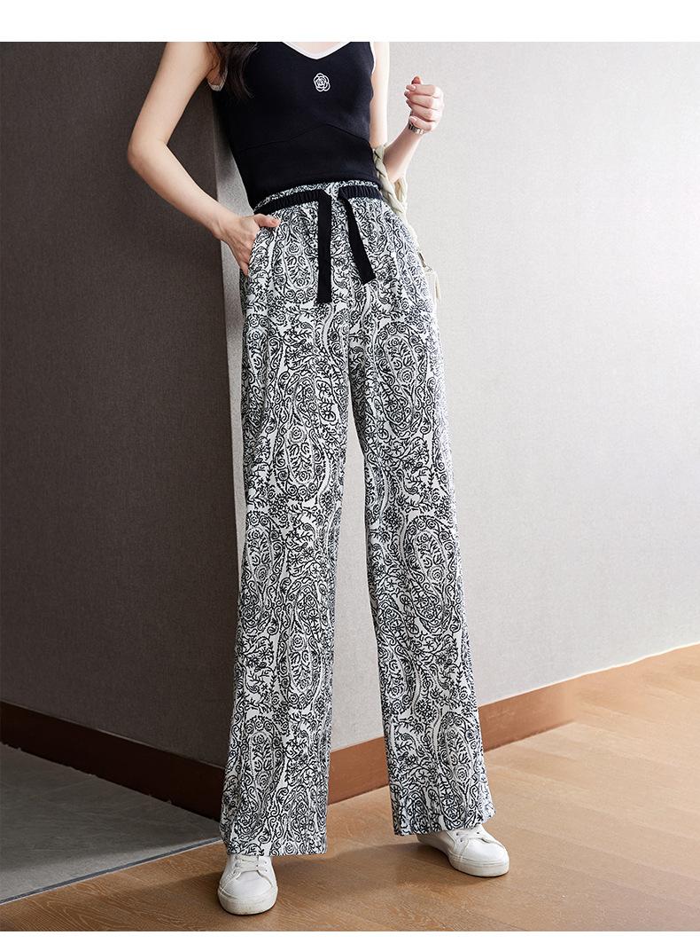 Pantalones de Pierna Ancha Rectos Slim de Cintura Alta de Seda de Hielo para Mujer Verano Nuevo Pantalones Florales Delgados Pantalones Drapeados Estampados de Moda