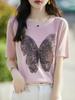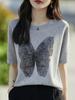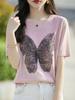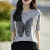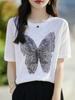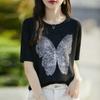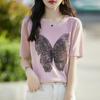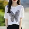 Compra Camiseta de Manga Corta Slub para Mujer 2024 Nuevo Verano Suelta Combinable Jacquard de Mariposas Hot Drilling Cuello Redondo Camiseta Fina de Manga Corta al por mayor en Joom.pro