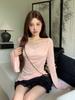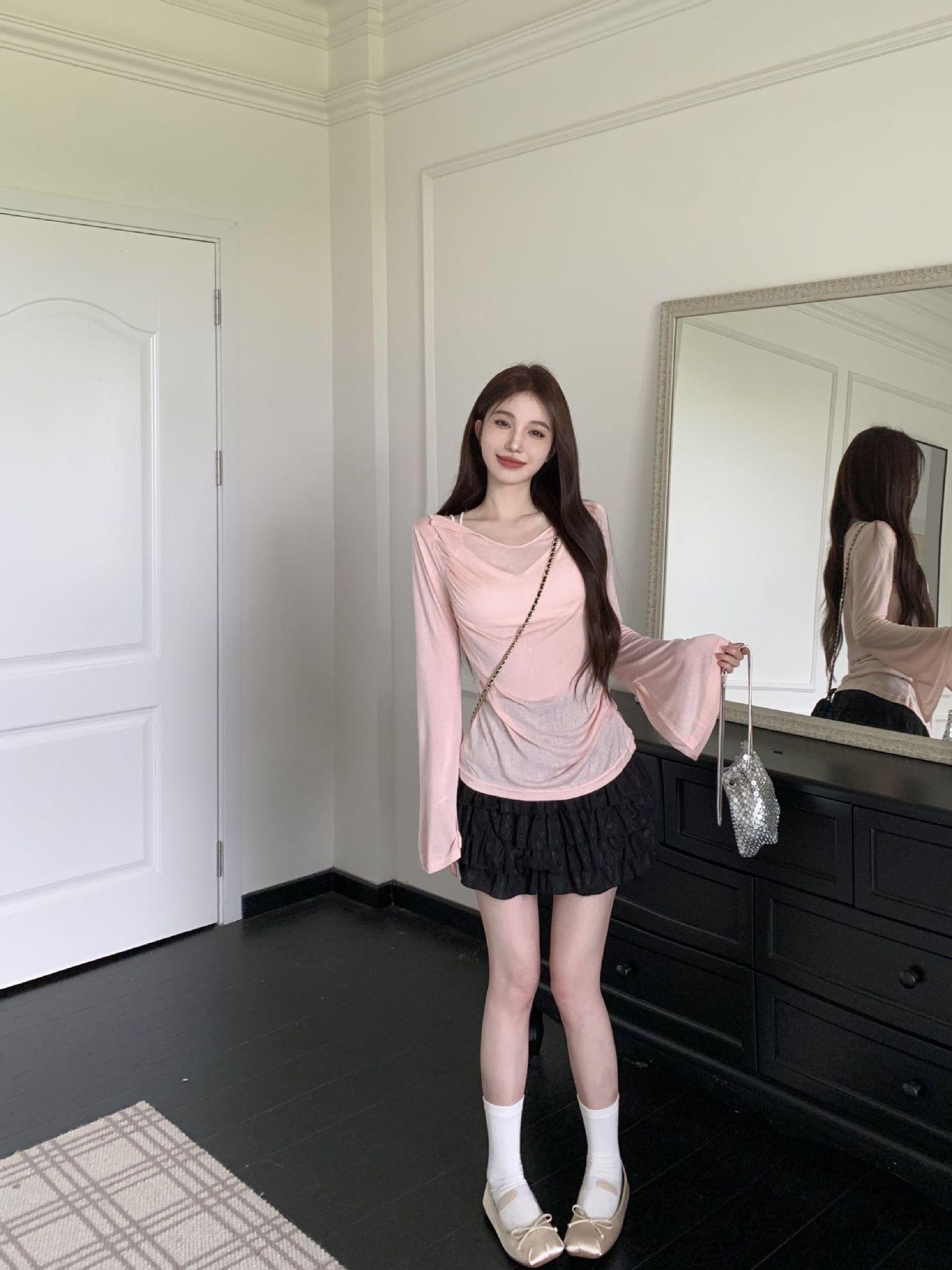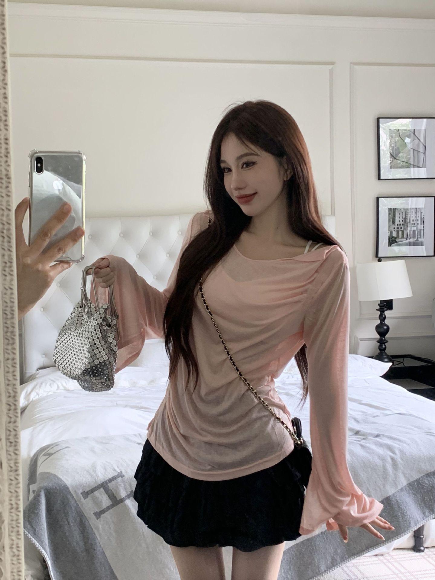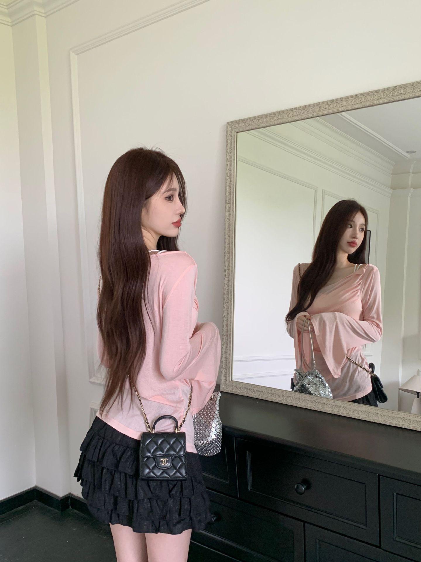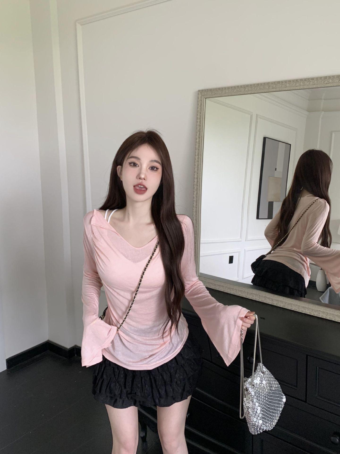 Blusa elegante de manga larga con cuello en V y protector solar en color rosa para mujer, diseño Sense Niche, top adelgazante fino de verano.