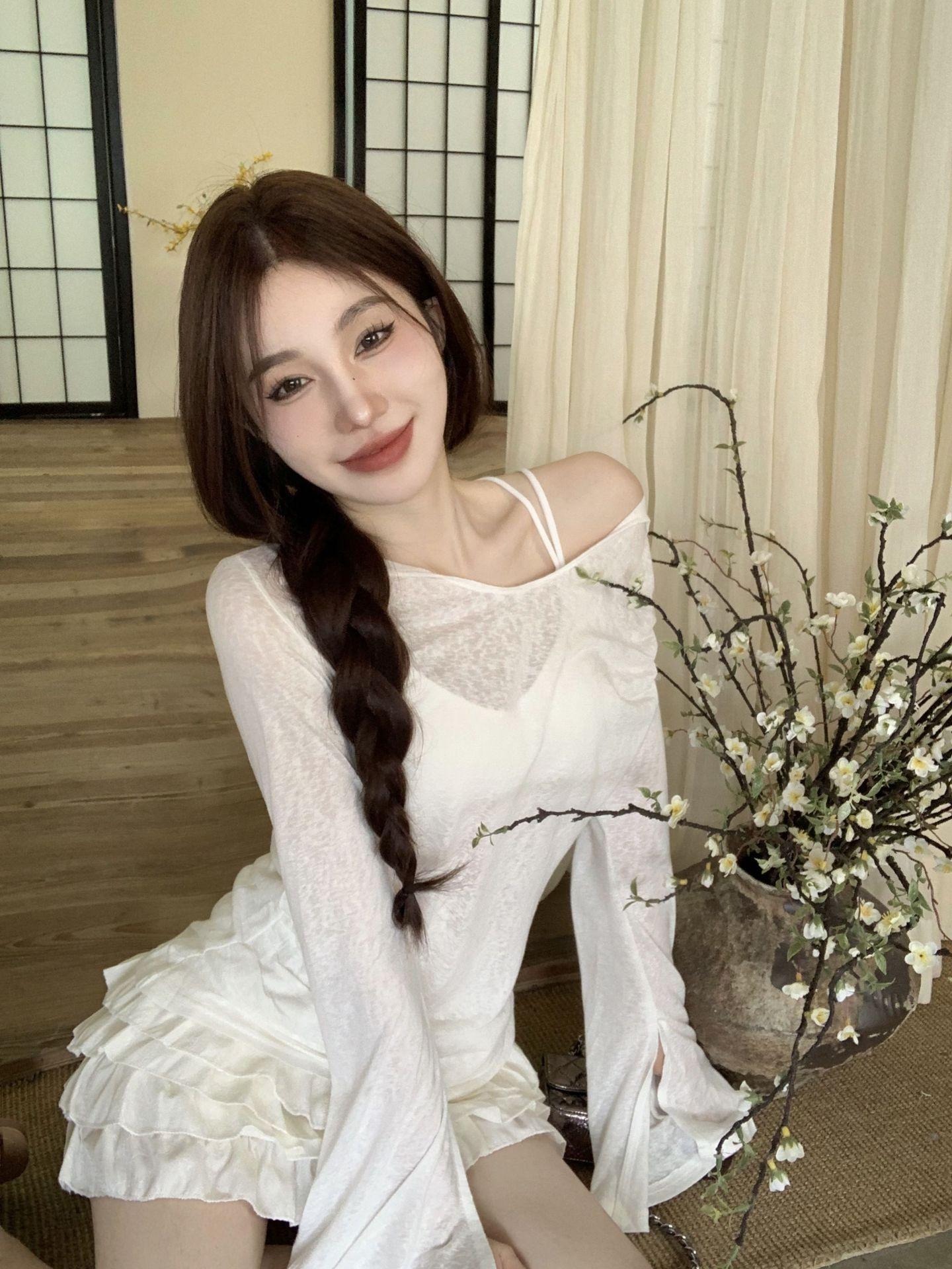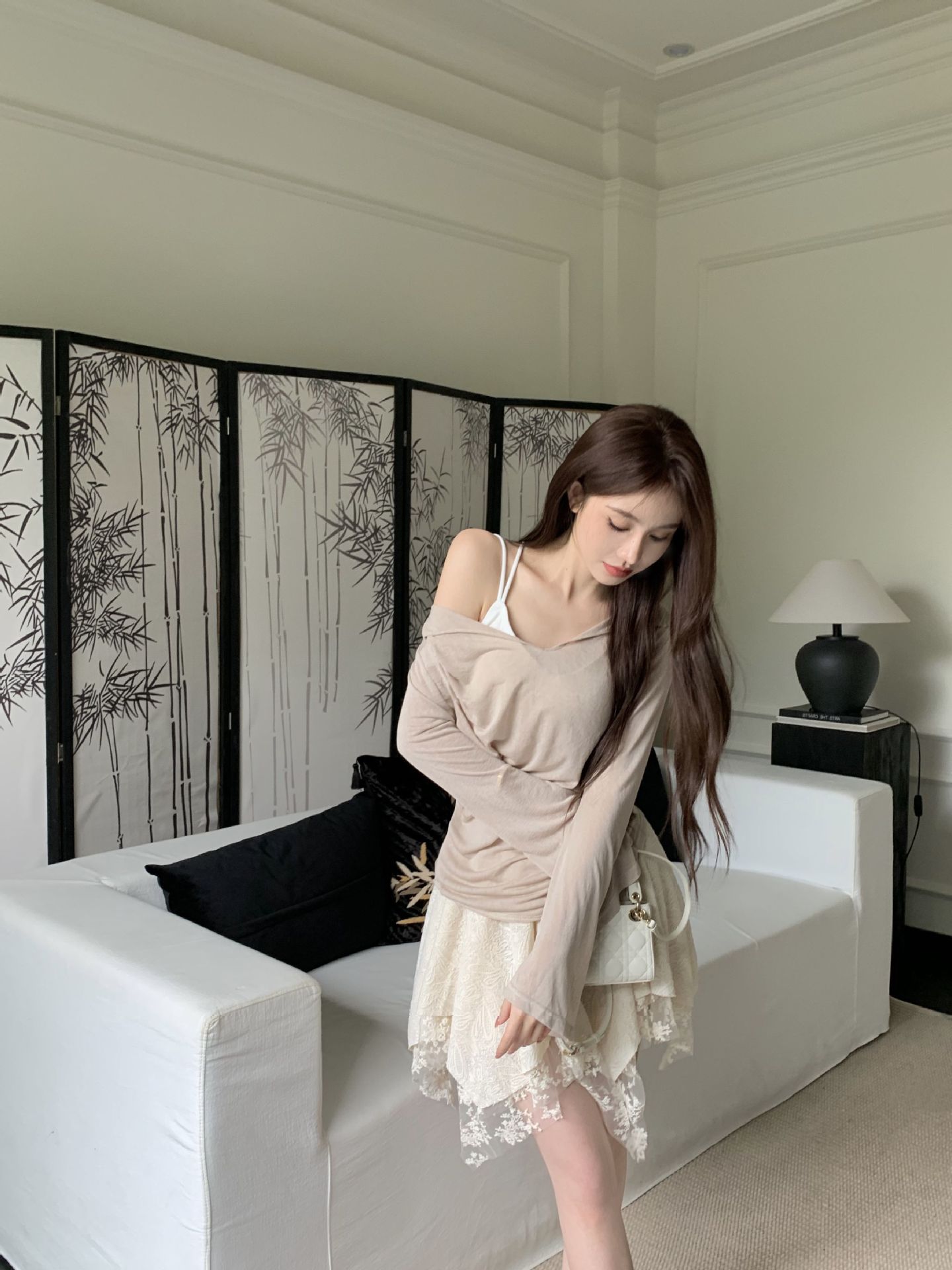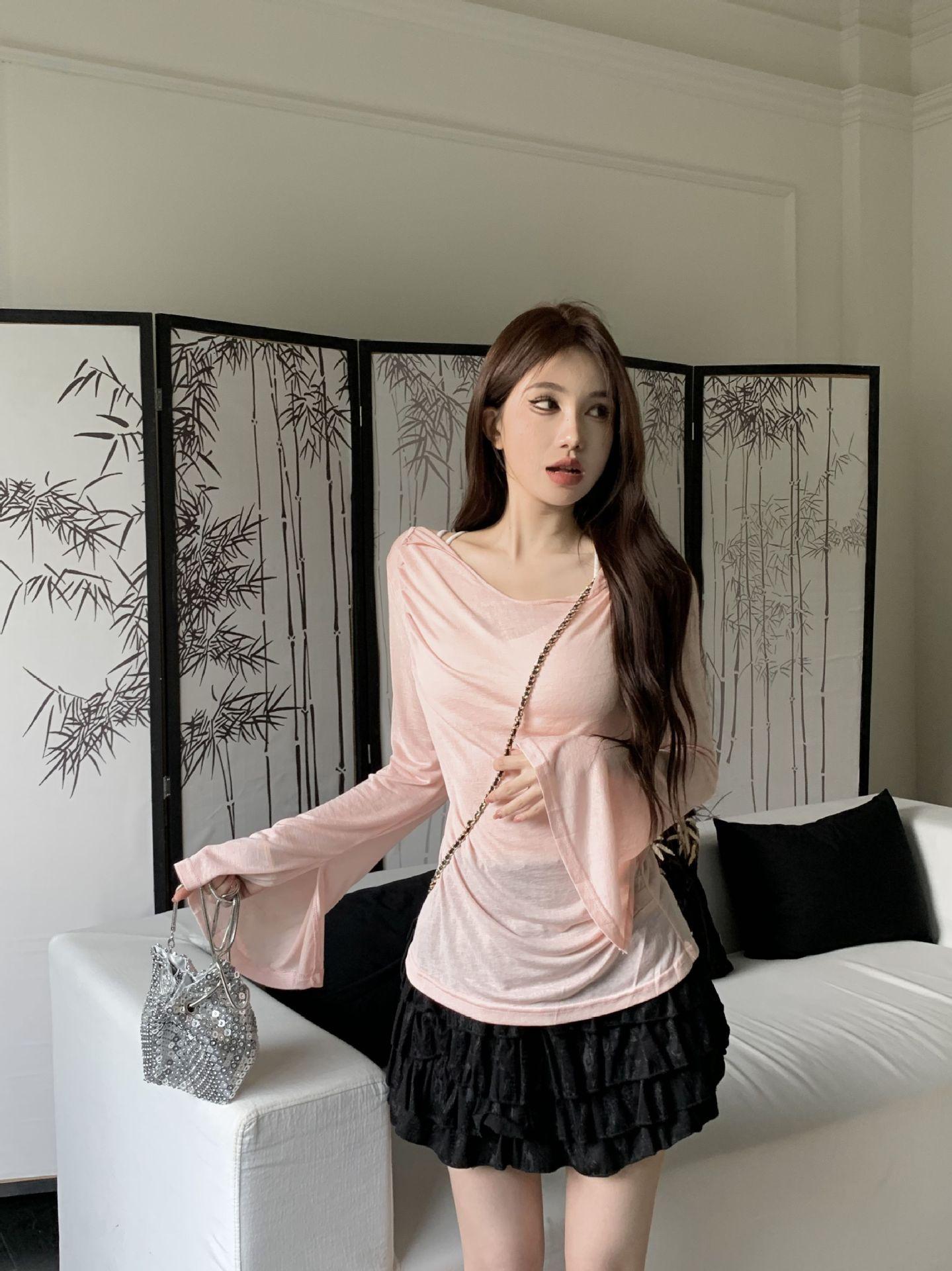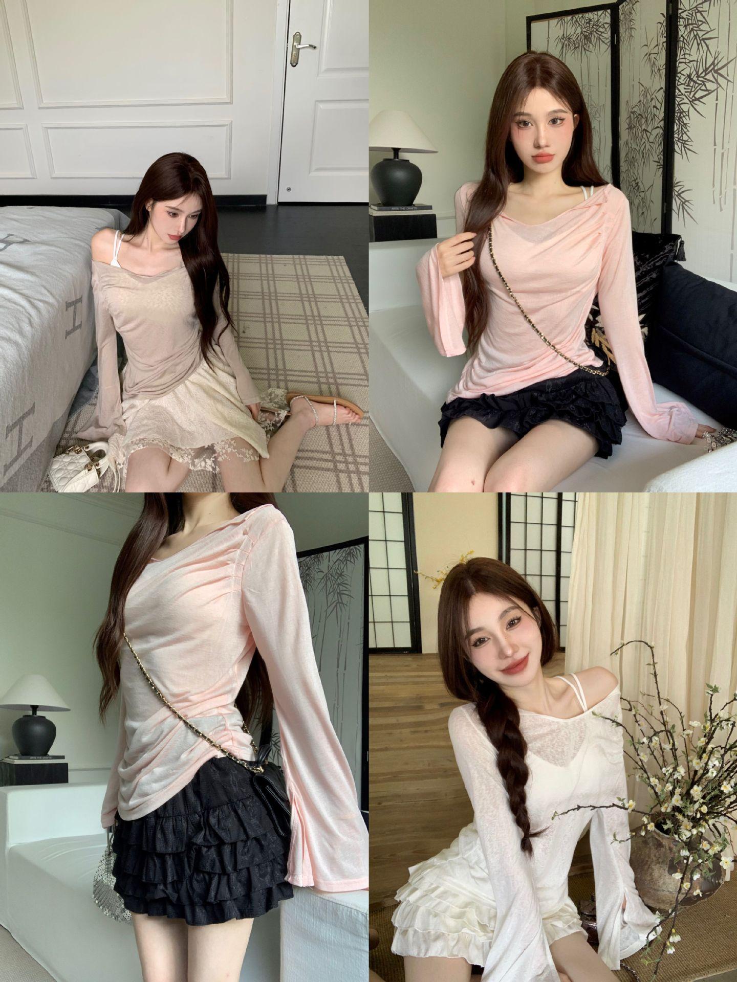 Blusa elegante de manga larga con cuello en V y protector solar en color rosa para mujer, diseño Sense Niche, top adelgazante fino de verano.