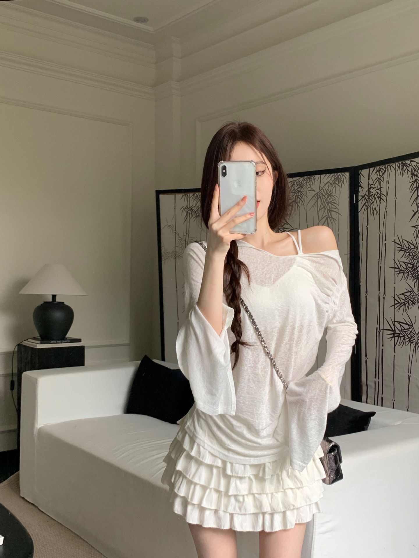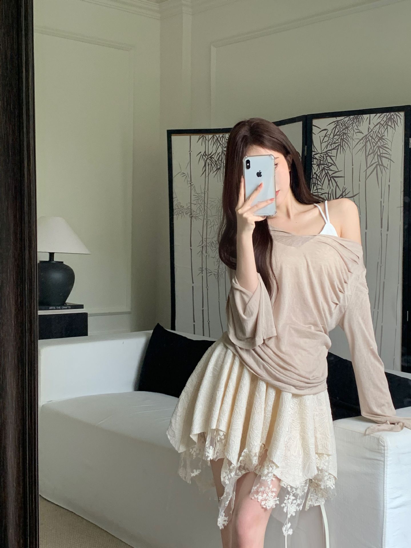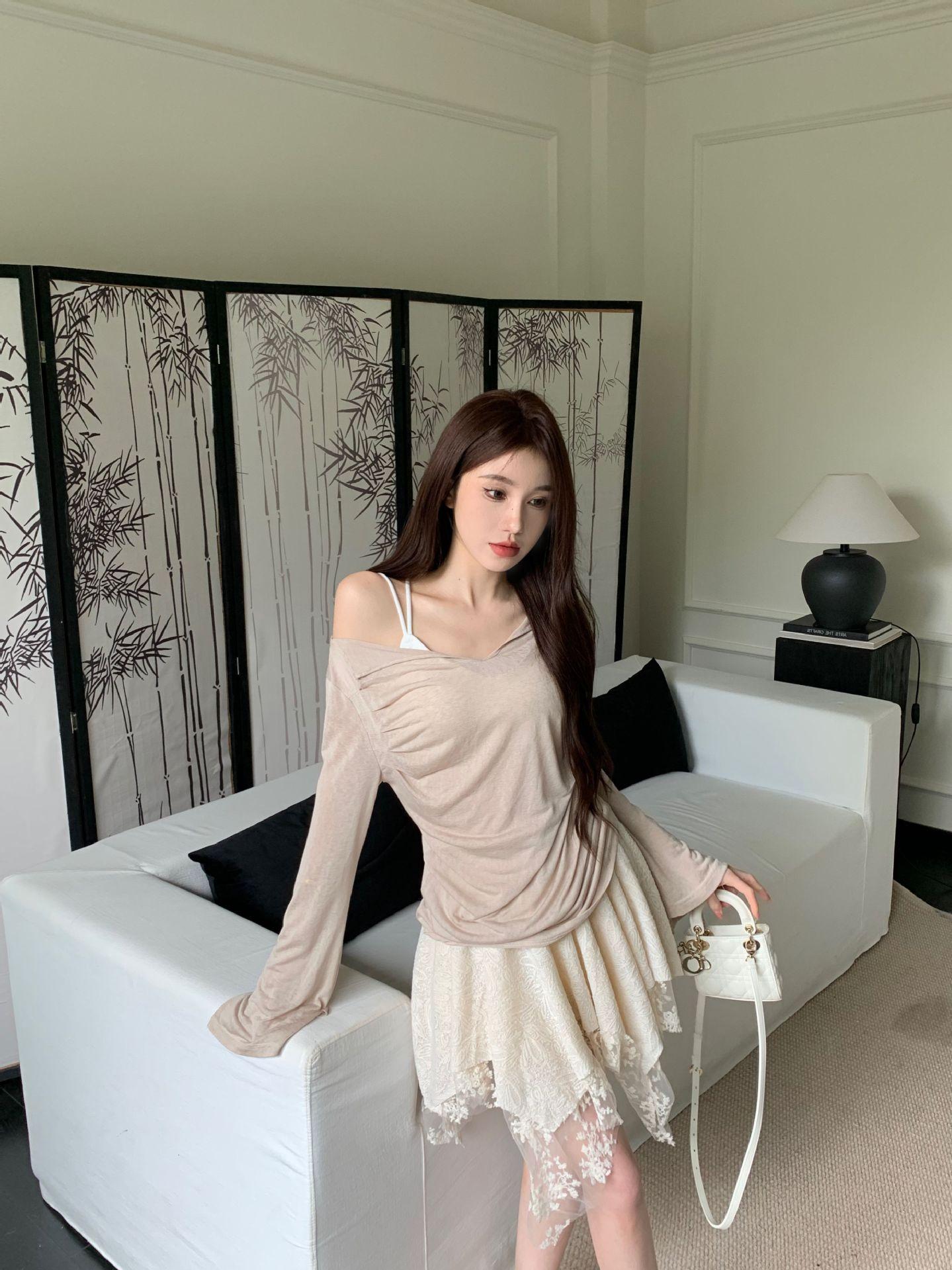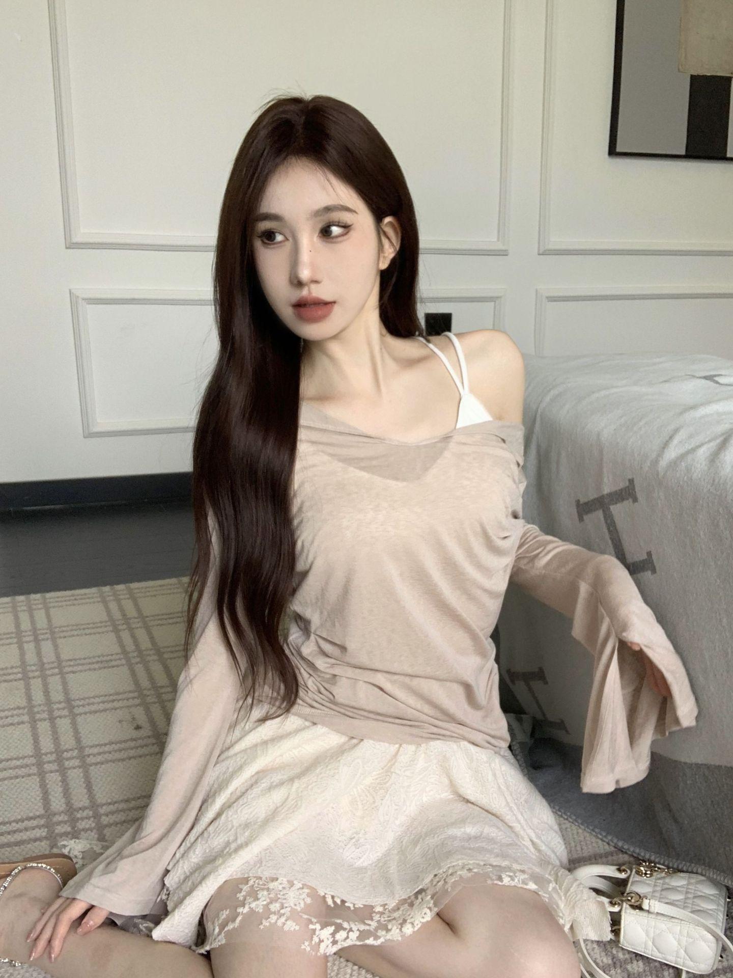 Blusa elegante de manga larga con cuello en V y protector solar en color rosa para mujer, diseño Sense Niche, top adelgazante fino de verano.