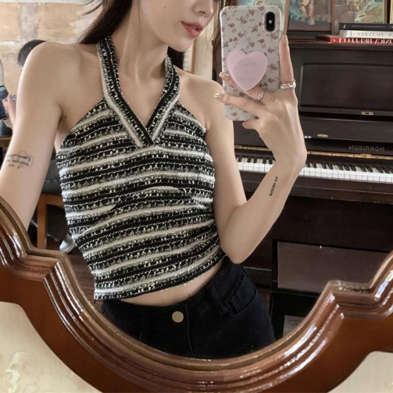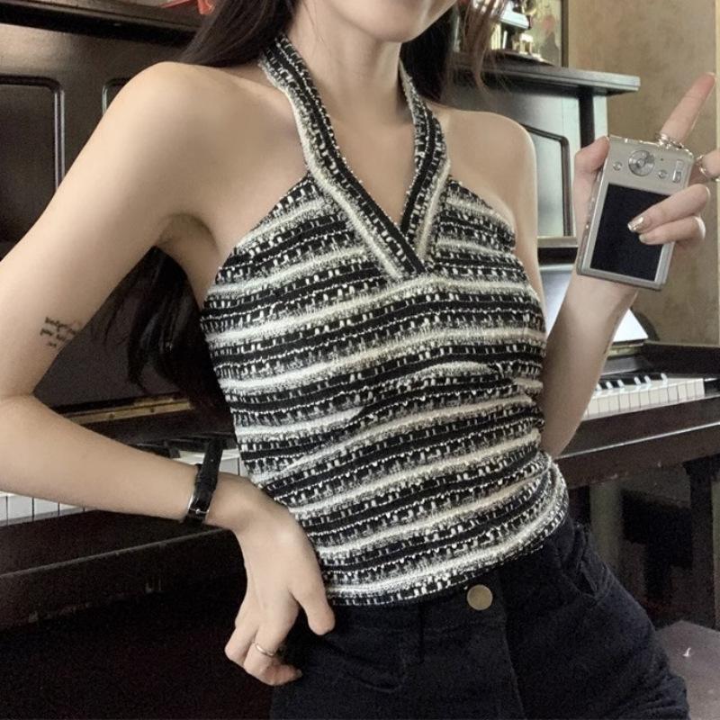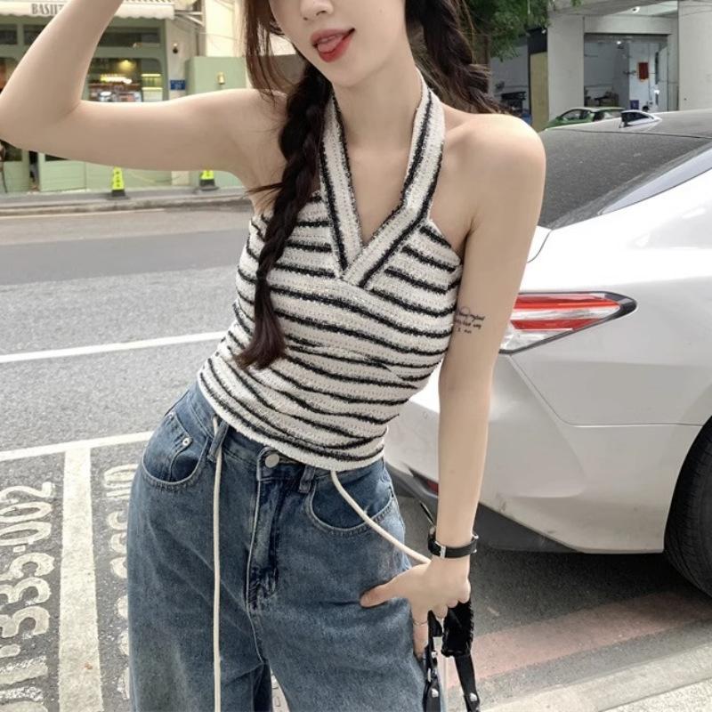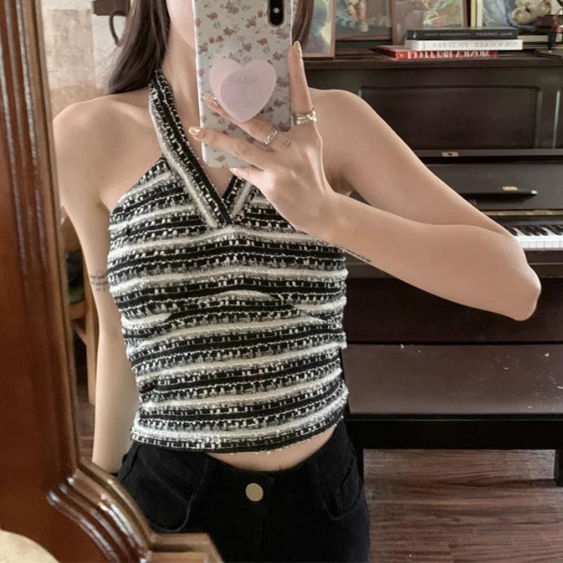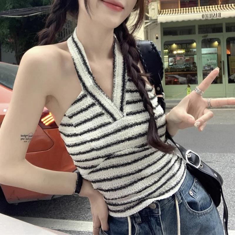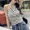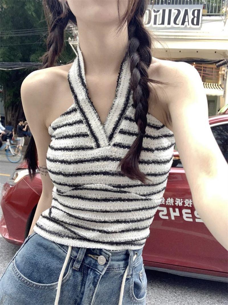 Chaleco de cuello a rayas para chica sexy, tirantes pequeños, ropa interior de verano para mujer, top francés corto ajustado con hombros descubiertos